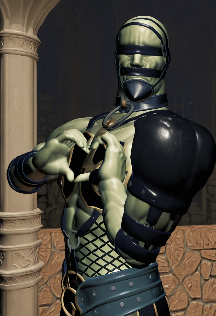 voldosbps1, toned male, armor, harness, fishnets, necklace, belt, mask