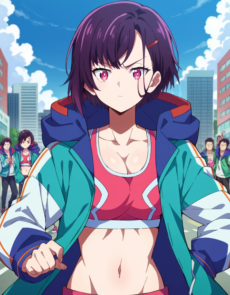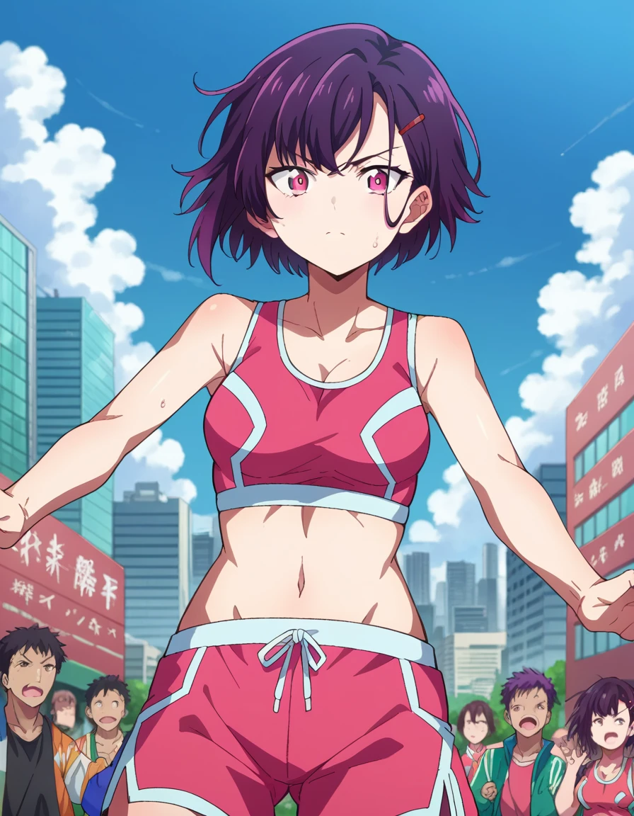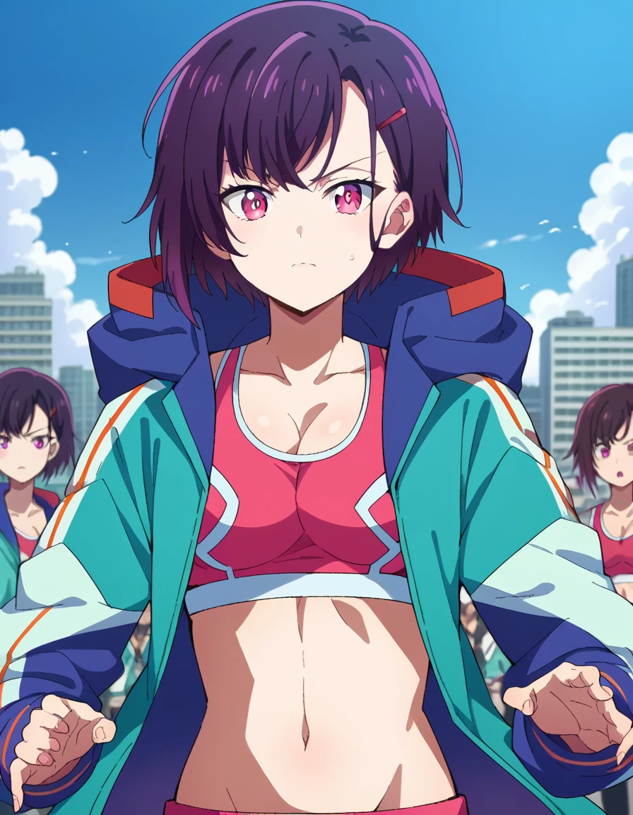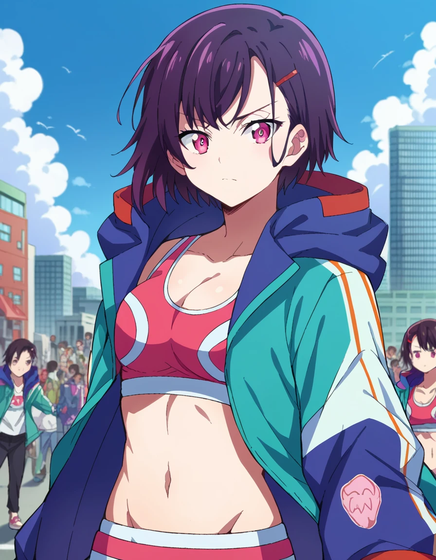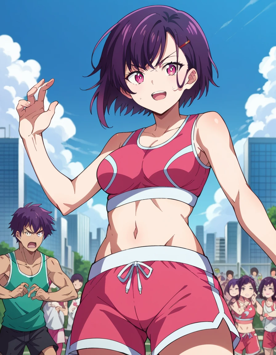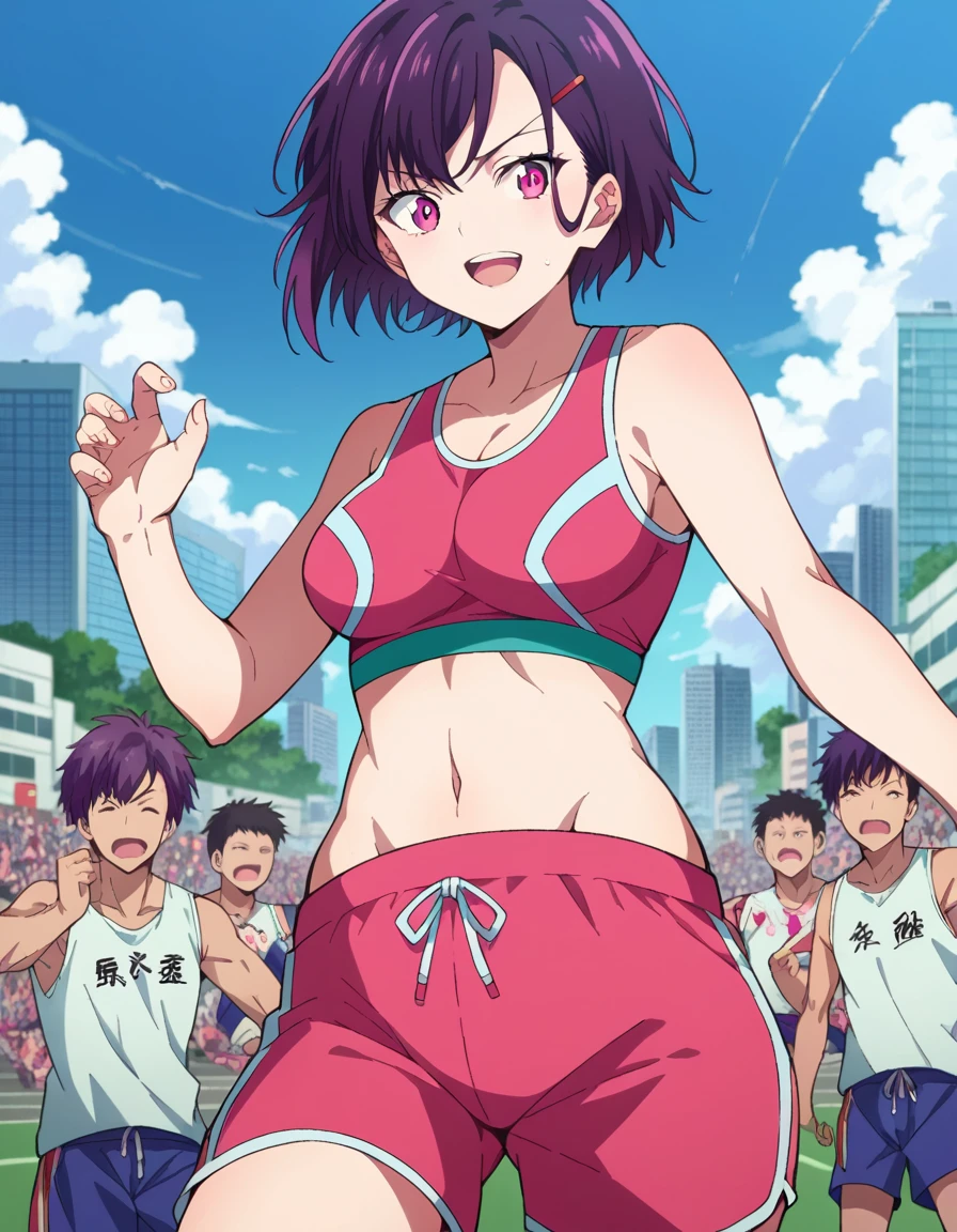 shizuka mikazuki, short hair, purple hair, hair ornament, hairclip, pink eyes, swept bangs,