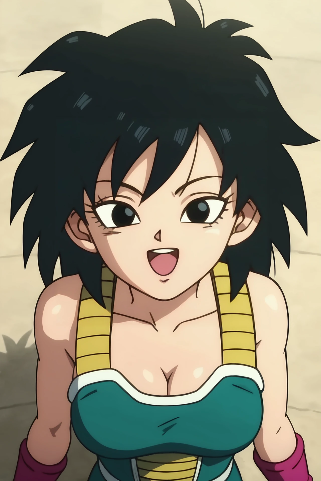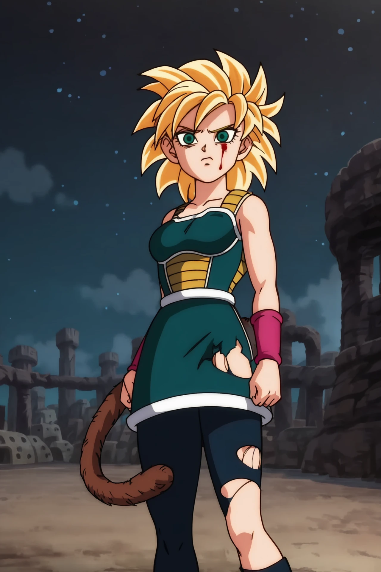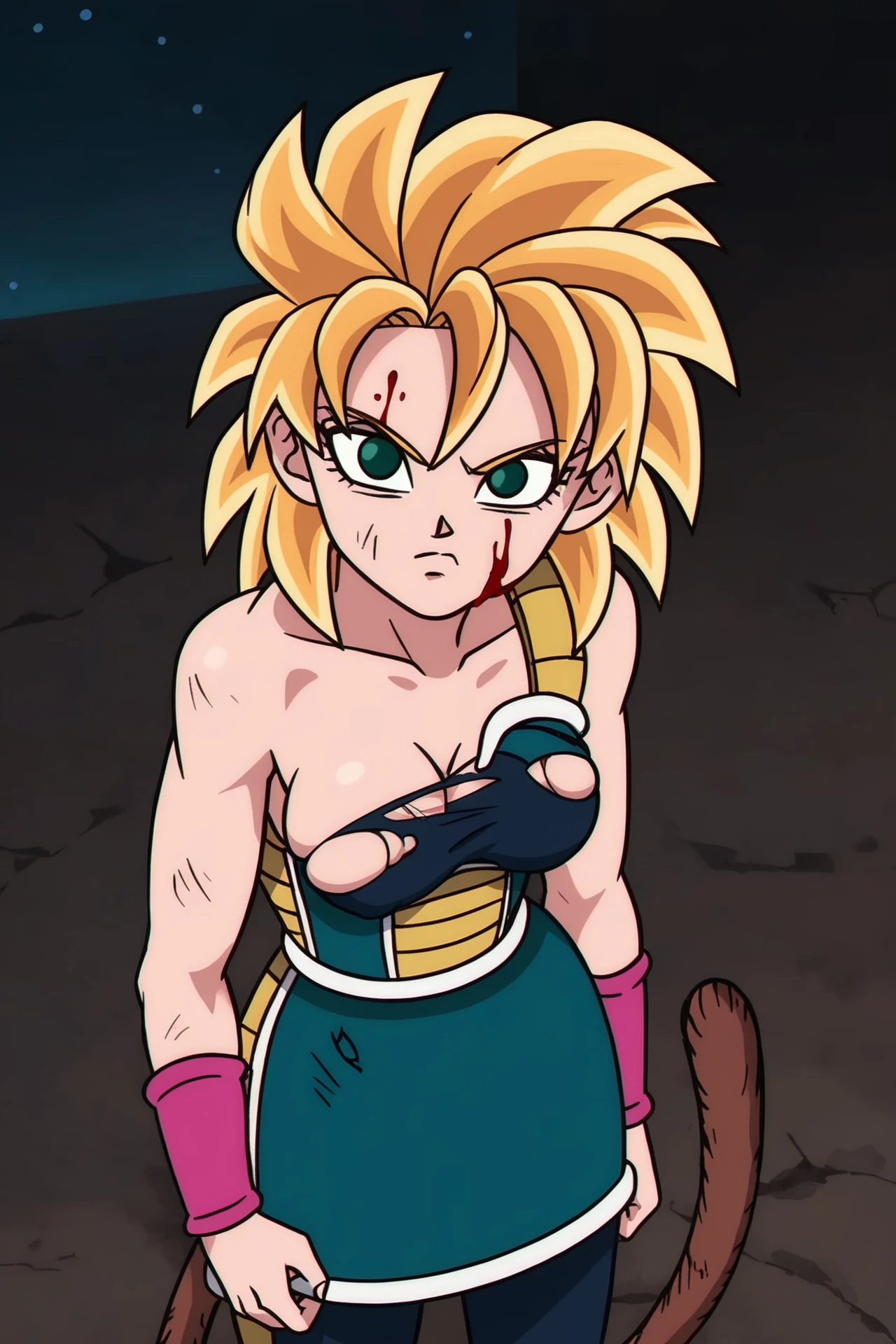 gine, super saiyan, blonde hair, medium hair, spiked hair, green eyes, monkey tail