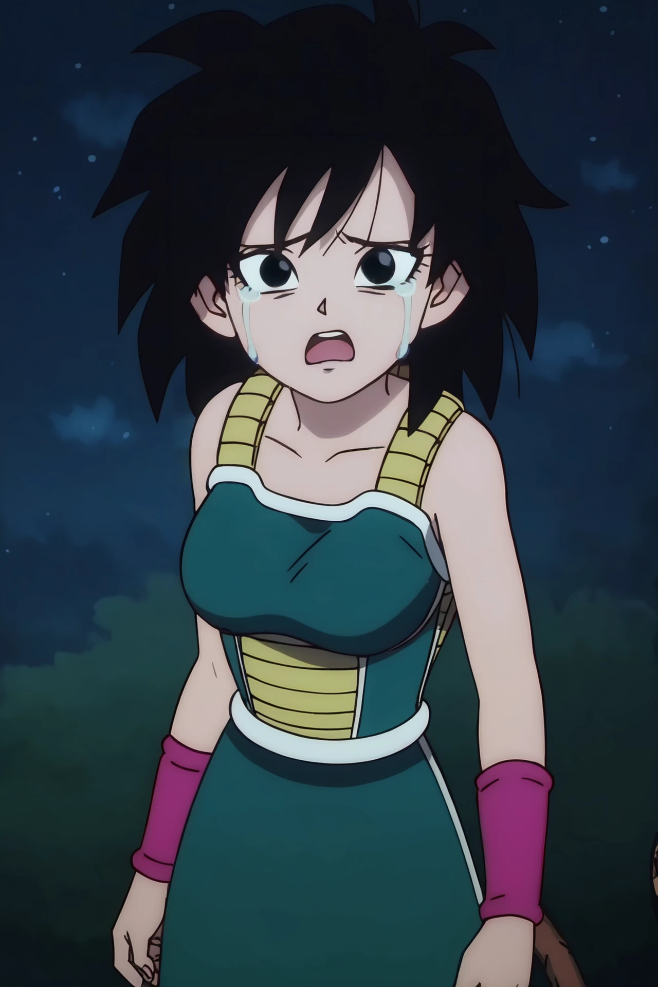 green saiyan armor, white trim, green skirt, pantyhose, black legwear, pink wristband, white boots, two tone footwear,