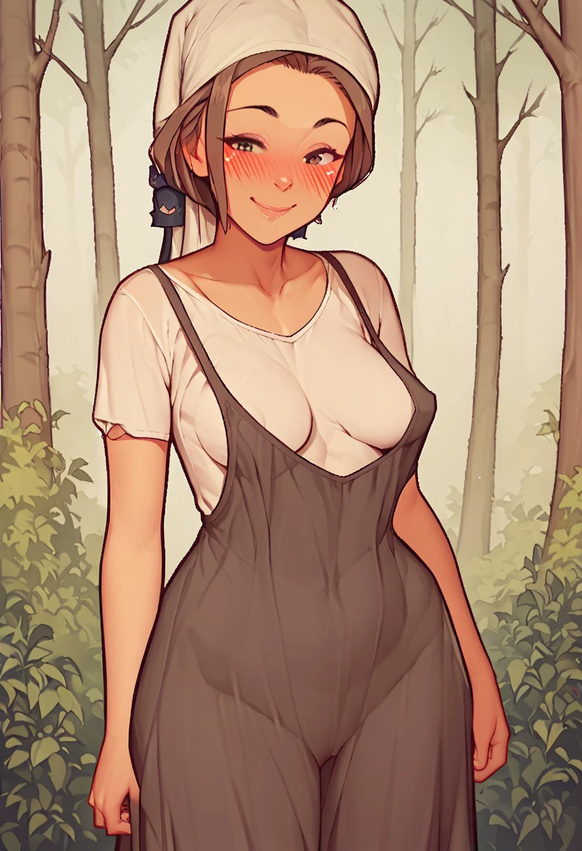 douiedl, brown hair, medium breast, dress, white shirt, brown eyes