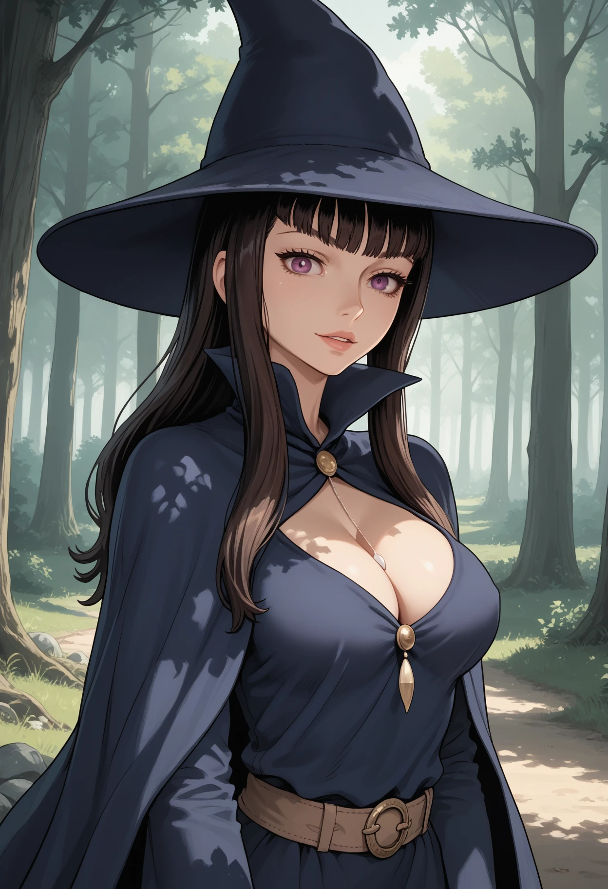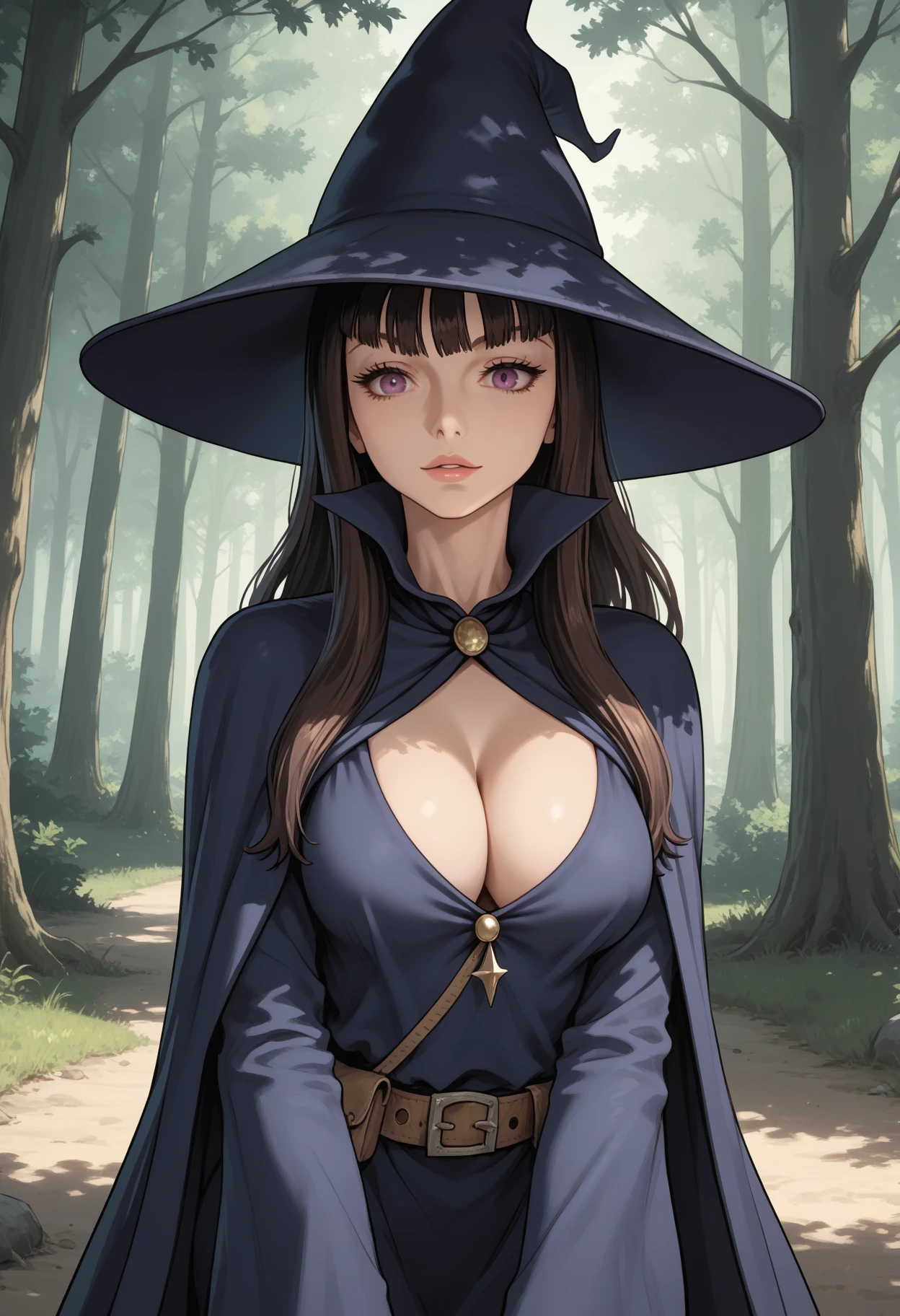 main tags: 1girl, solo, witch, purple eyes, brown hair, long hair, breasts, large breasts,