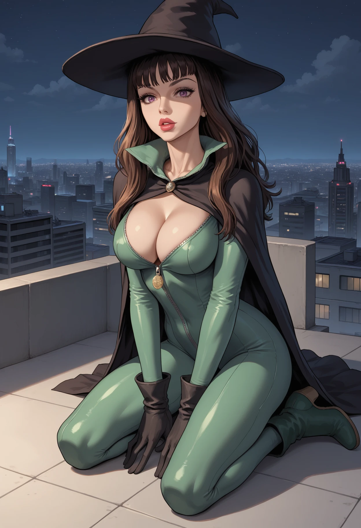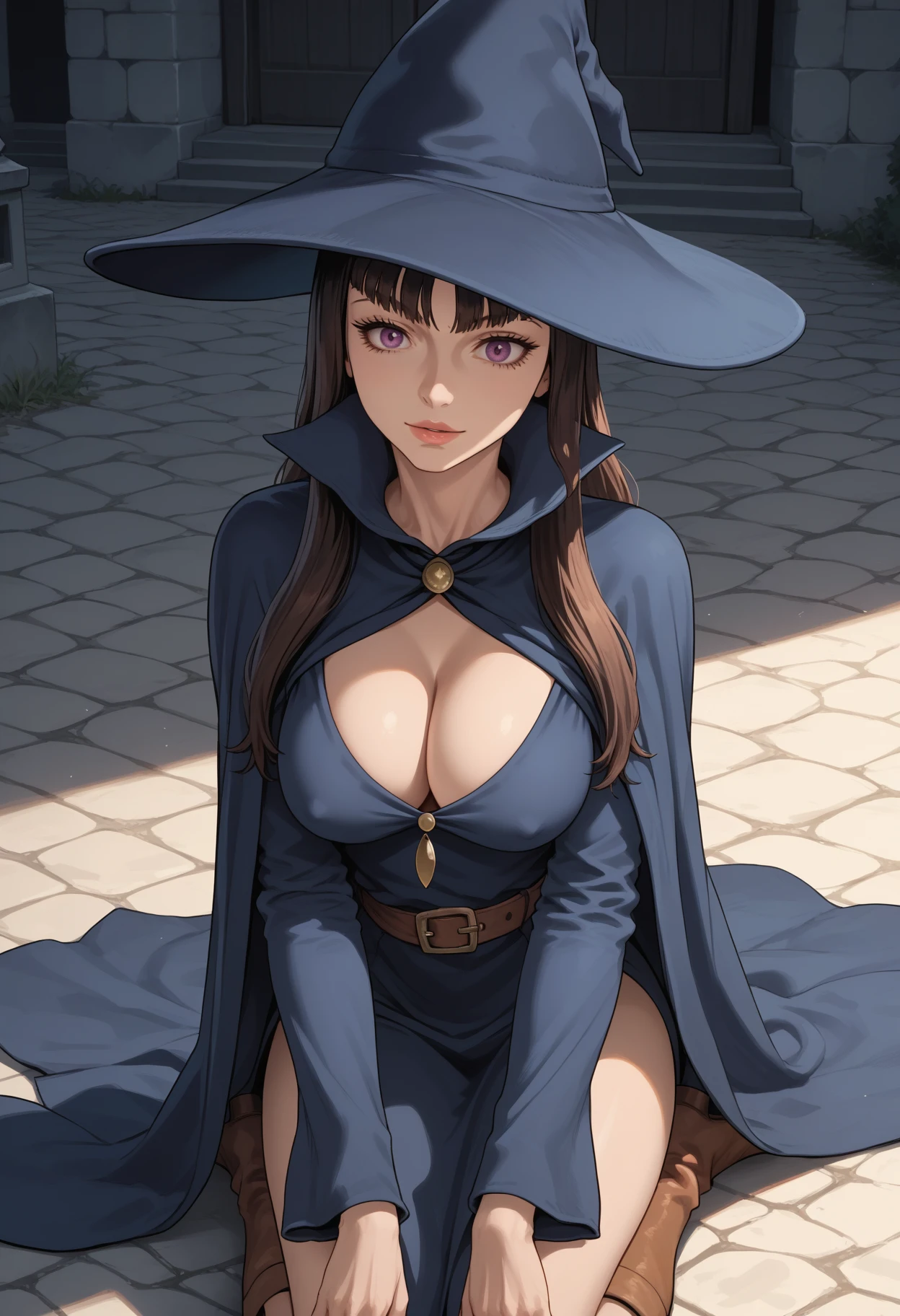 1girl, solo, witch, purple eyes, brown hair, long hair, breasts, large breasts,