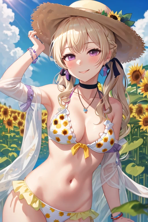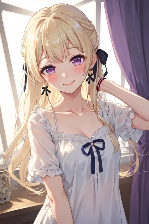 blonde_hair, bangs, long_hair, purple_eyes, blush, smile, half_updo, ribbon, jewelry