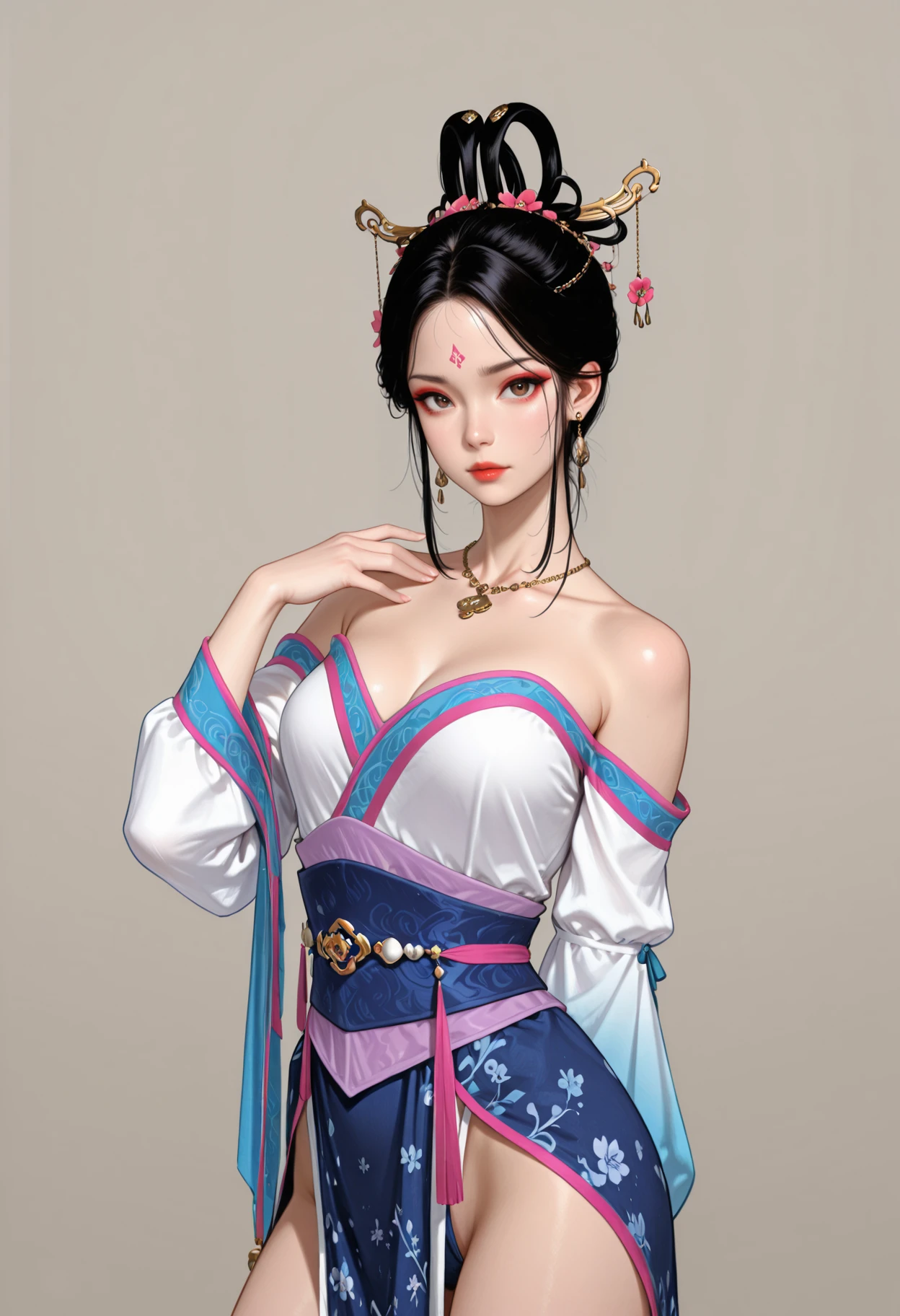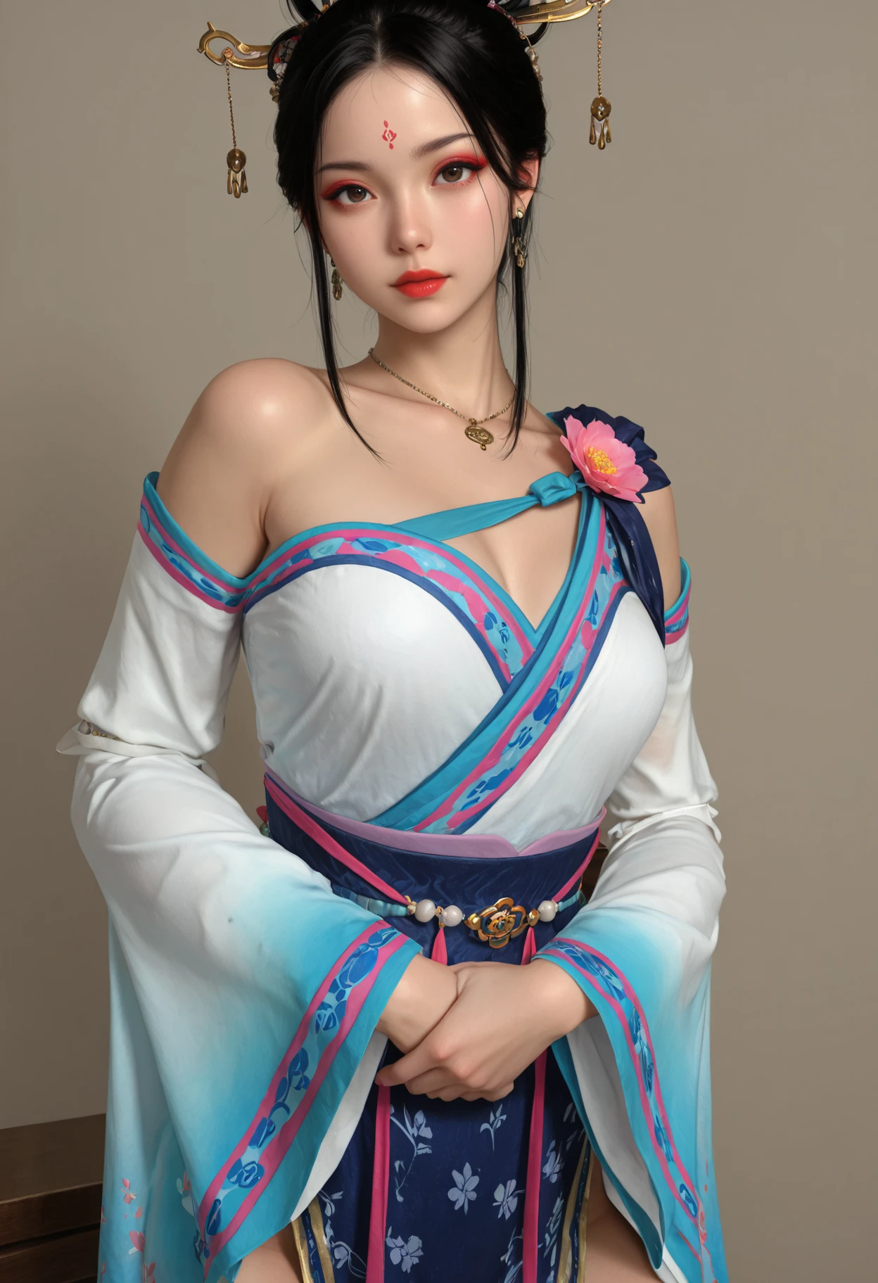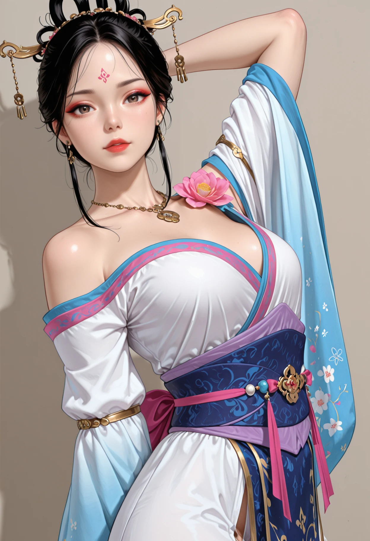 hong_jing_dancer, 1girl, solo, black hair, hair ornament, earrings, jewelry, necklace, forehead mark, makeup, flower, sash,