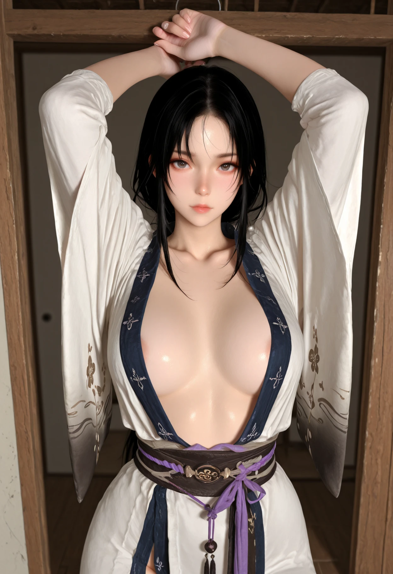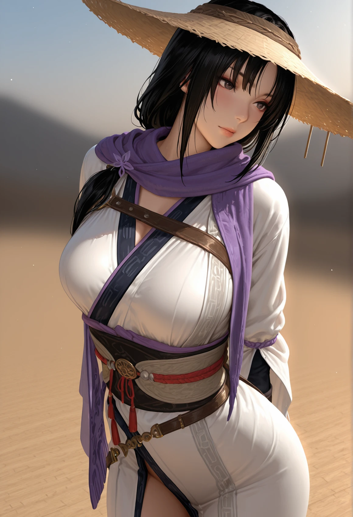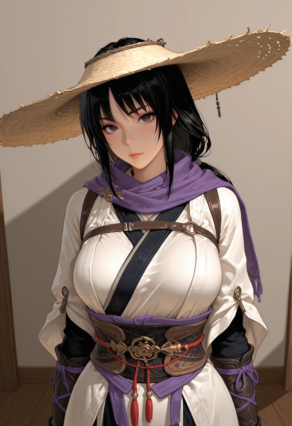 hong_jing_whtrobe, 1girl, solo, black hair, long hair, scarf, hat, sash,