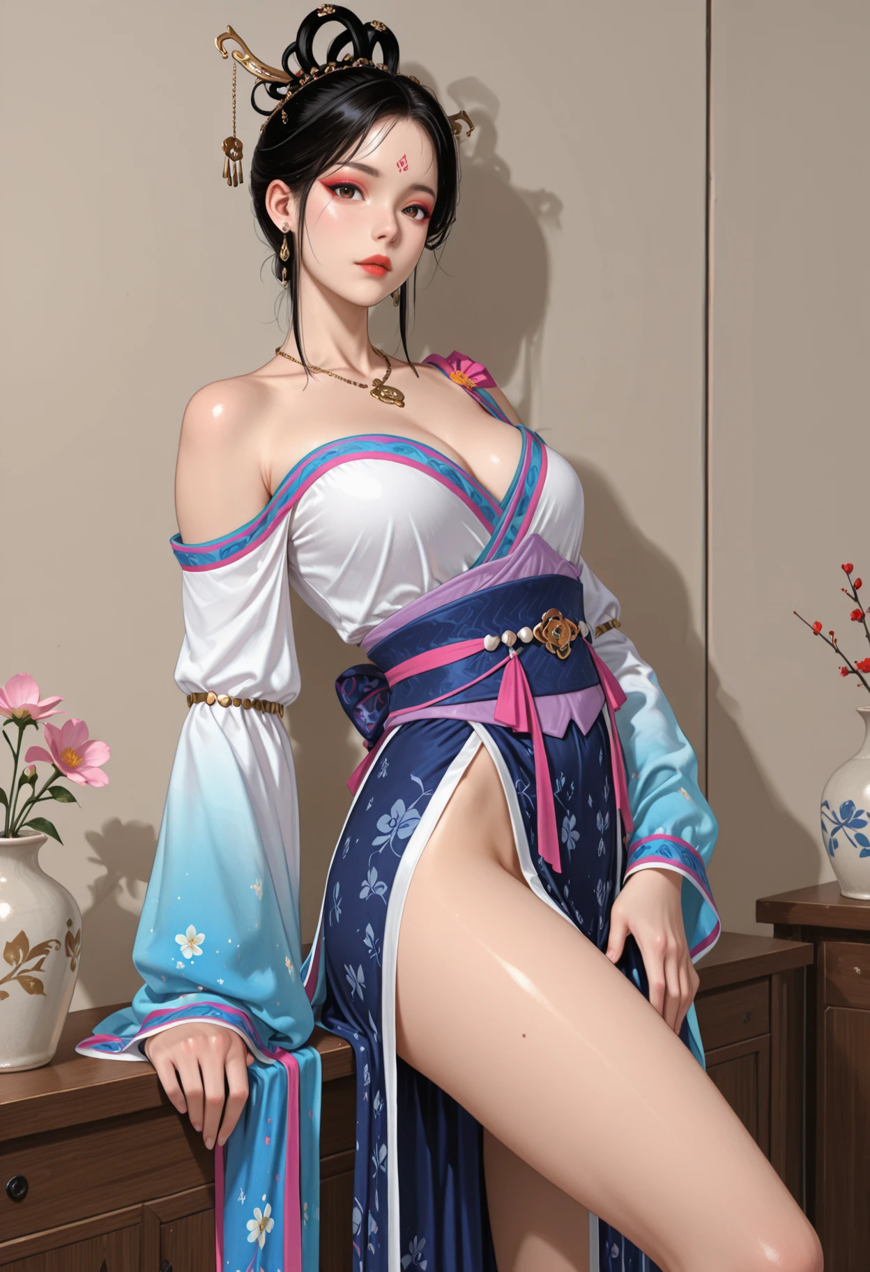 hong_jing_dancer, 1girl, solo, black hair, hair ornament, earrings, jewelry, necklace, forehead mark, makeup, flower, sash