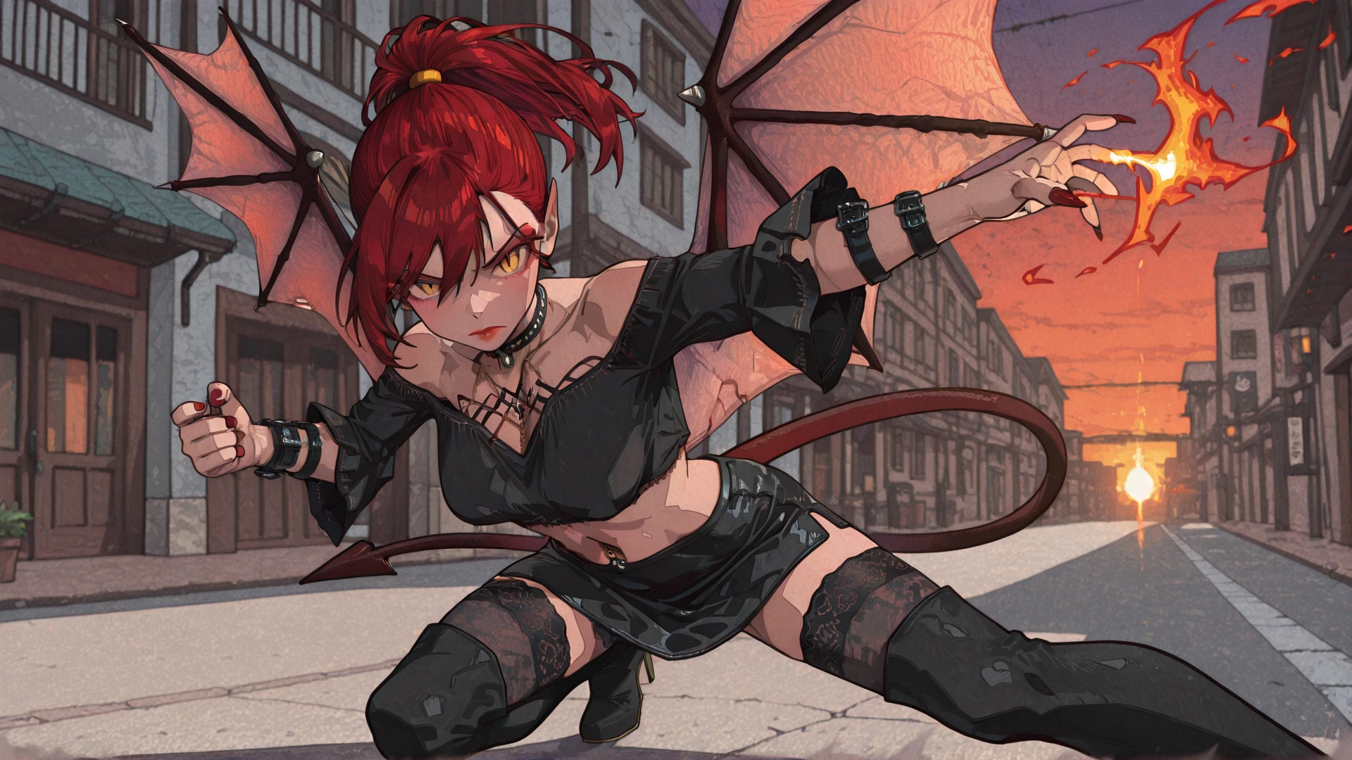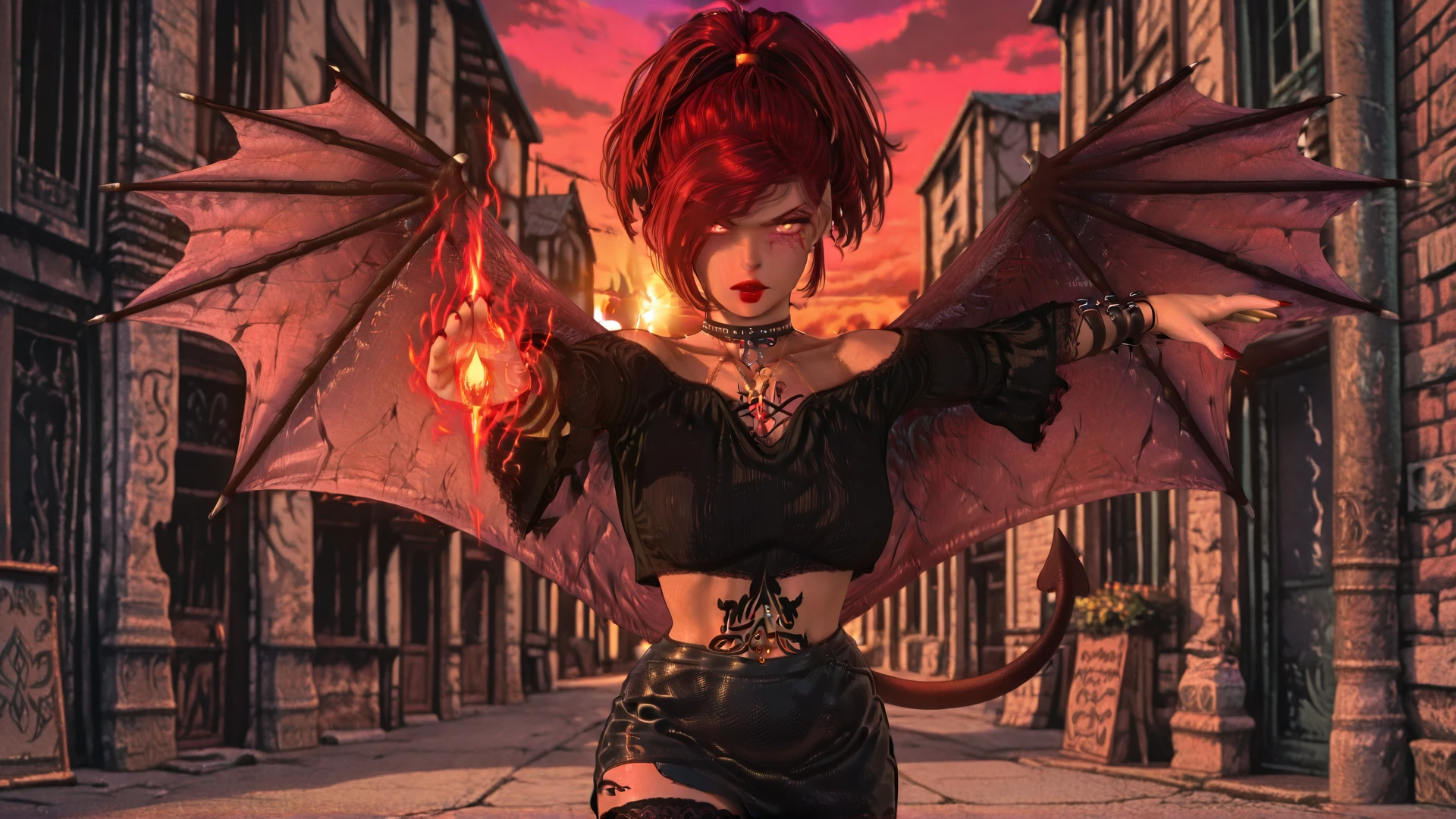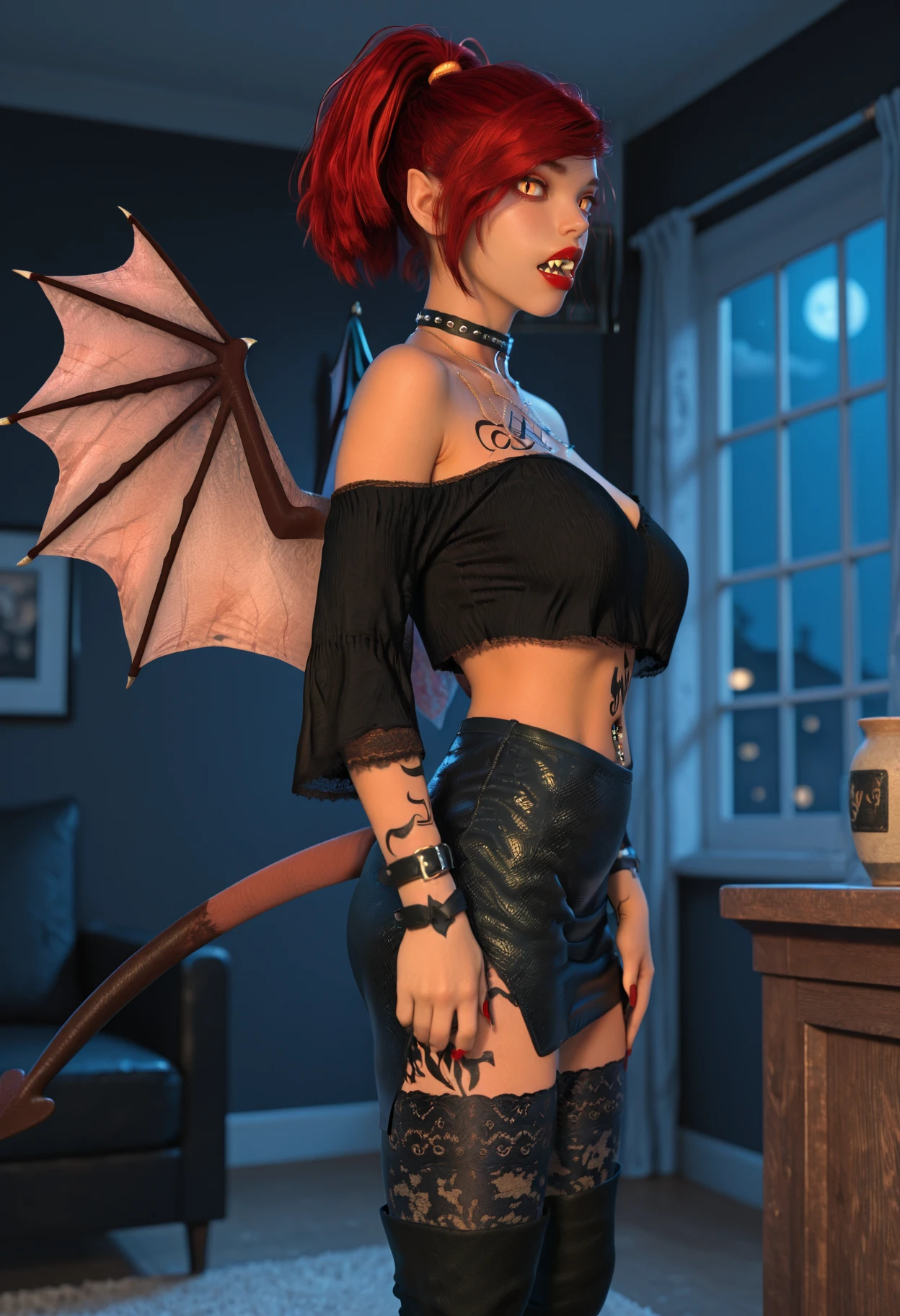 pointy ears, red hair, ponytail, slit pupils, red lipstick, red nails, makeup, tail, wings, tattoo, body chains, black boho shirt, black skirt, black thighhighs, black thigh boots, right armtraps, choker, navel piercing, jewelry,