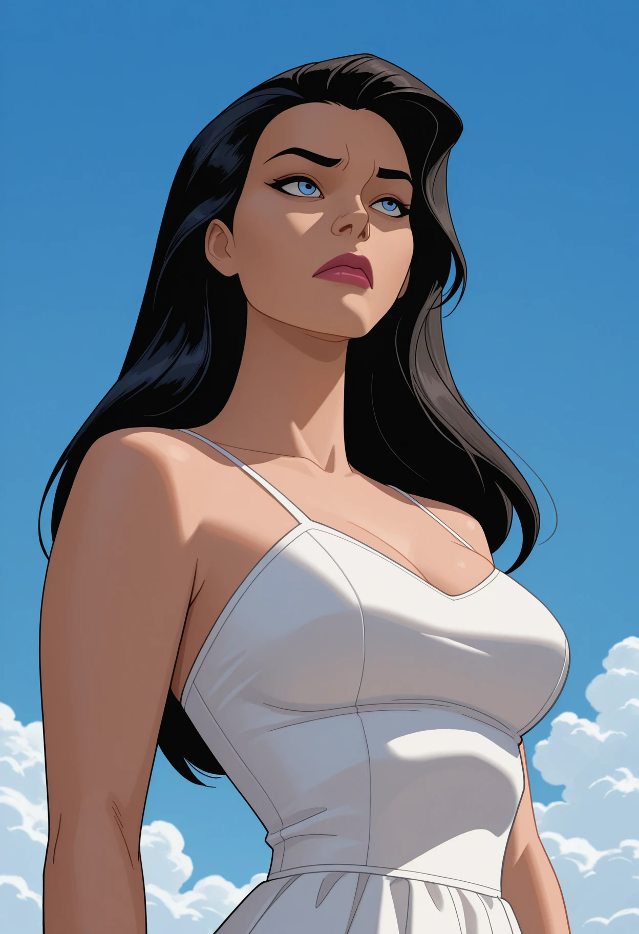 NM_Diana_WW_JL, 1girl, solo, blue eyes, black hair, long hair, breasts, large breasts, medium breasts, lips, lipstick, superhero tags: