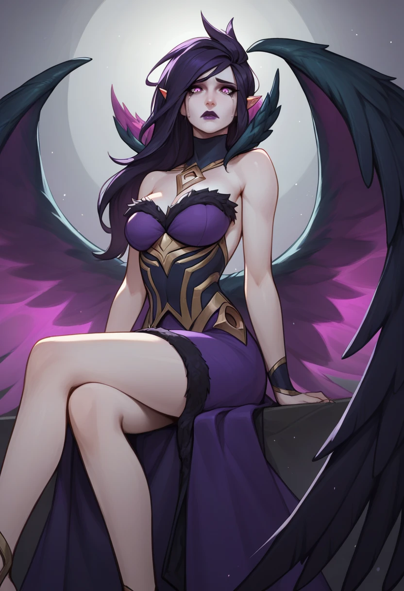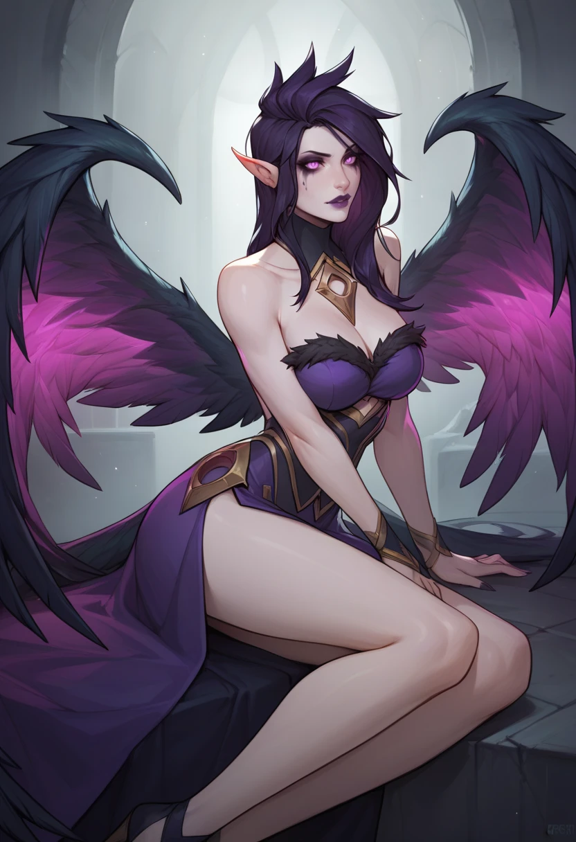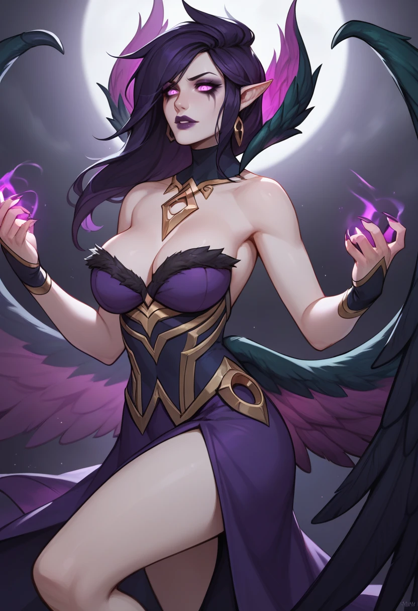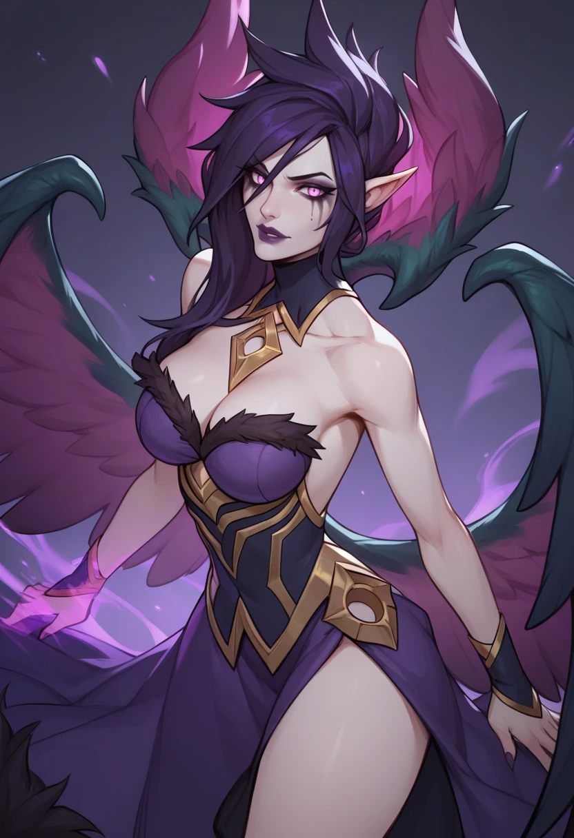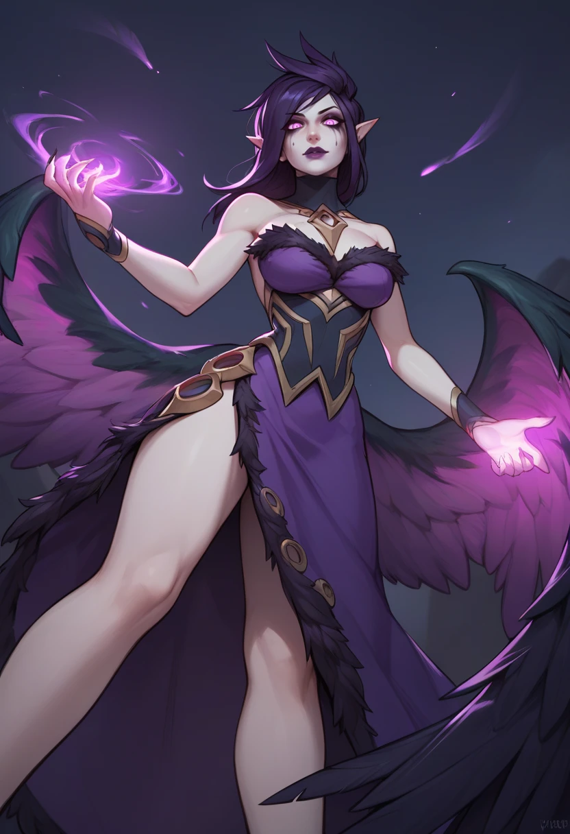 M0rg4n4, morgana, 1girl, purple eyes, pointy ears, long hair, black hair, purple hair, makeup, purple lipsdress, purple dress, strapless dress, bare shoulders,fingernails, nail polish,wings, feathered wings, black wings,barefoot, feathers, chain, magic, magic circle,hair over one eye Description