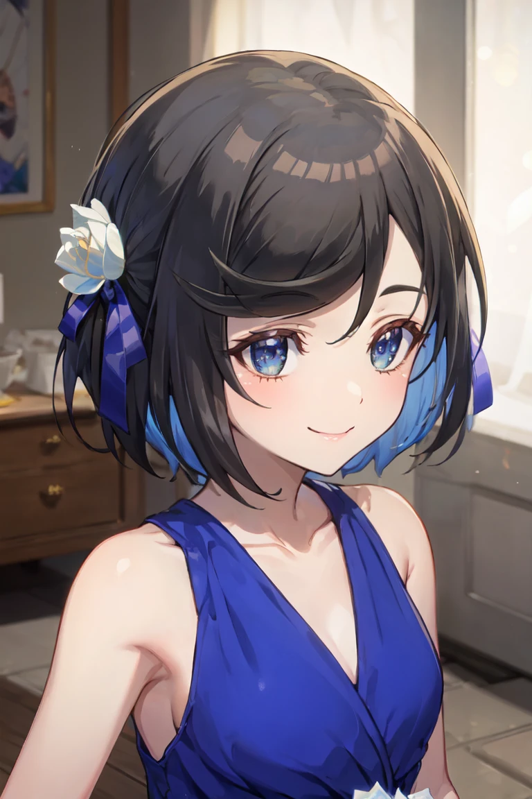 Dress: flower hair ornament, blue hair ribbon, blue dress, white flowers, sleeveless, collarbone, bare shoulders