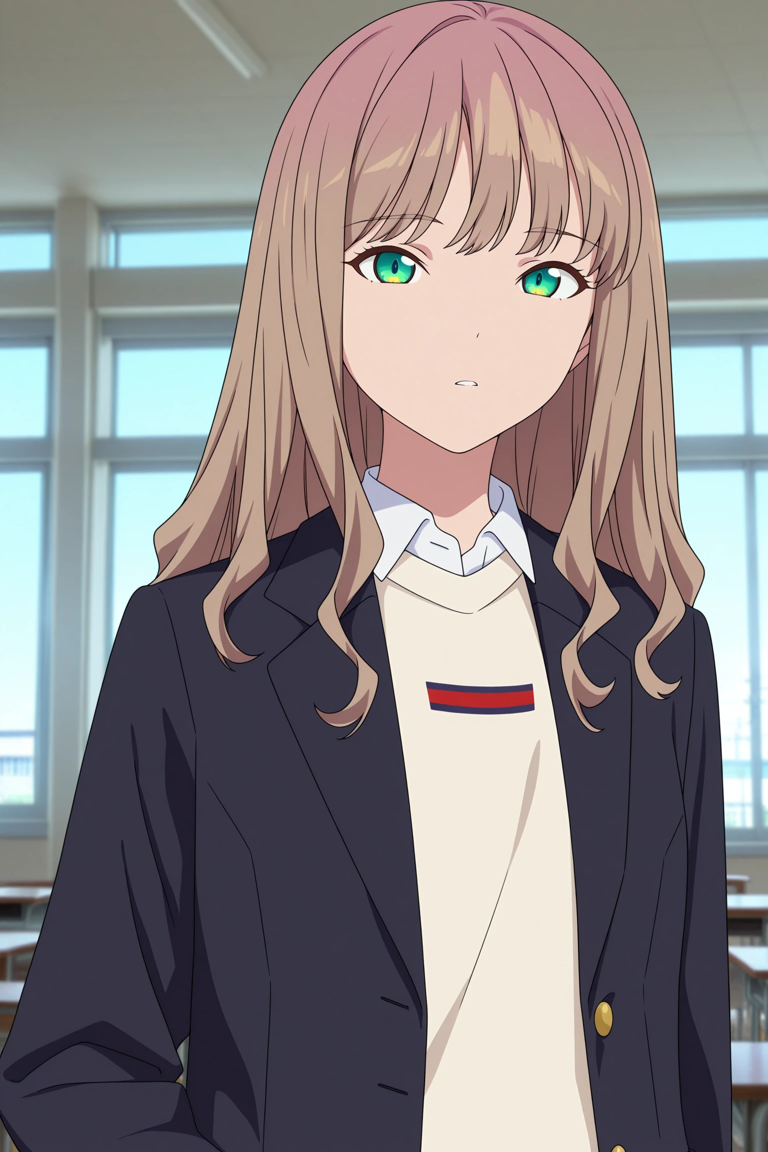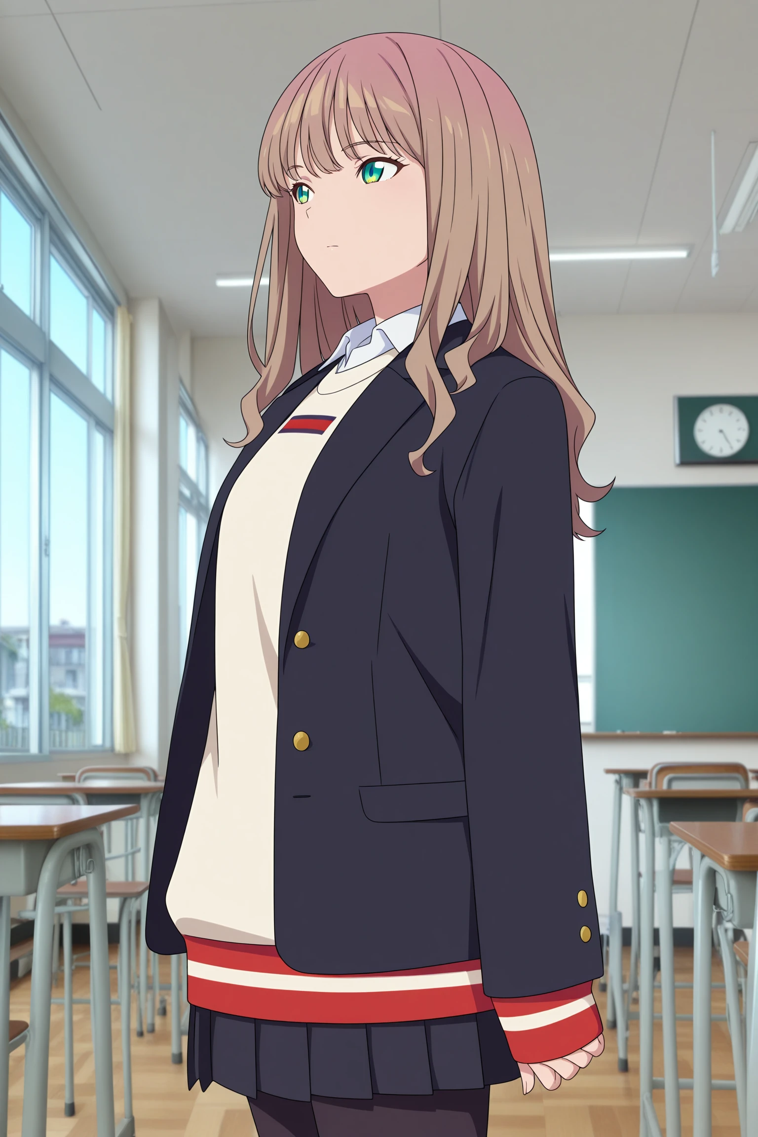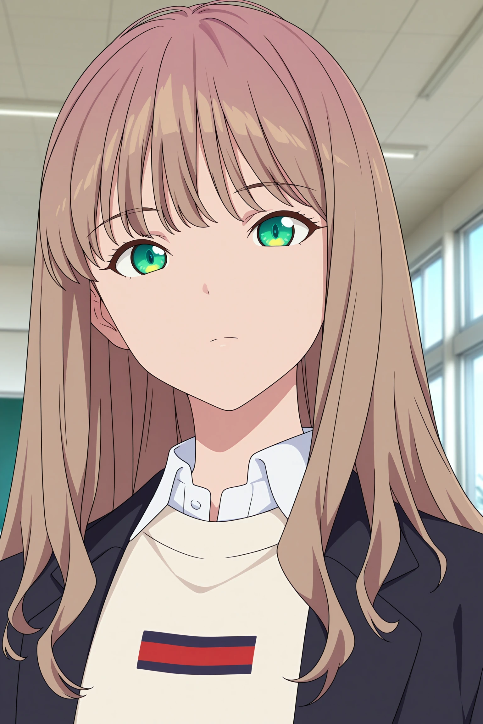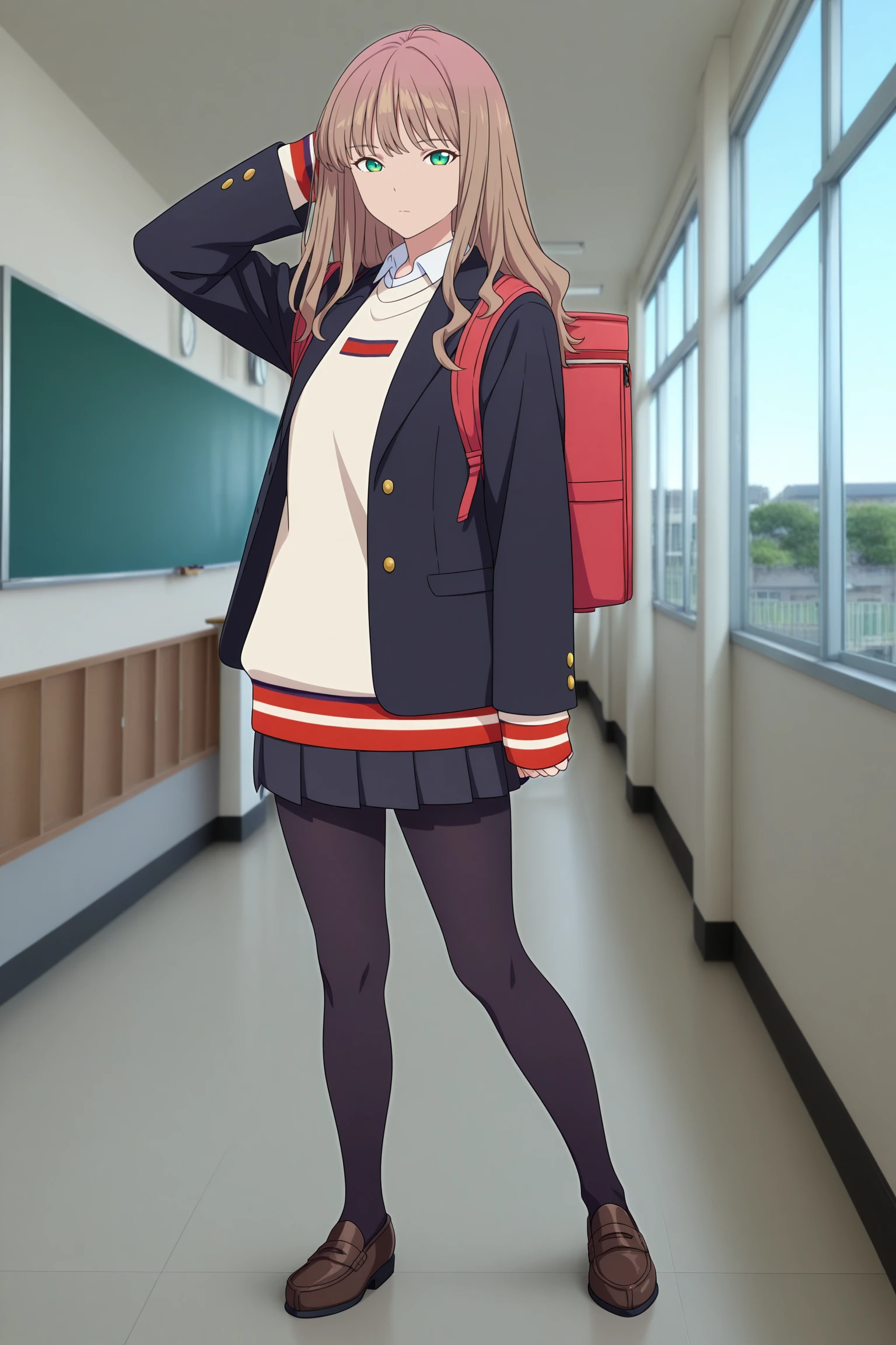 mnmym, long hair, brown hair, choppy bangs, green eyes, long sleeves, black jacket, open jacket, sleeves past wrists, yellow sweater, white shirt, collared shirt, black skirt, pleated skirt, black pantyhose, brown footwear, loafers