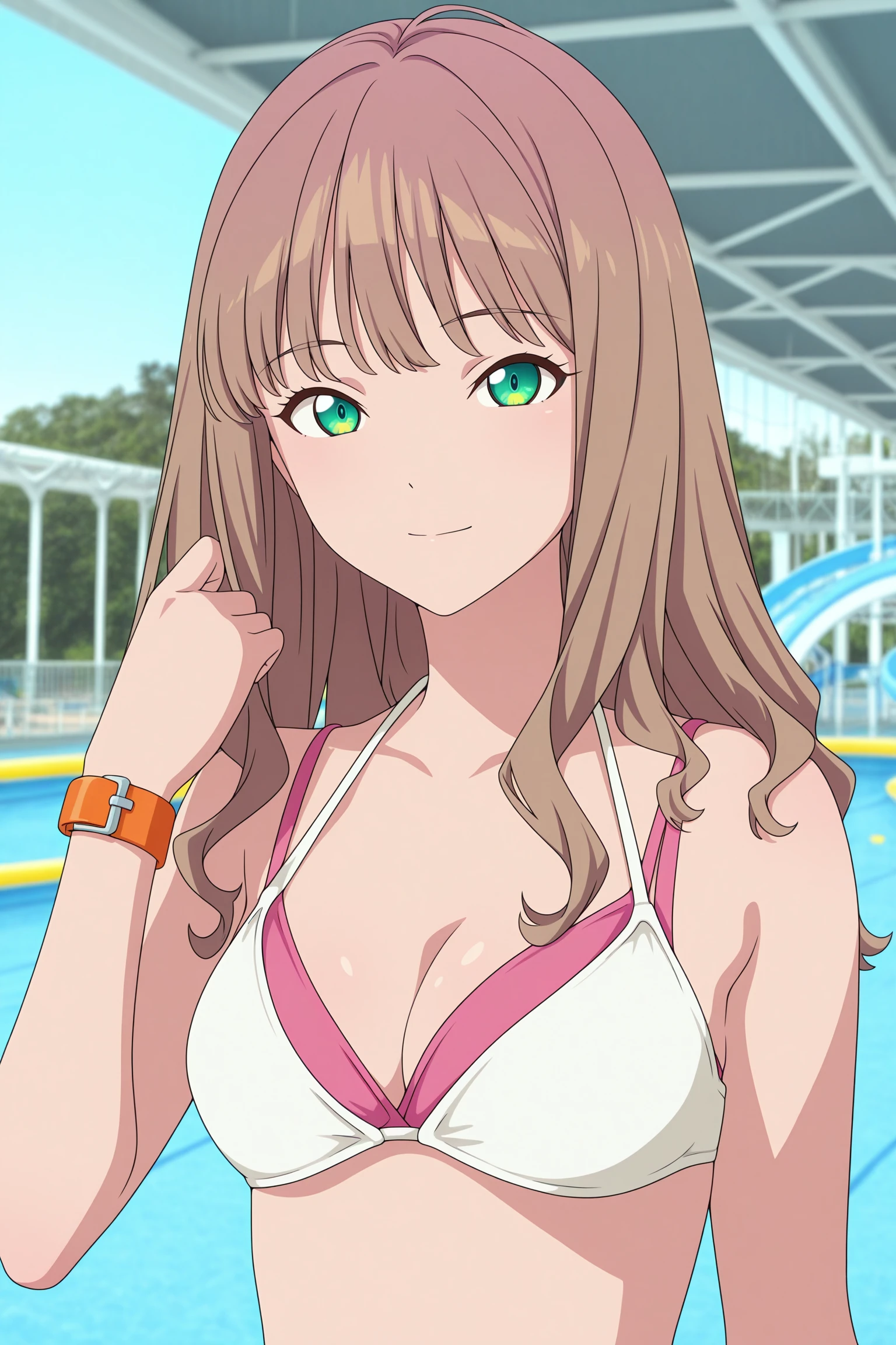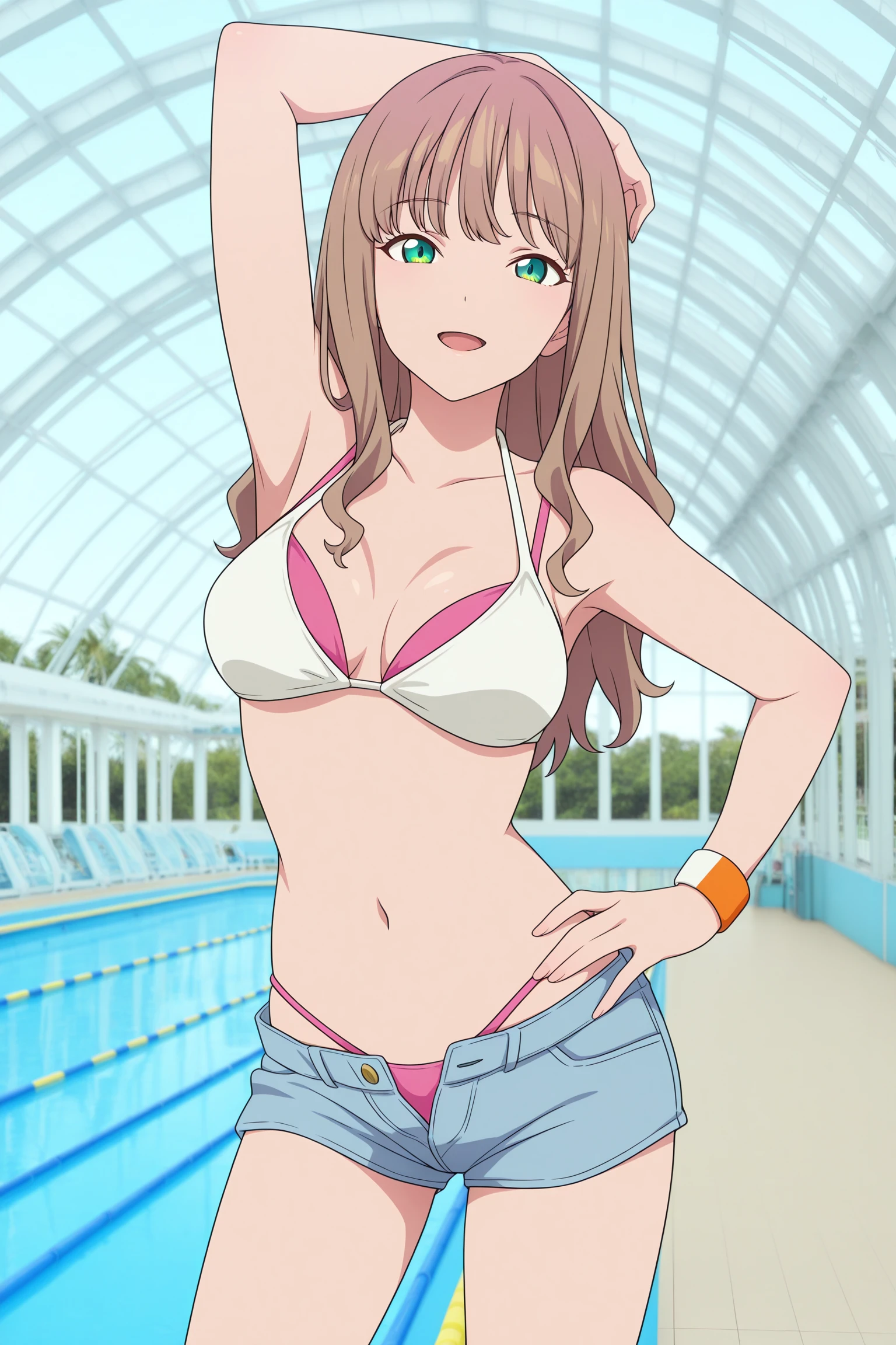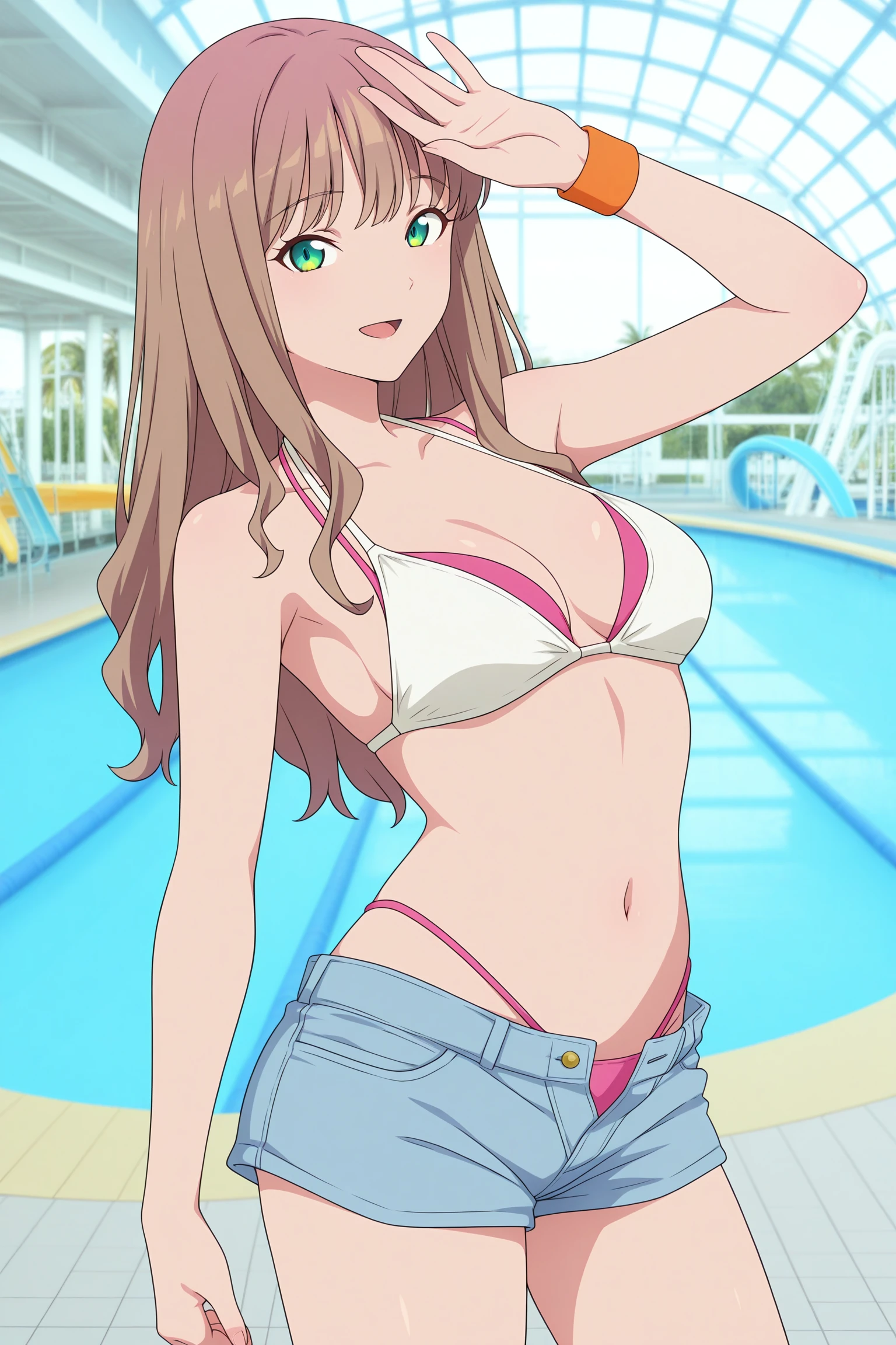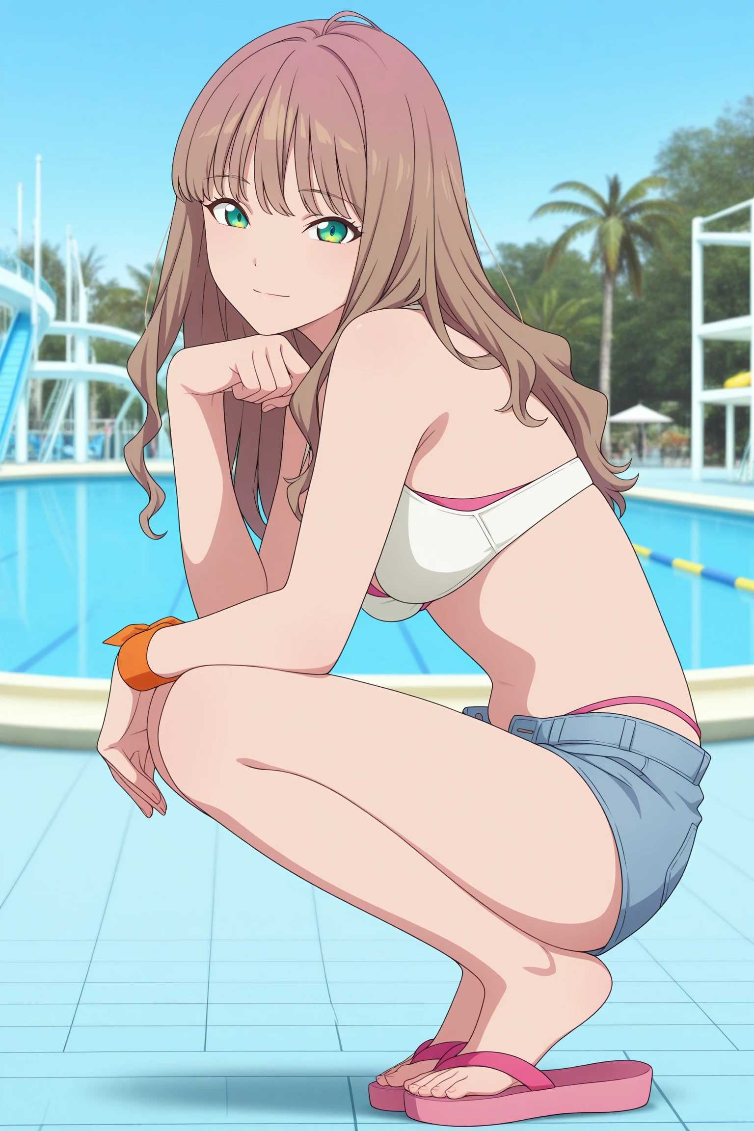 mnmym, long hair, brown hair, choppy bangs, green eyes, wristband, layered bikini, white bikini, pink bikini, bikini under shorts, denim shorts, short shorts, open fly, pink footwear, flip-flops