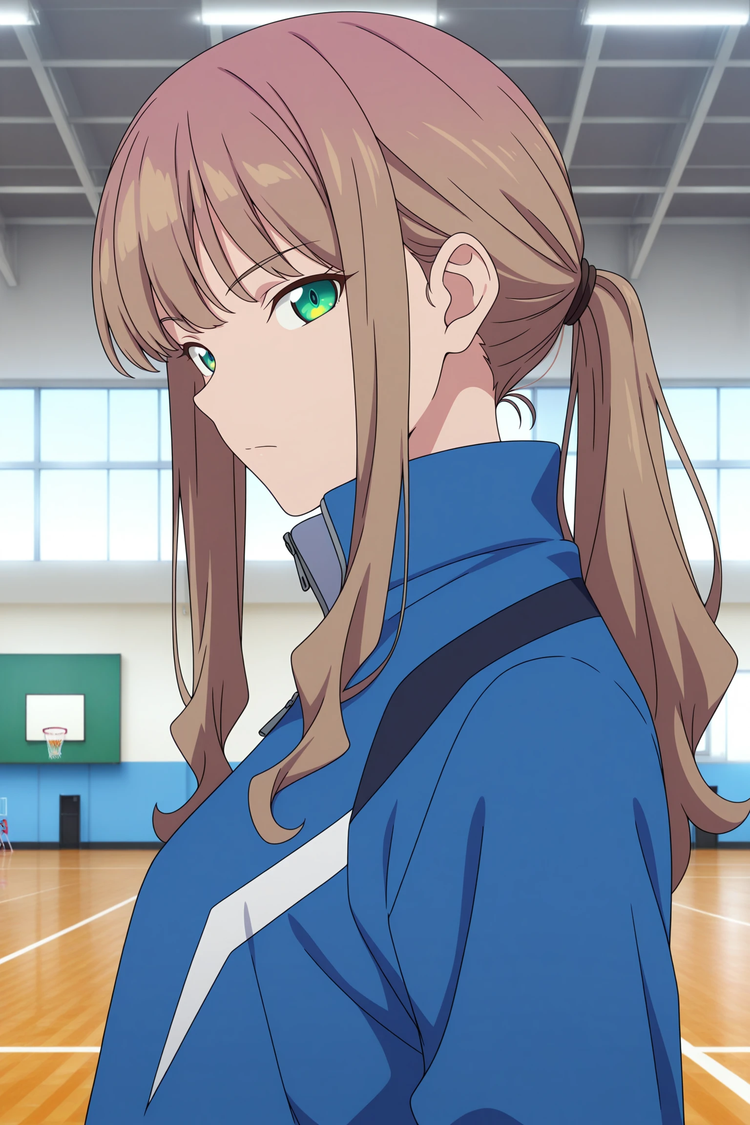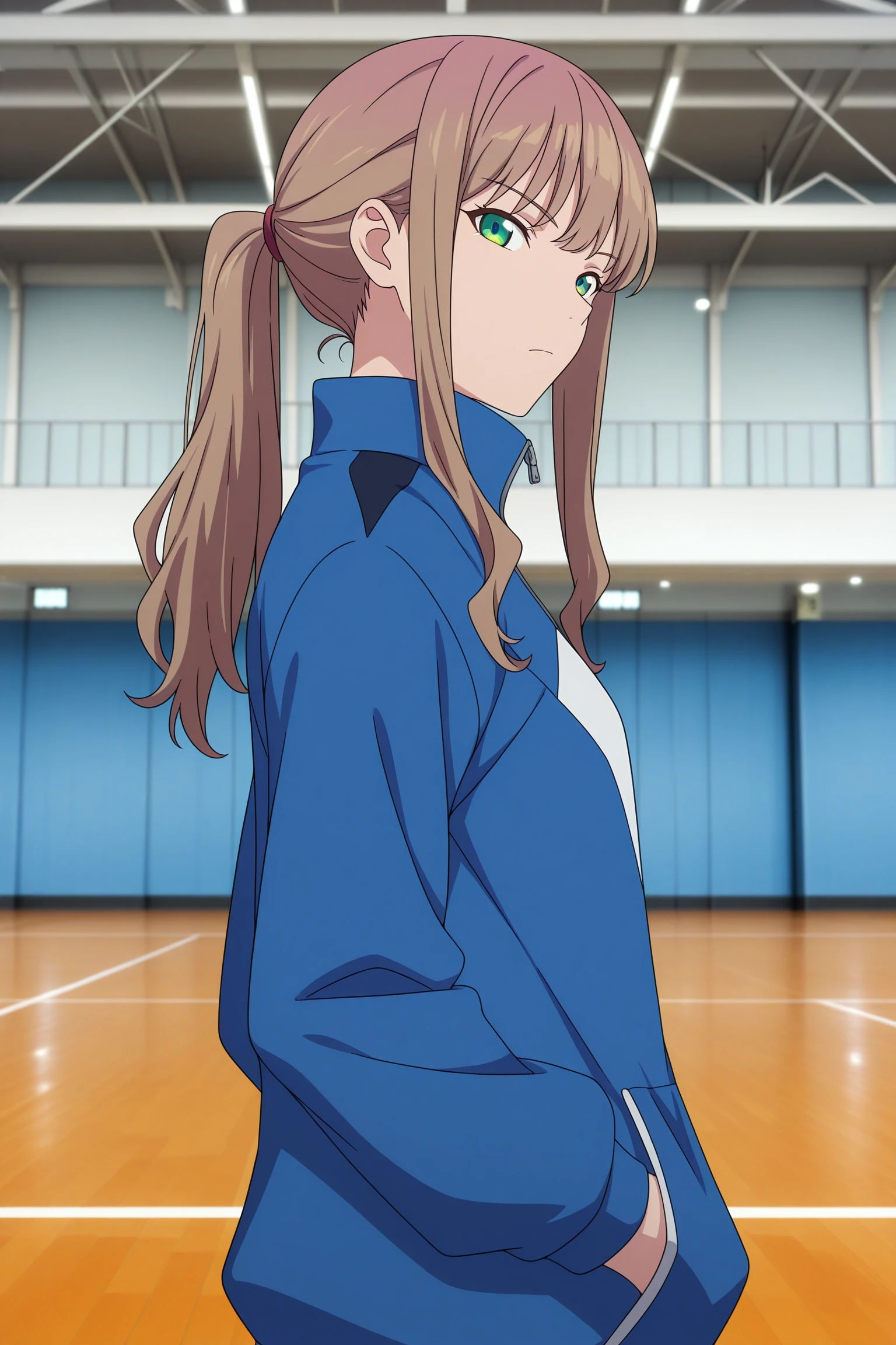 mnmym, long hair, brown hair, ponytail, hair tie, sidelocks, choppy bangs, green eyes, long sleeves, high collar, blue jacket, track jacket, blue pants, track pants, white footwear, sneakers