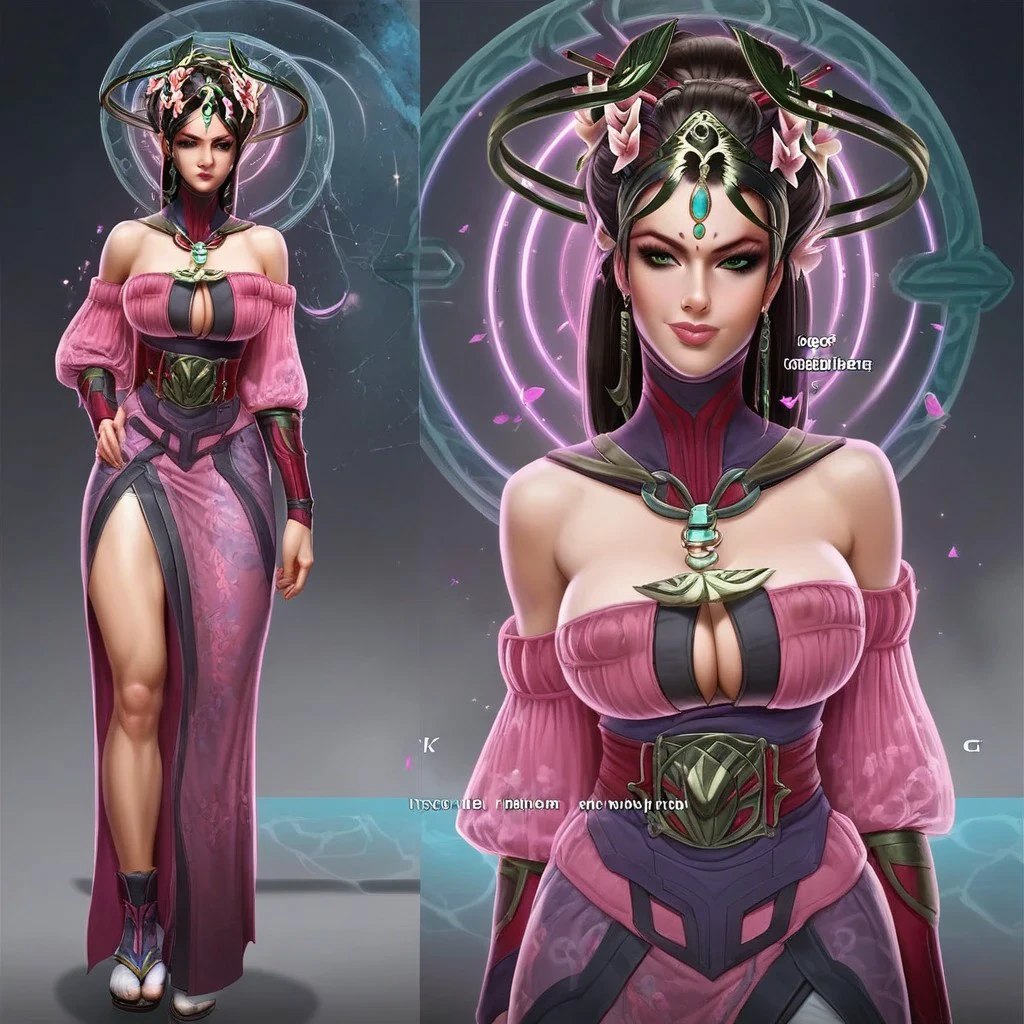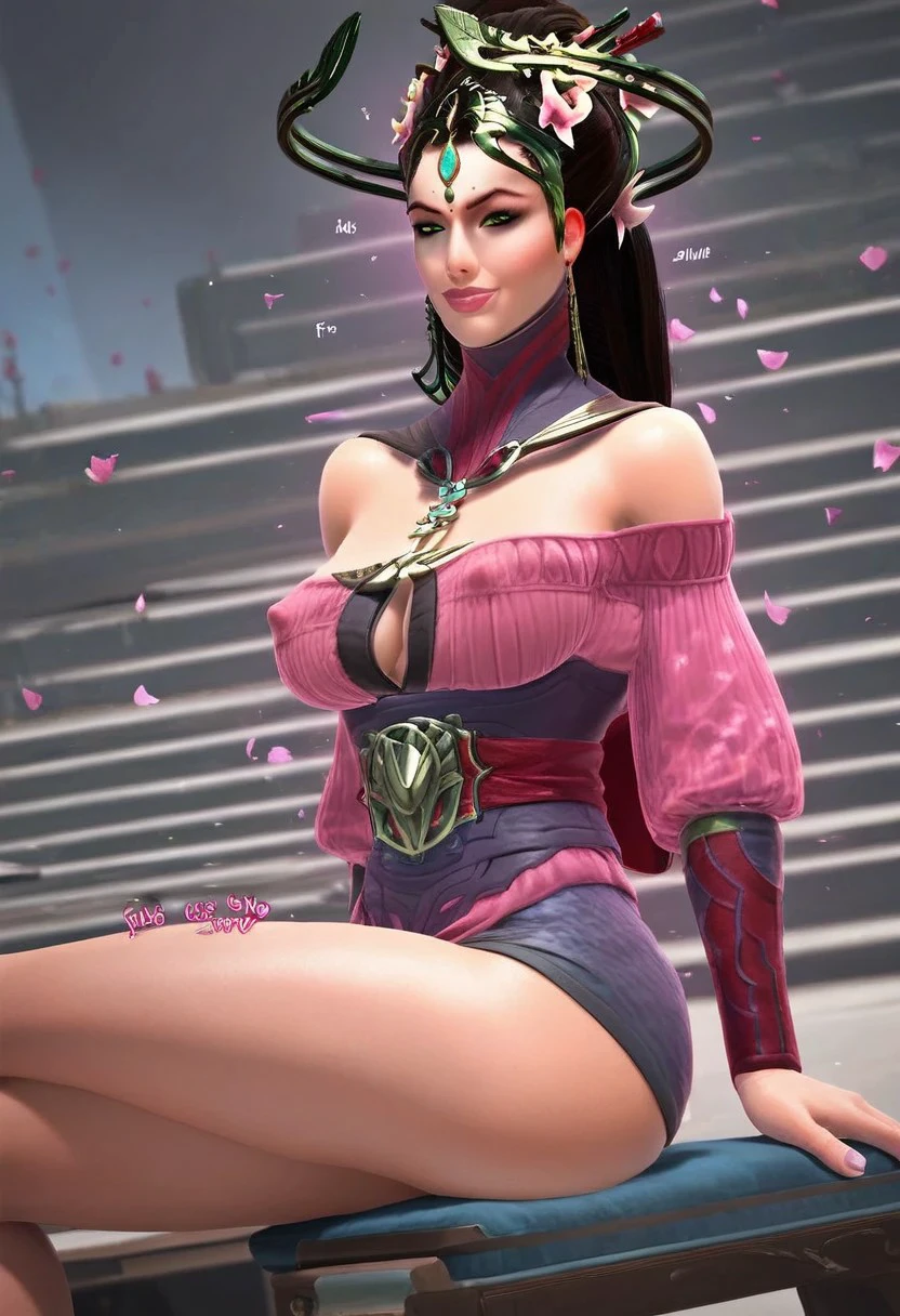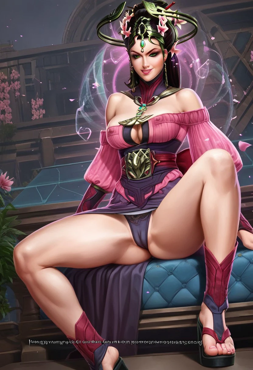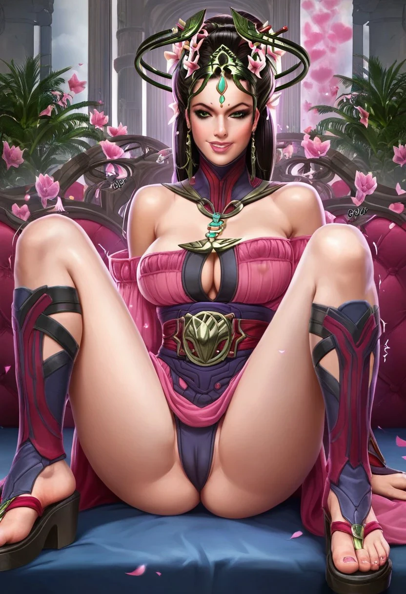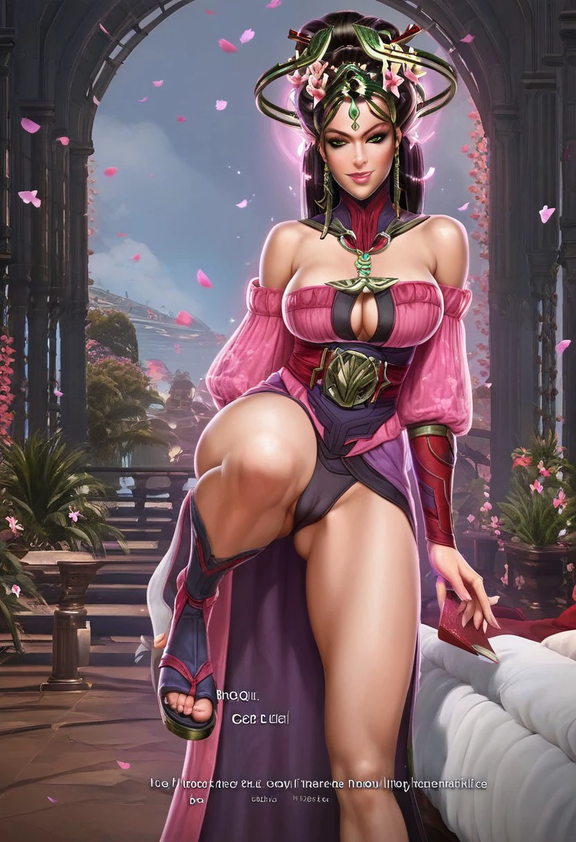 ThaisSF, 1girl, solo, goddess, nimbus, black hair, long hair, hair flowers, hair ornament, green eyes, full lips, pink lips, earrings, makeup, necklace, large breast, jewelry, cleavage, long pink dress, belt, bare shoulders, cutout dress, cleavage cutout, wide sleeves, thick thighs, flowers, tabi, flower print, white underwear, white socks,