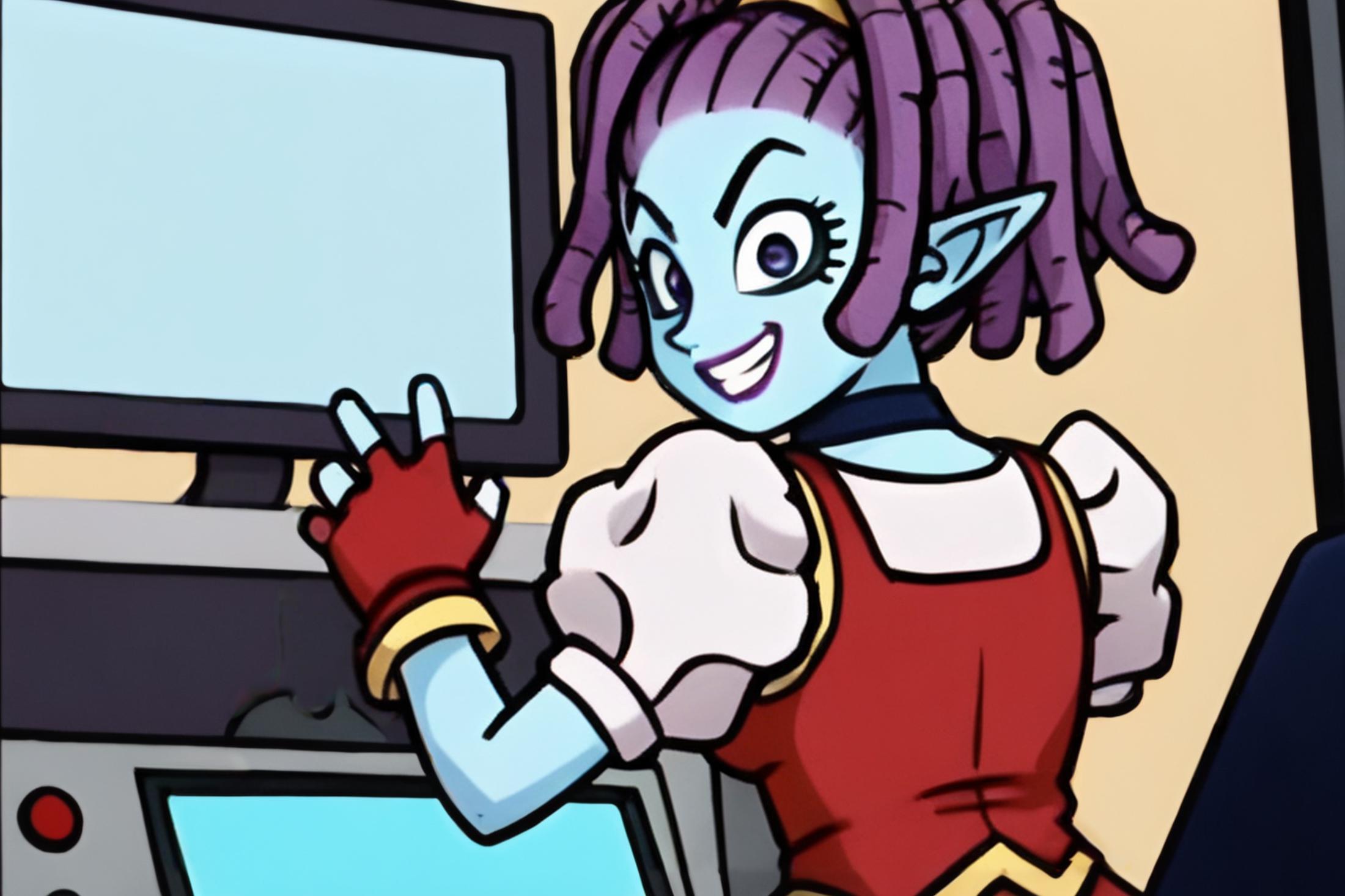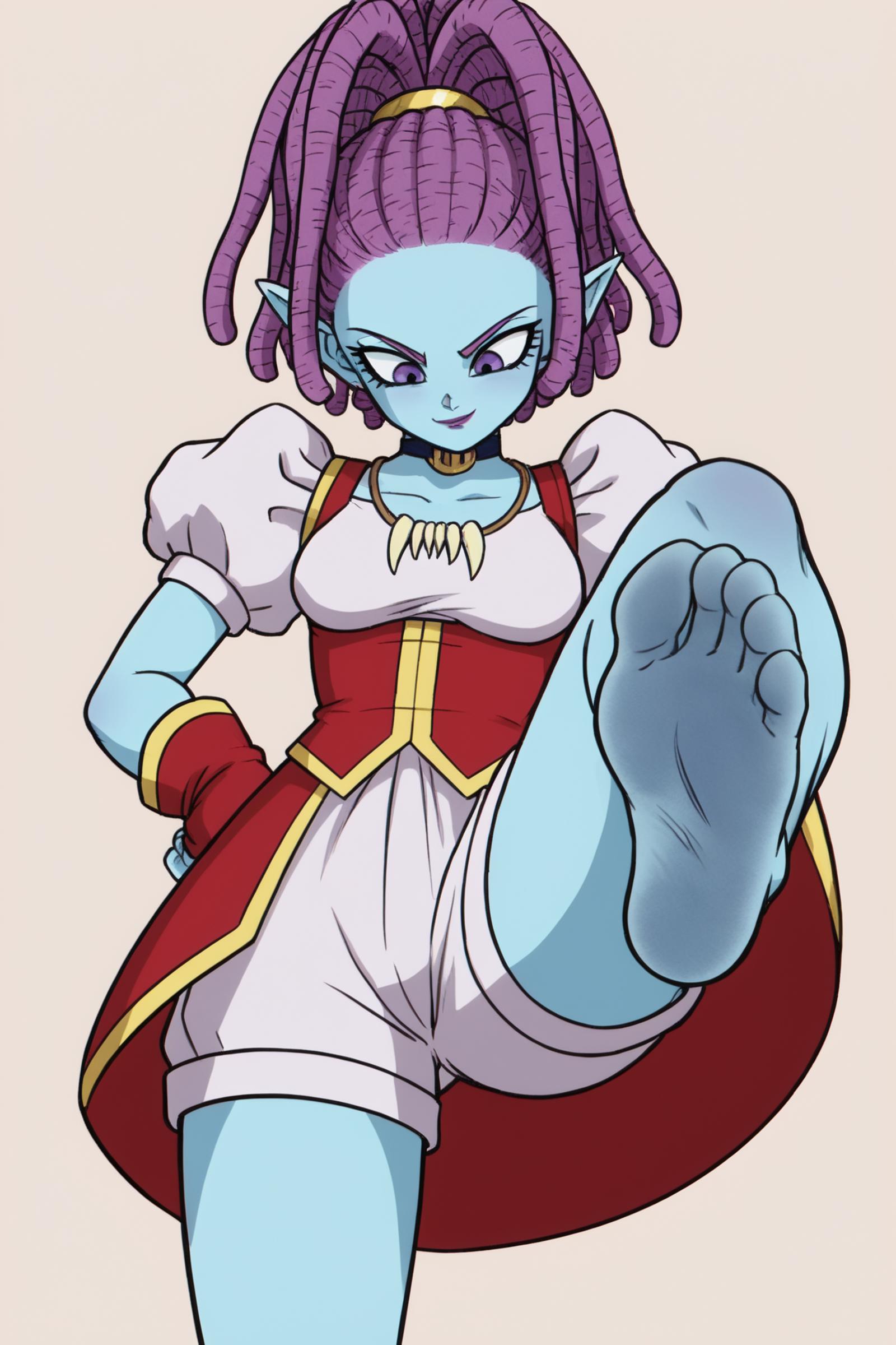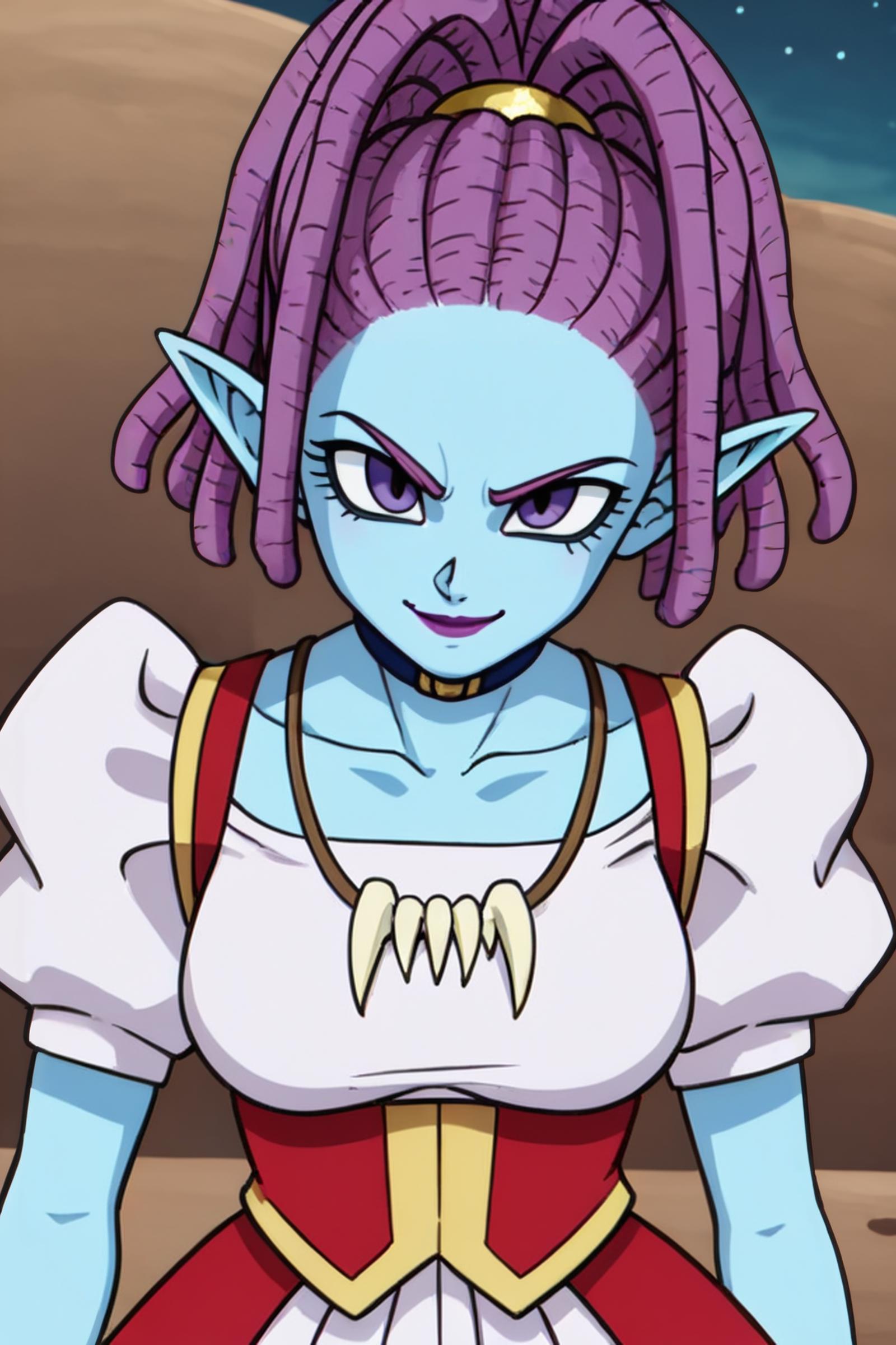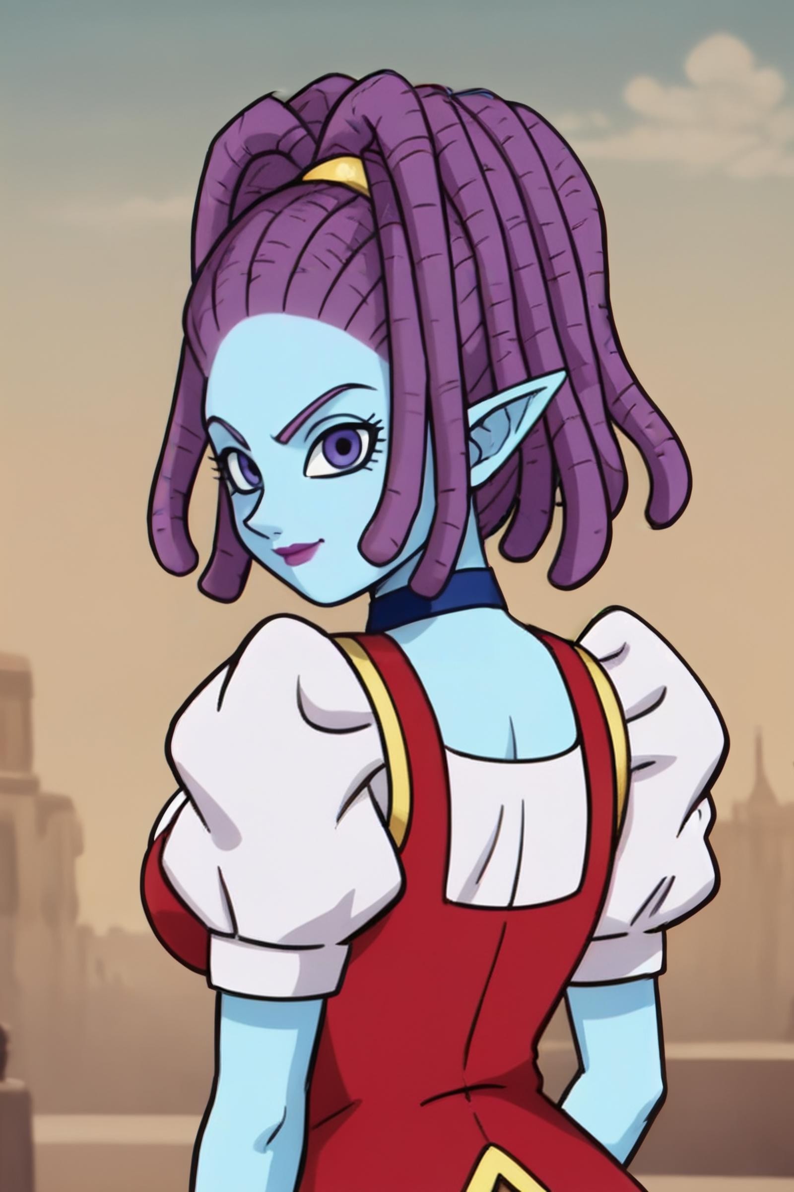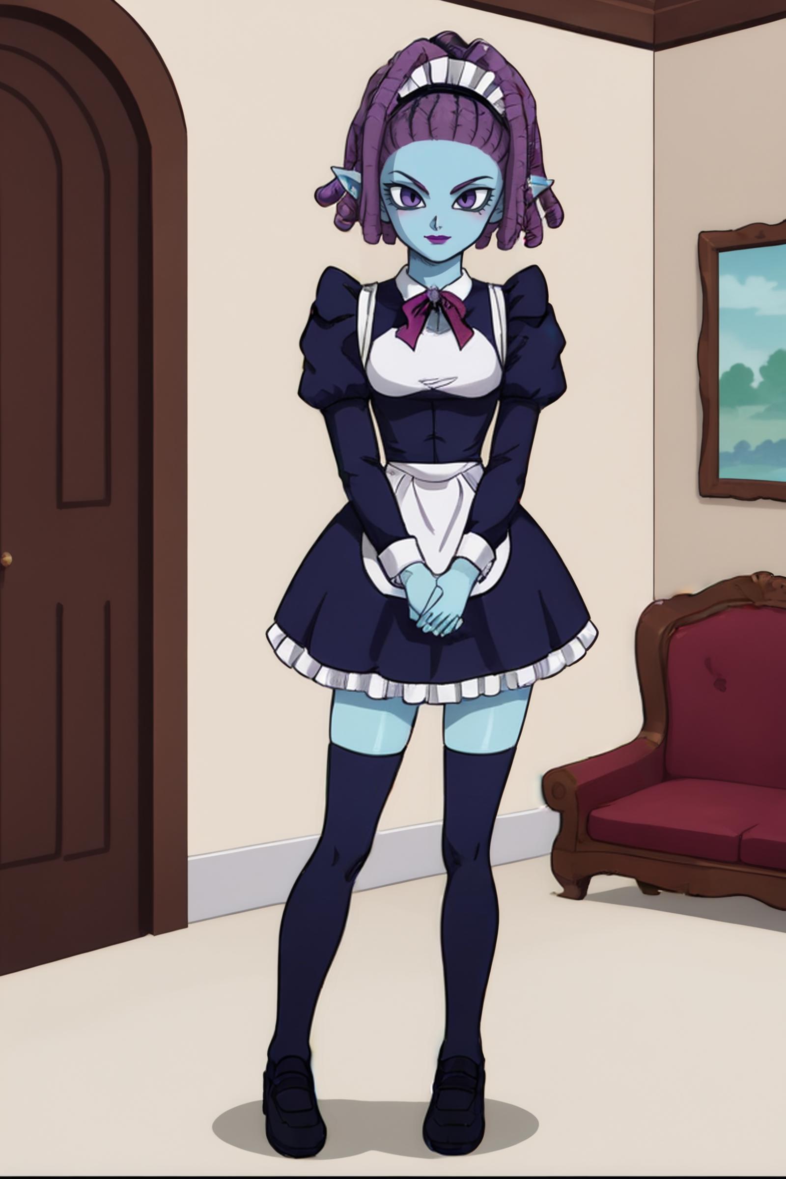 mackidbs, purple lips, purple eyes, purple hair, blue skin, dreadlocks, pointy ears, tied-up hair, snake hair, ponytail,
