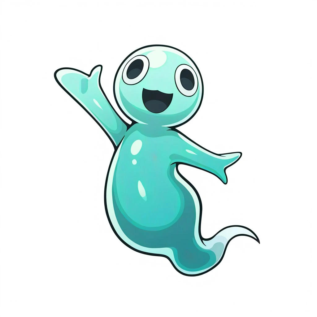 (antennae, black eyes, ring eyes, teal body, short arms, no fingers, ghost tail)