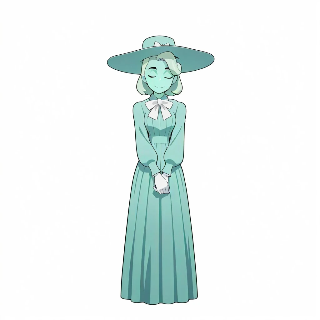 (wide hat, white neckbow, green Victorian dress, puffy long sleeves, white gloves, long skirt)