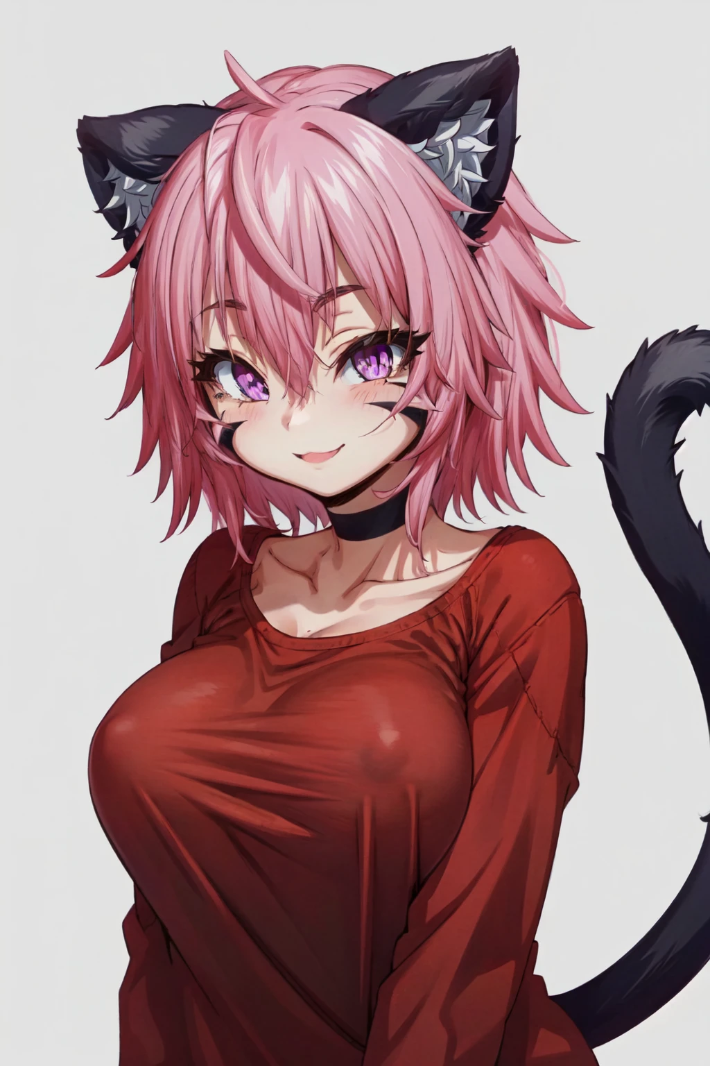 Prompts are : Nia, 1girl, pink hair, short hair, messy hair, cat ears, cat tail, purple eyes, facial mark, large breasts