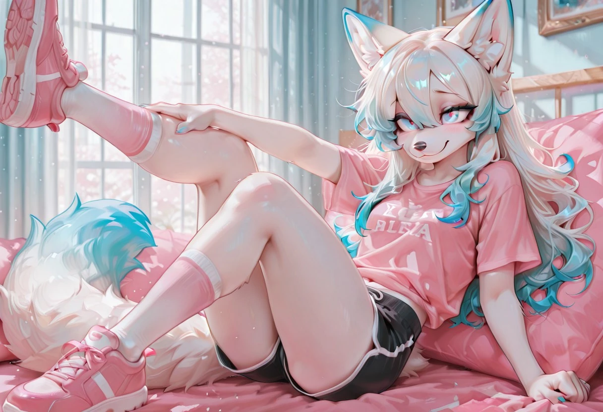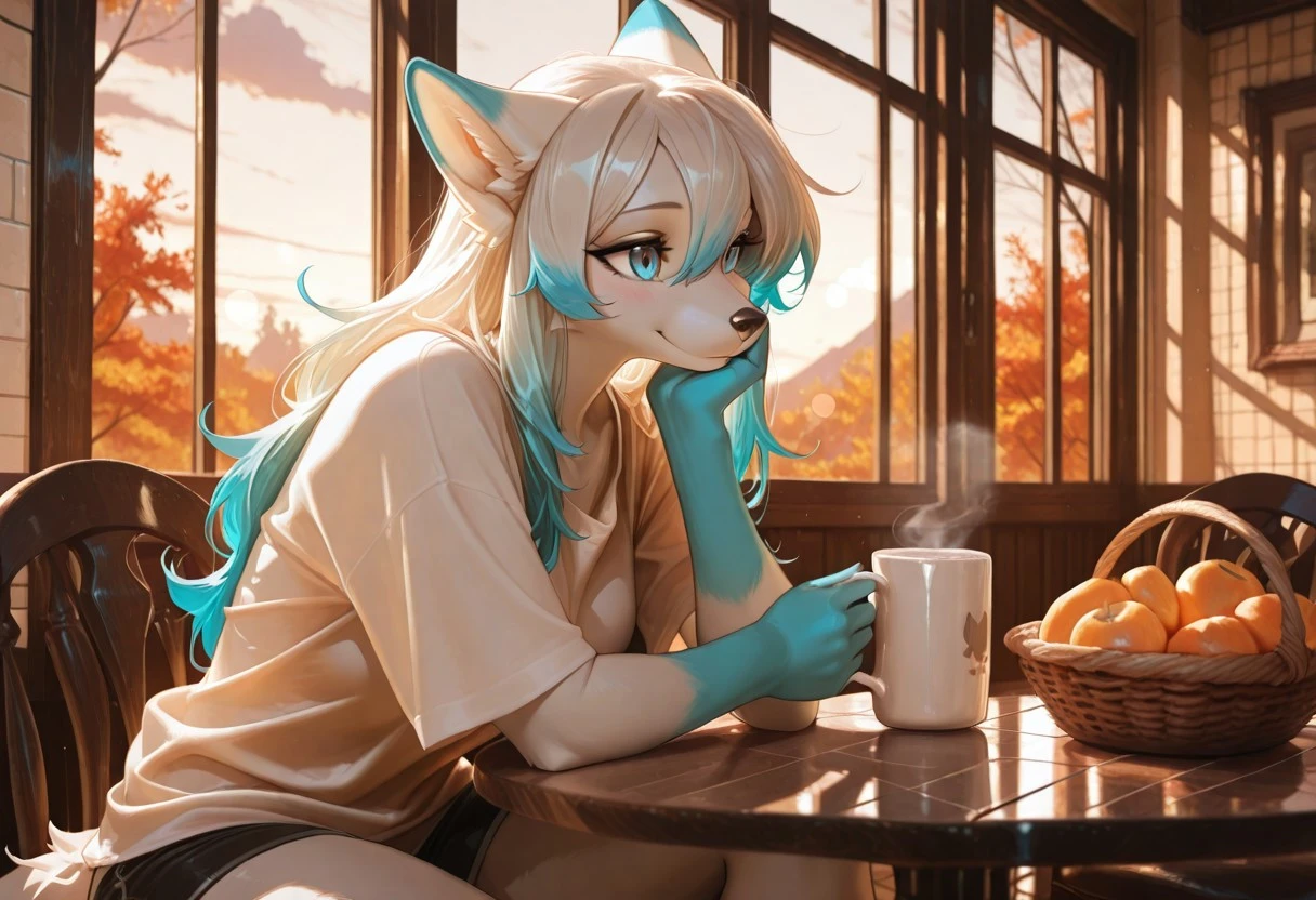 <oliena_fg> white fur, white blue gradient hair, blue eyes,