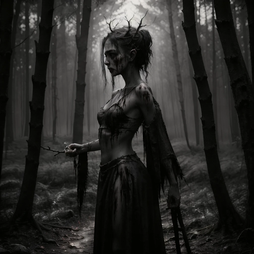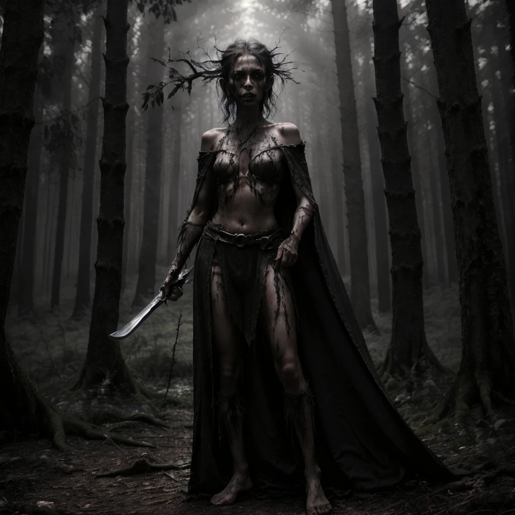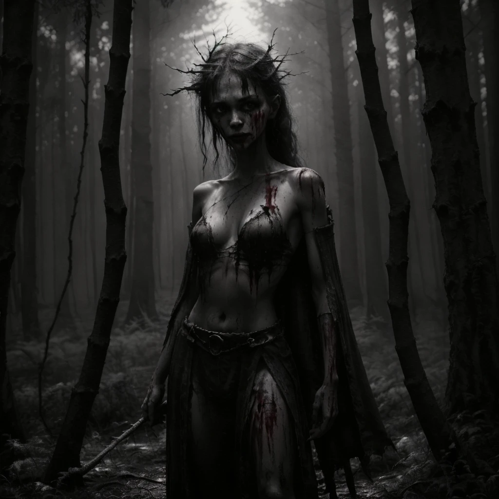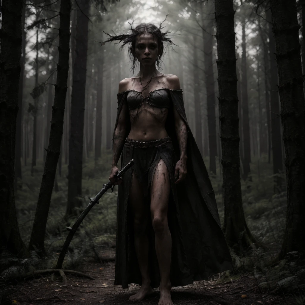 1girl, 1other, antlers, arms at sides, bare shoulders, barefoot, belt, black dress, black hair, blindfold, blood, blood on clothes, blood on face, boots, bracelet, branch, breasts, cape, cleavage, closed mouth, collarbone, crown, dark, dirty, dirty feet, dress, facing viewer, fog, forest, from side, full body, gloves, grass, hair bun, holding, holding staff, holding sword, holding weapon, hood, jewelry, long hair, looking at viewer, mask, medium breasts, midriff, nature, navel, navel piercing, necklace, ???????, outdoors, pale skin, ponytail, profile, realistic, short hair, sickle, single hair bun, skirt, skull, solo, staff, standing, strapless, sword, tree, tube top, underboob, upper body, ur black druid, walking, weapon, white hair,Description