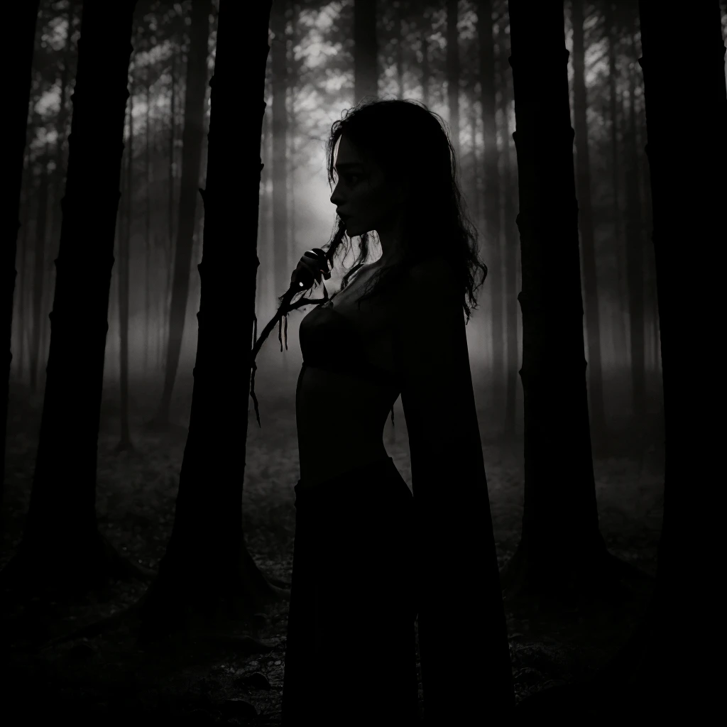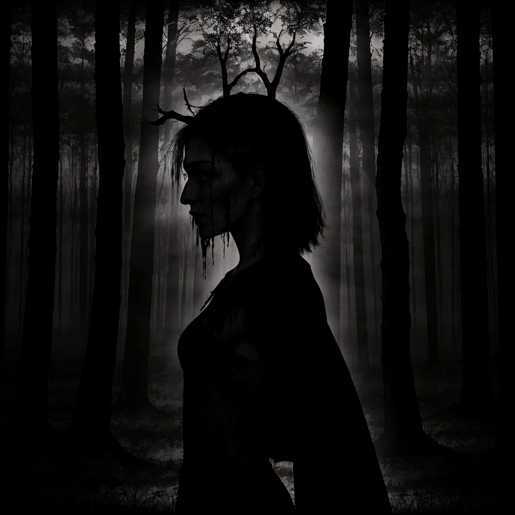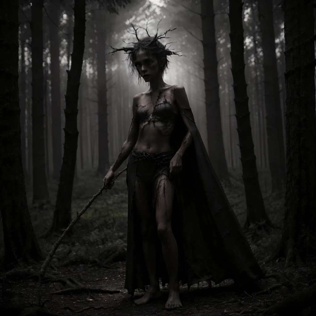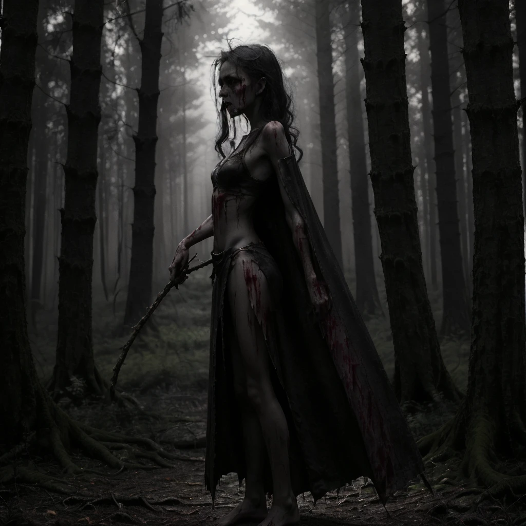 1girl, 1other, antlers, arms at sides, bare shoulders, barefoot, belt, black dress, black hair, blindfold, blood, blood on clothes, blood on face, boots, bracelet, branch, breasts, cape, cleavage, closed mouth, collarbone, crown, dark, dirty, dirty feet, dress, facing viewer, fog, forest, from side, full body, gloves, grass, hair bun, holding, holding staff, holding sword, holding weapon, hood, jewelry, long hair, looking at viewer, mask, medium breasts, midriff, nature, navel, navel piercing, necklace, ???????, outdoors, pale skin, ponytail, profile, realistic, short hair, sickle, single hair bun, skirt, skull, solo, staff, standing, strapless, sword, tree, tube top, underboob, upper body, ur black druid, walking, weapon, white hair,Description