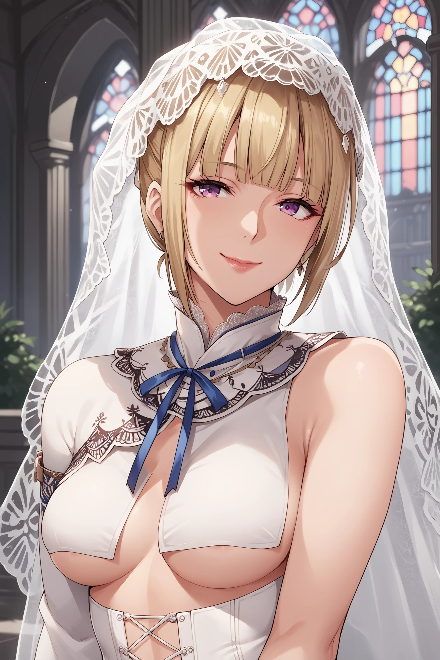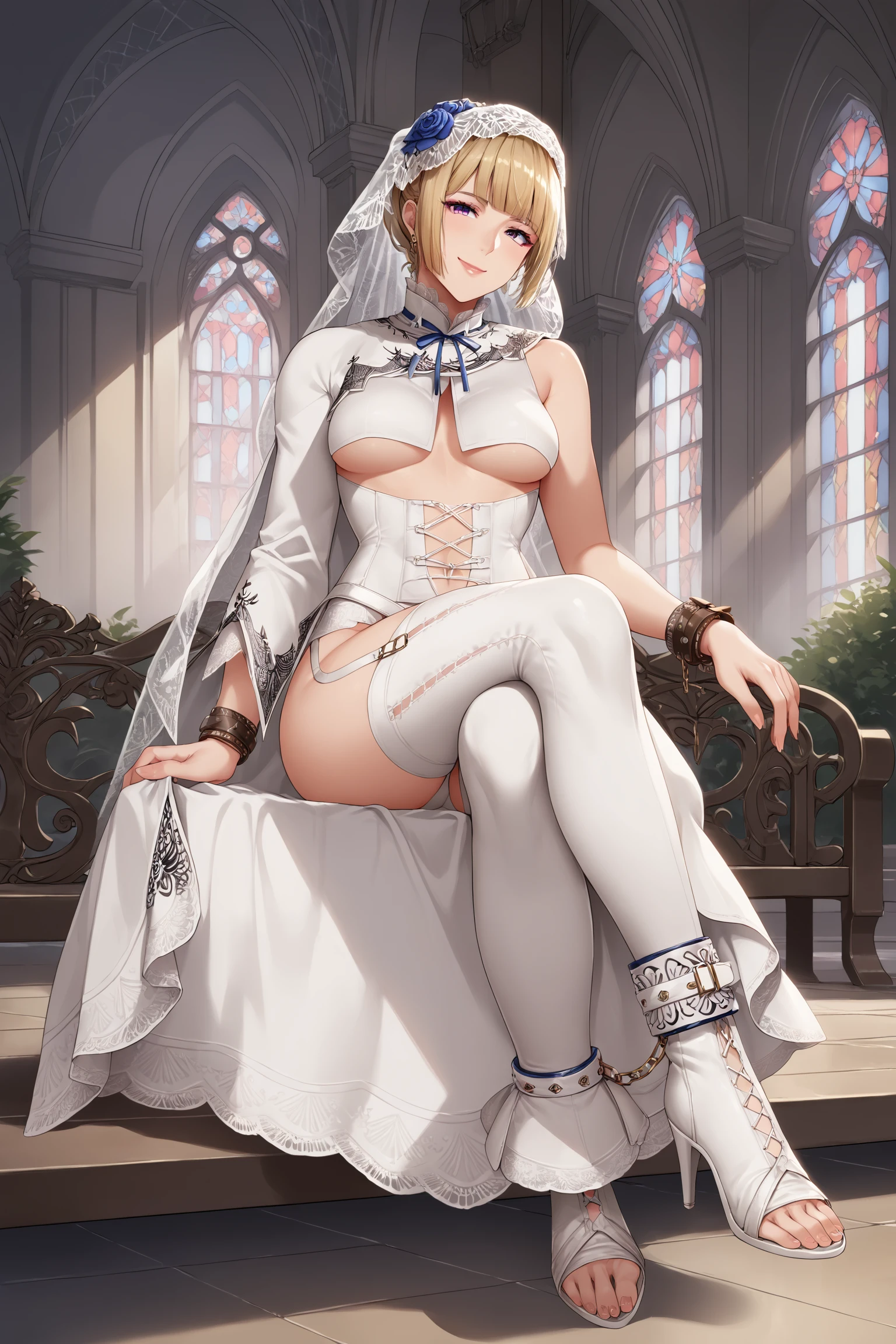 lilibride, short hair, blonde hair, short ponytail, sidelocks, blunt bangs, purple eyes, makeup, eyeshadow, lips, tiara, hair flower, bridal veil, single sleeve, white shirt, underboob, wrist cuffs, bracelet, blue neck ribbon, clothing cutout, belt, white pants, thigh cutout, ankle cuffs, anklet, white footwear, high heel boots