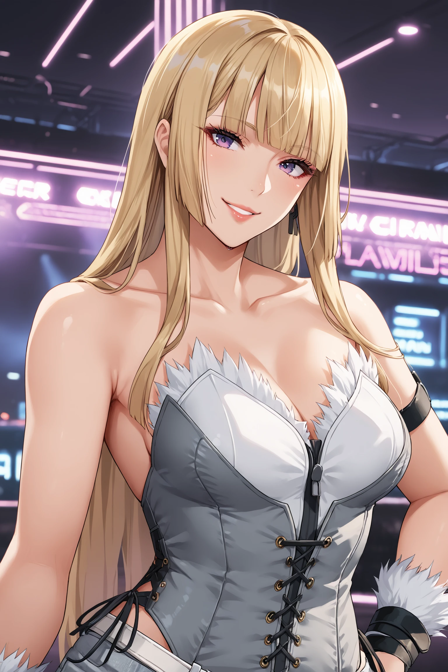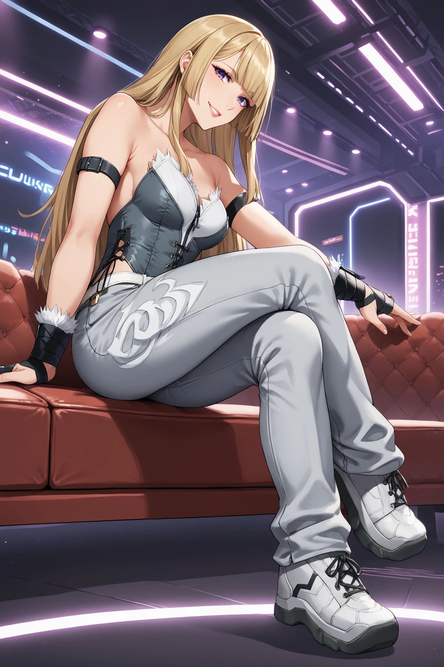 lilit5p1, long hair, hime cut, blonde hair, blunt bangs, purple eyes, makeup, eyeshadow, lips, bustier, strapless, sleeveless, fur trim, arm belt, black gloves, belt, grey pants, grey footwear, sneakers