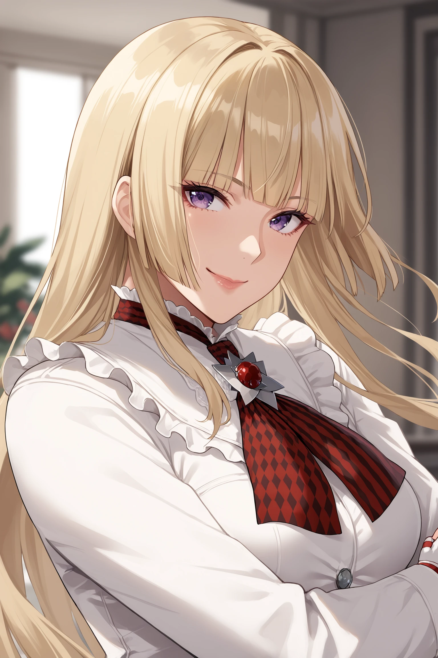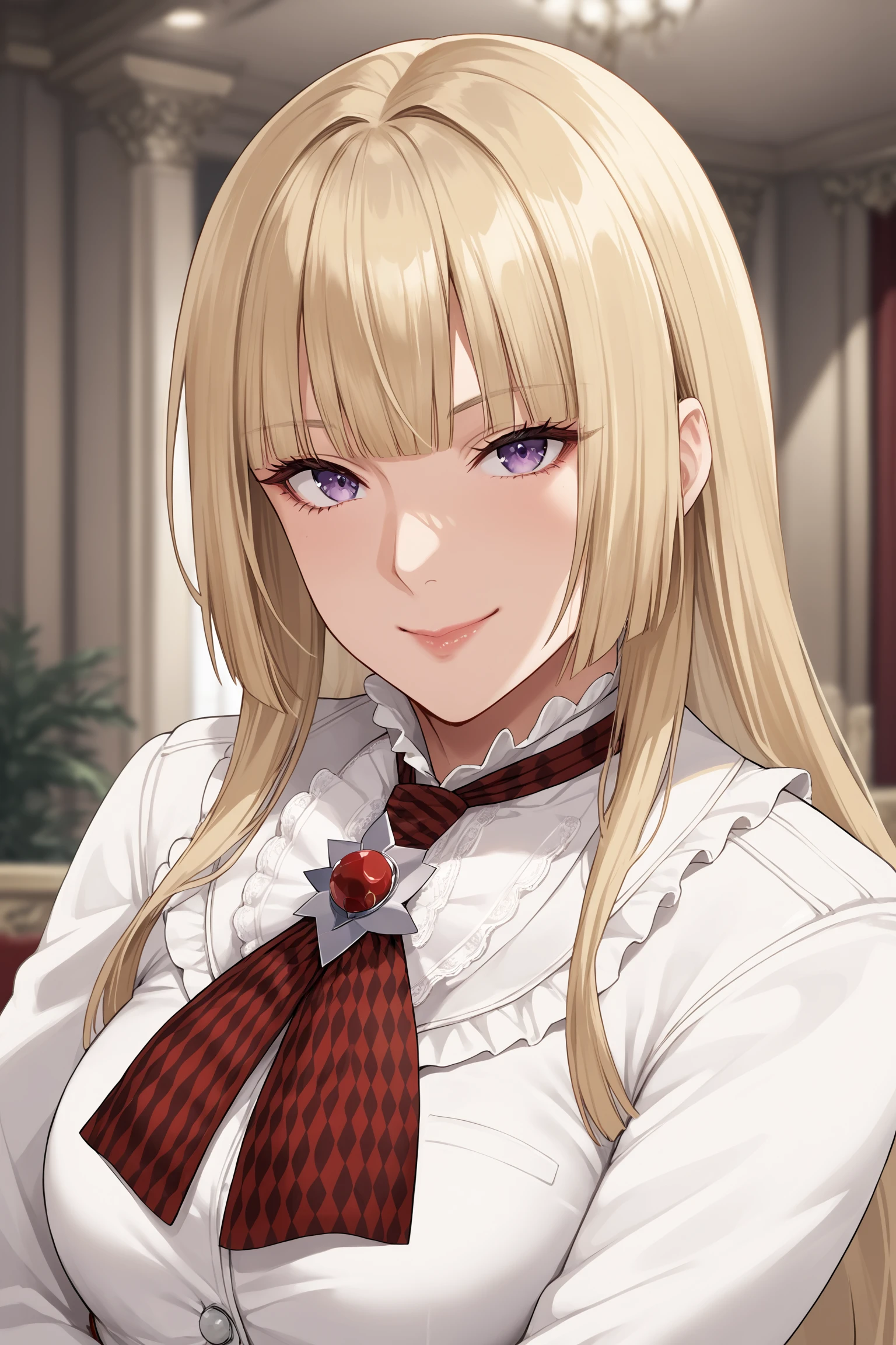 emilie de rochefort, long hair, hime cut, blonde hair, blunt bangs, purple eyes, makeup, eyeshadow, lips, white dress, white jacket, white skirt, frills, frilled dress, white gloves, fingerless gloves, brooch, red neckerchief, white boots, knee boots