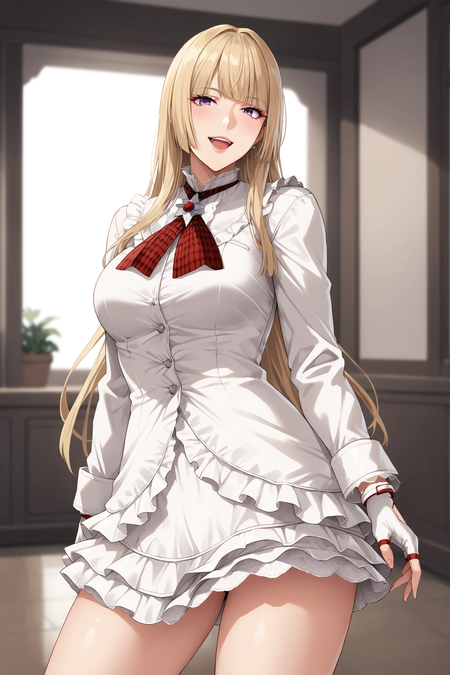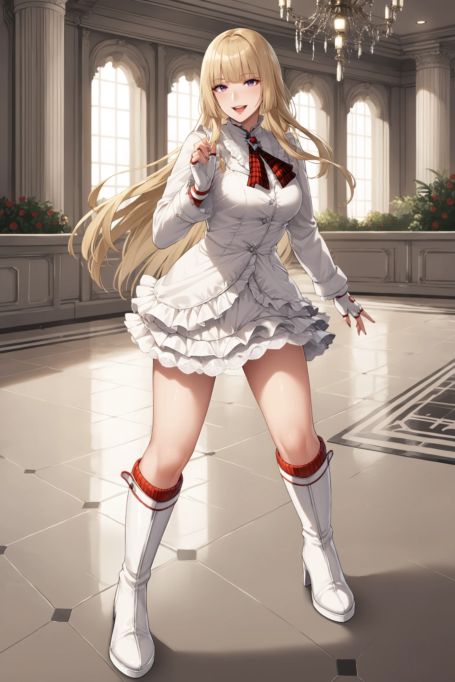 lilit5p2, long hair, hime cut, blonde hair, blunt bangs, purple eyes, makeup, eyeshadow, lips, white jacket, white skirt, frills, frilled jacket, frilled skirt, white gloves, fingerless gloves, brooch, red neckerchief, white footwear, knee boots, high heel boots