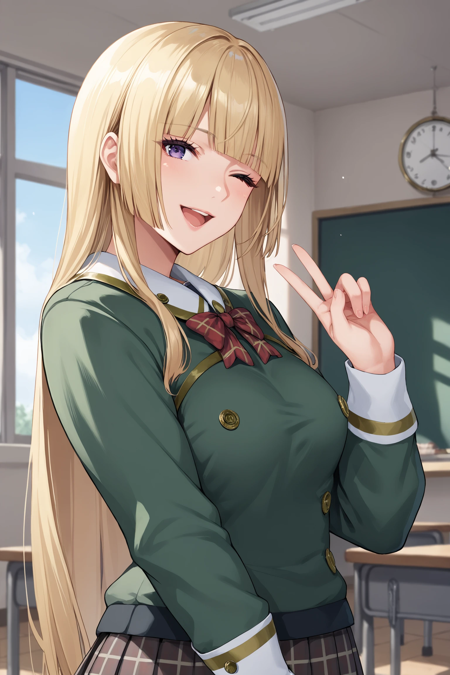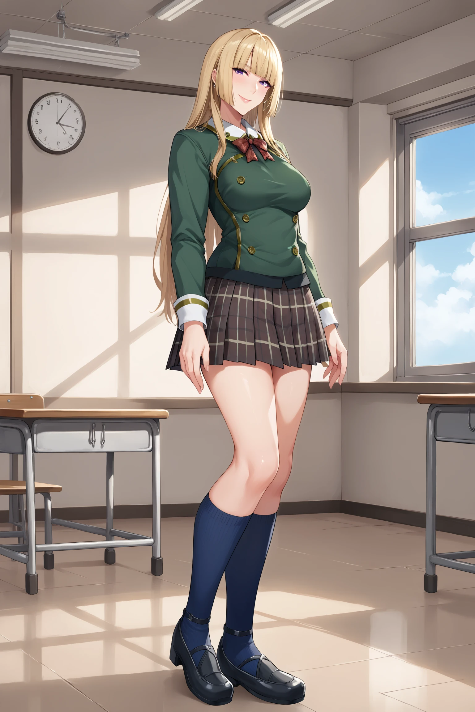 lilischool, long hair, hime cut, blonde hair, blunt bangs, purple eyes, makeup, eyeshadow, lips, long sleeves, green jacket, red bow, brown skirt, plaid skirt, pleated skirt, blue socks, kneehighs, black footwear, flats
