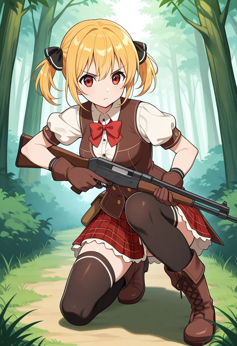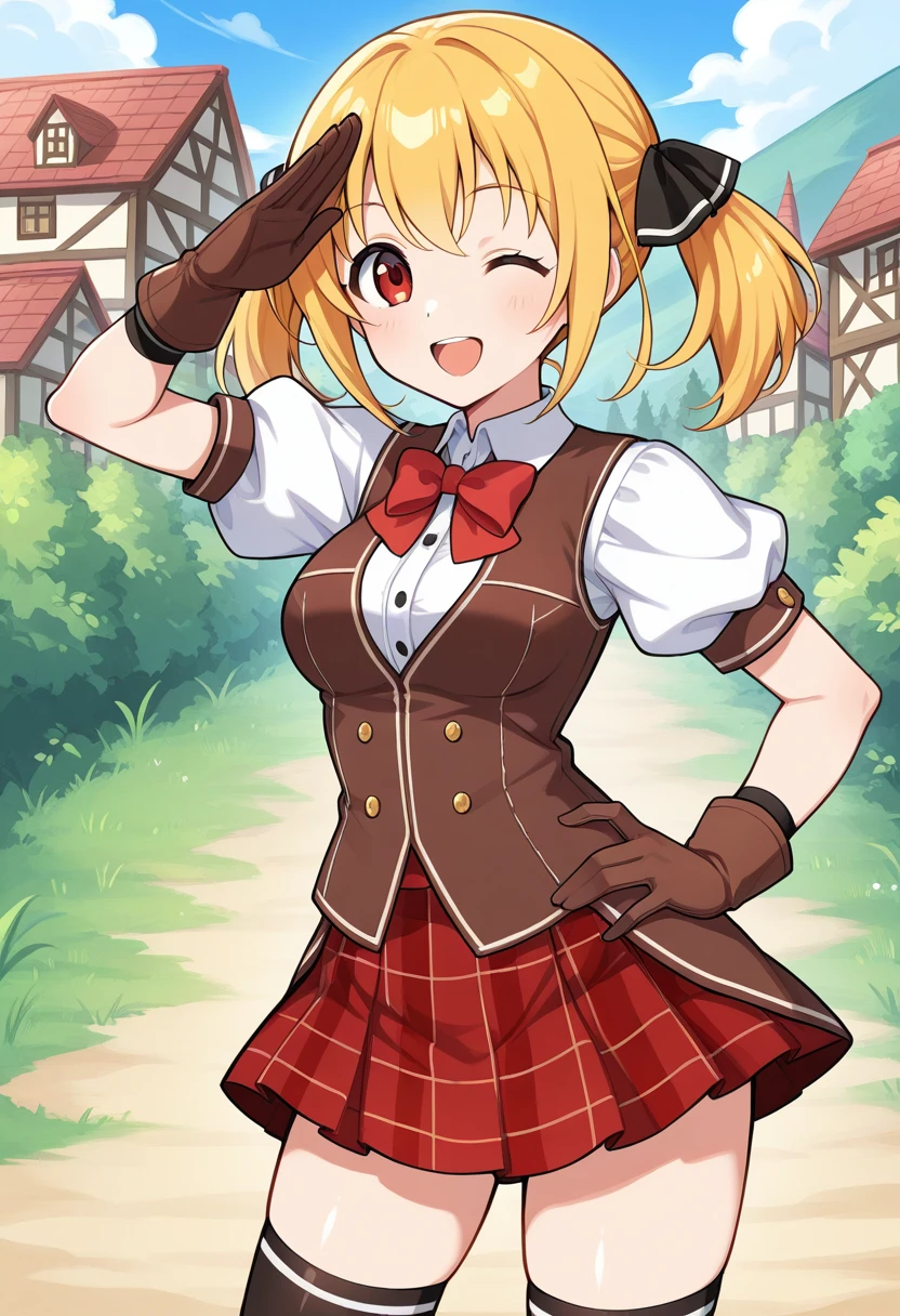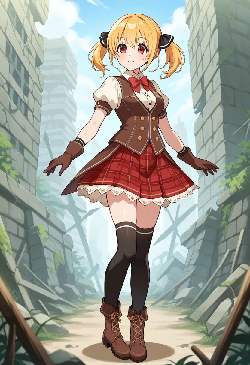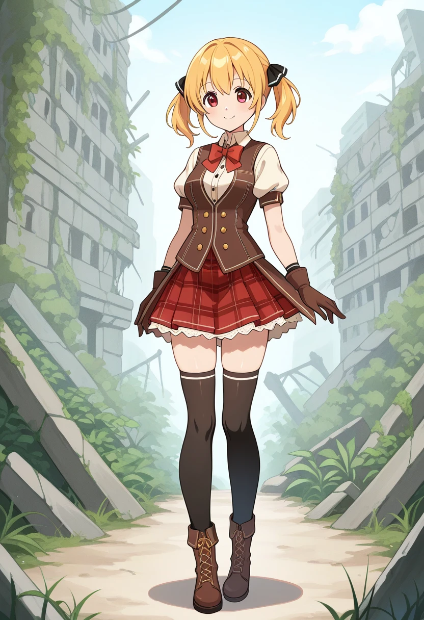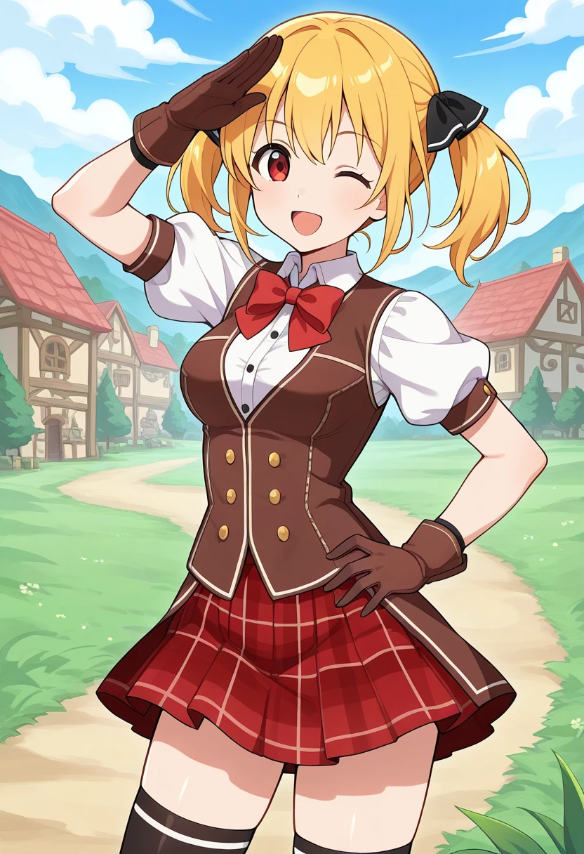 keywords: lorelumilanru, blonde hair, short twintails, hair ribbon, red eyes, bowtie, collared shirt, puffy short sleeves, vest, buttons, plaid skirt, thighhighs, gloves, boots,