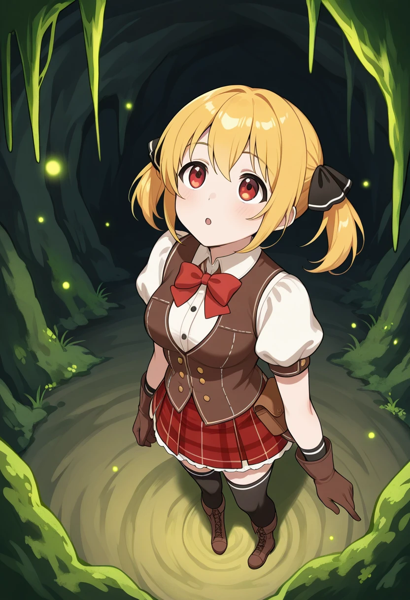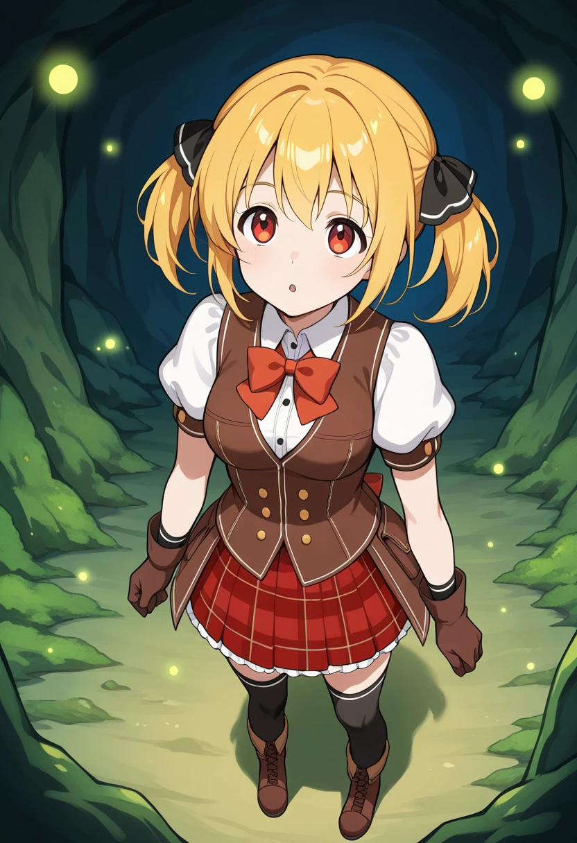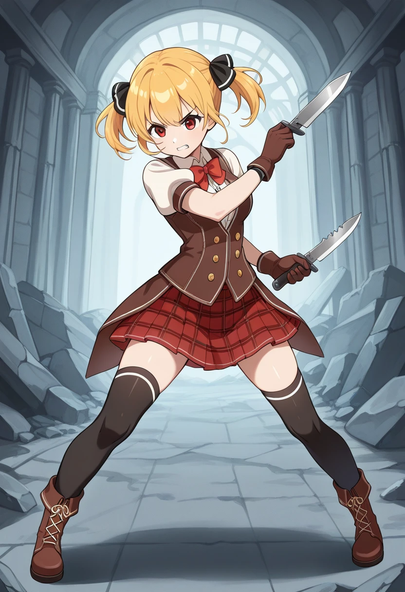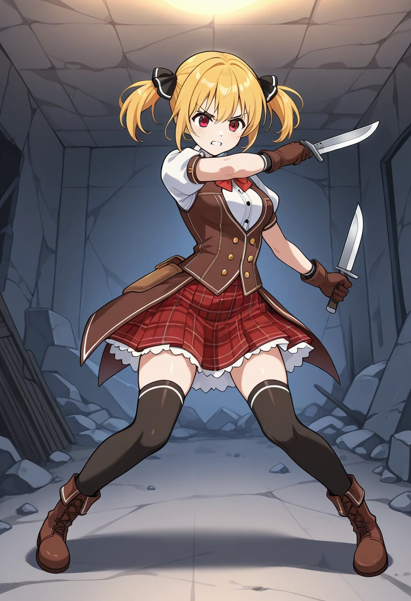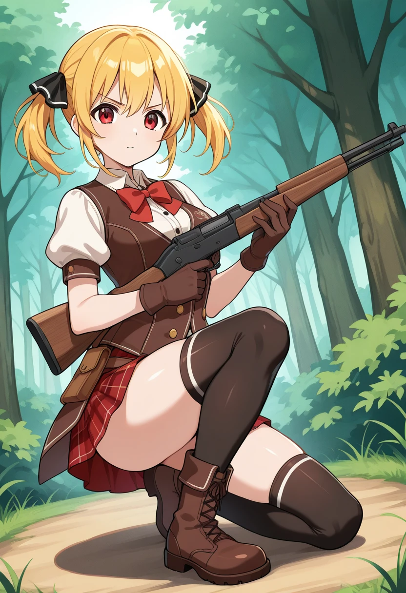 keywords: lorelumilanru, blonde hair, short twintails, hair ribbon, red eyes, bowtie, collared shirt, puffy short sleeves, vest, buttons, plaid skirt, thighhighs, gloves, boots,