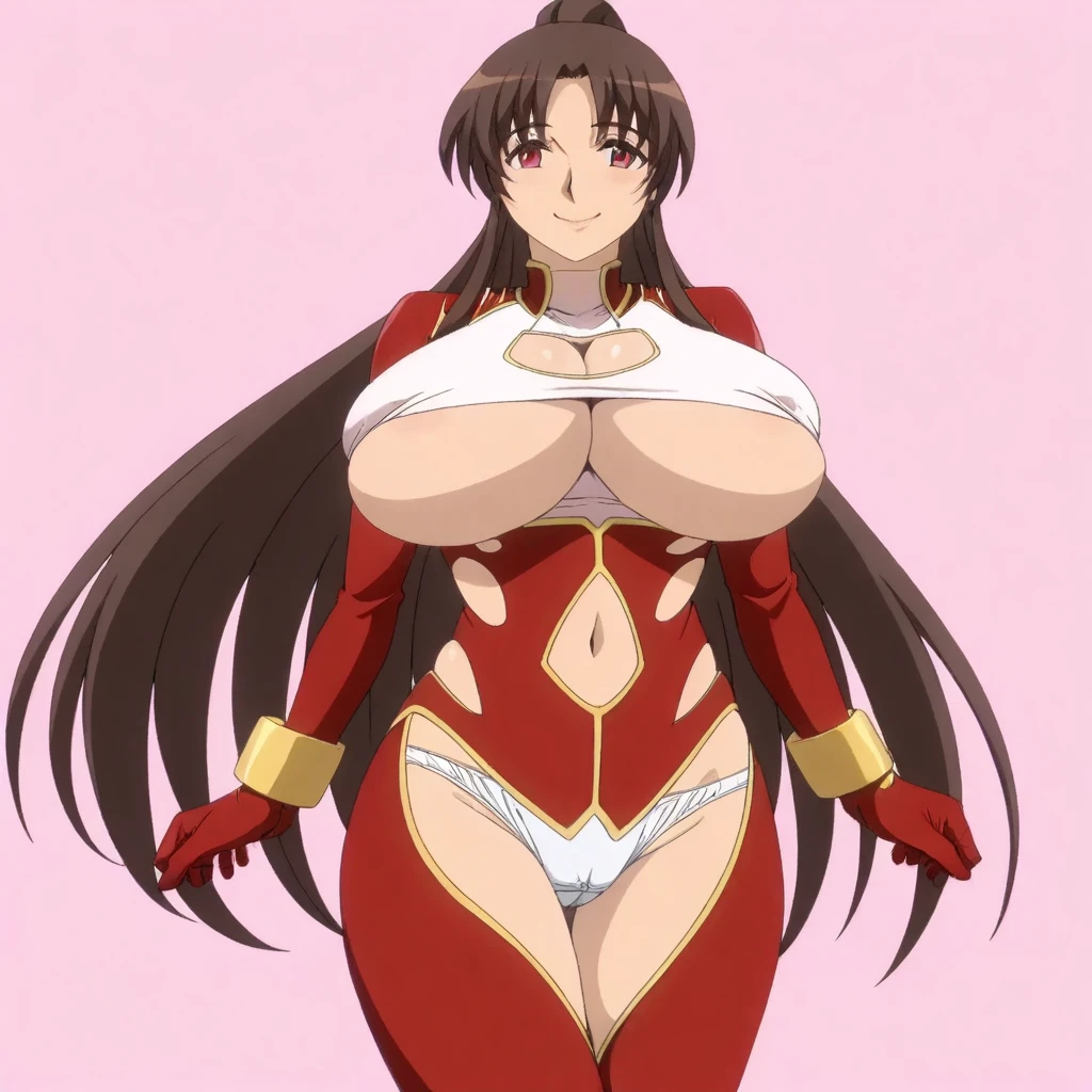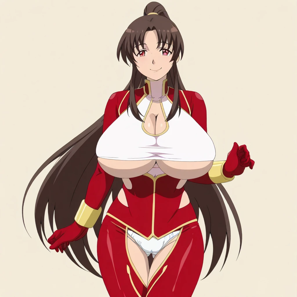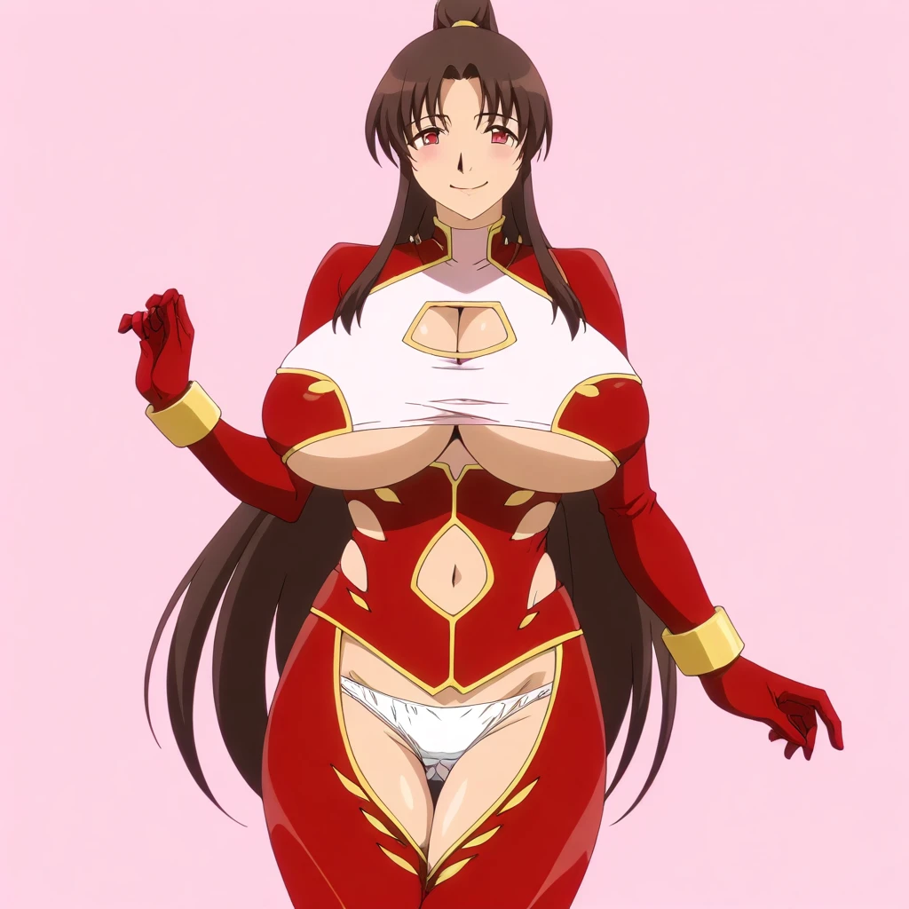 red jumpsuit, gold trim, white undershirt, clothing cutouts, cleavage, underboob, white panties, gold bracelets, red gloves,