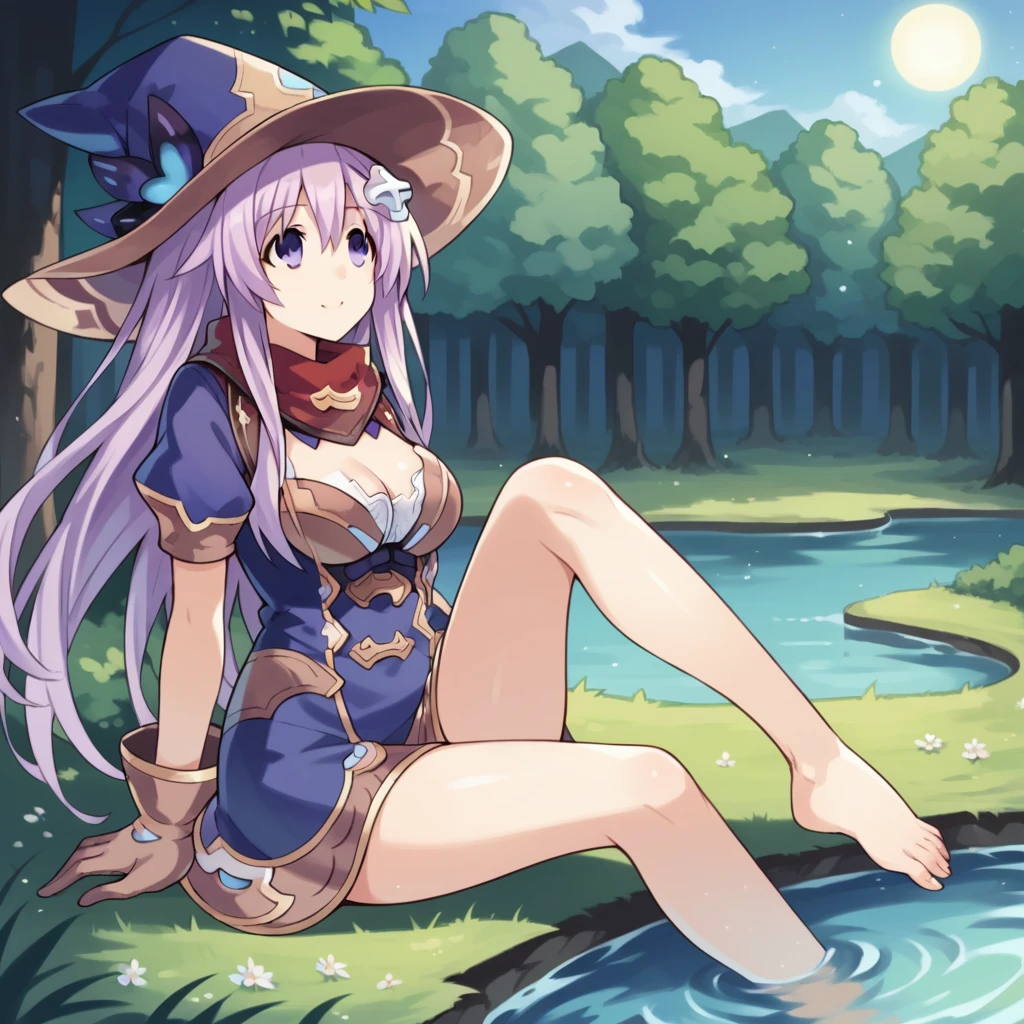 Nep_Wit, witch hat, blue dress, alt dress, gold trim, white shirt, cleavage, puffy short sleeves, brown gloves, blue sleeves, red scarf, hair ornament,Purple Sister (Pony)