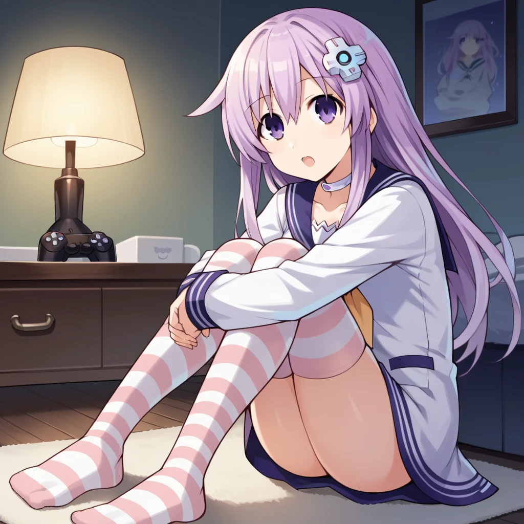 NpGr, Fol001, Np_Def, purple hair, purple eyes, nepgear, long hair, sailor dress, white dress, purple sailor collar, yellow neckerchief, white long sleeves, purple sleeve cuffs, d-pad hair ornament, white choker, purple trim, thigh holster, striped thighhighs, white thighhighs, pink thighhighs, ankle boots, white footwear,Witch Outfit: