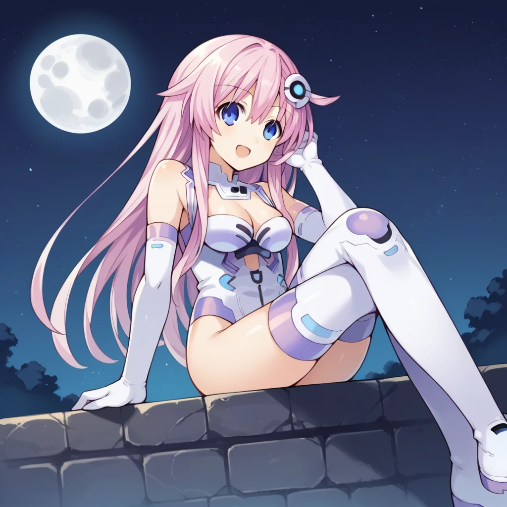 NpGr, Fol004, Np_Cpu, nepgear, pink hair, blue eyes, circle hair ornament, white hair ornament, white leotard, sleeveless turtleneck leotard, cleavage cutout, bare shoulders, covered navel, clothing cutout, thigh boots, white legwear, white elbow gloves, alt purple trim,Alt Outfit: