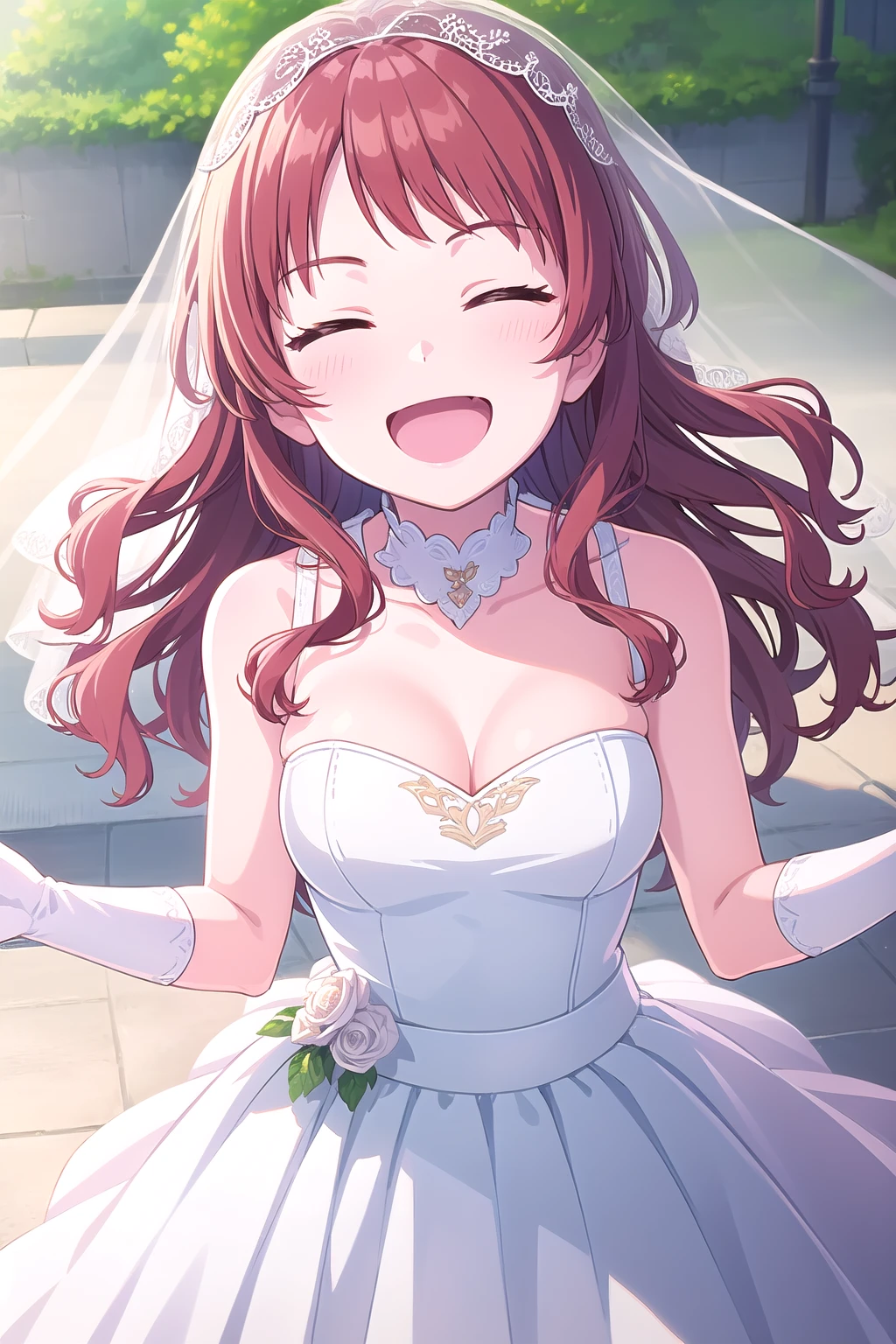 red hair, double bun, two side up, bangs, wavy hair, medium hair, purple eyes