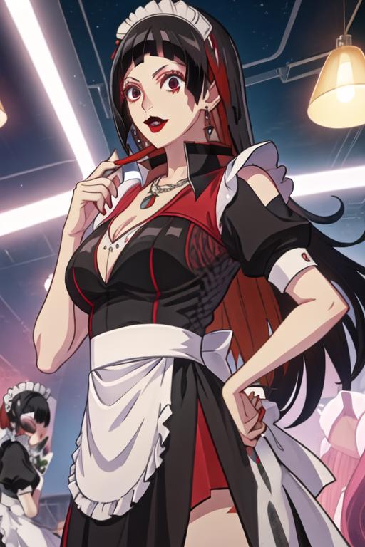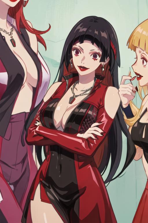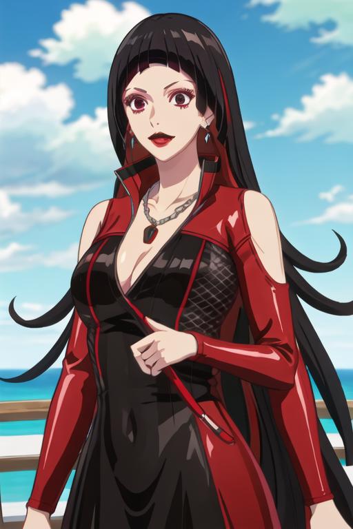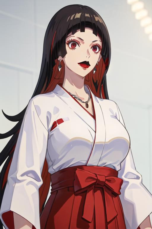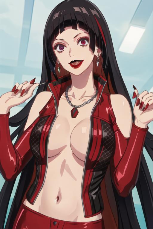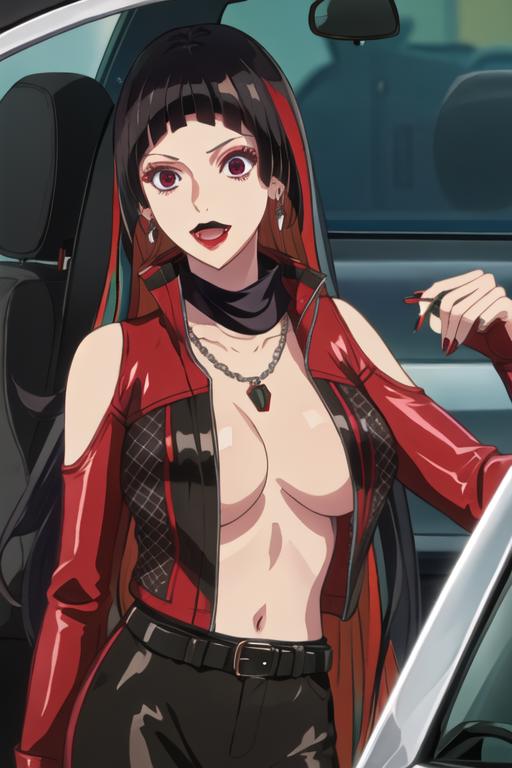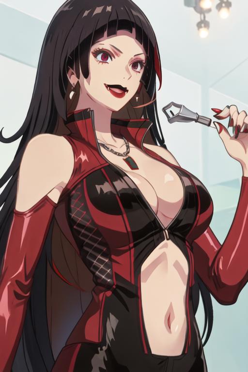 black_hair, jewelry, makeup, red_eyes, open_mouth, long_hair, lipstick, necklace, bangs, earrings, blunt_bangs, multicolored_hair, breasts