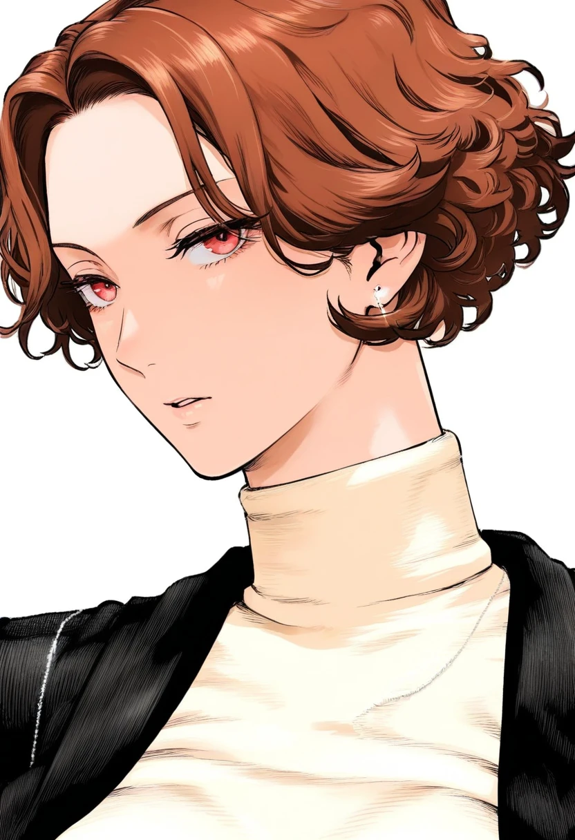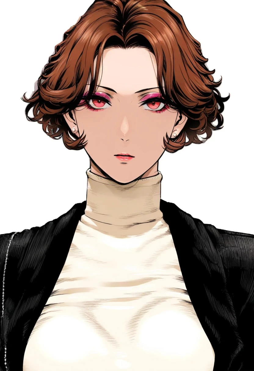 oc1,1girl,solo,white skirt,high heels,thigh boots,boots,black footwear,high heel boots,thighhighs,white skirt,turtleneck,short hair,,sweater,jewelry,black thighhighs,turtleneck sweater,makeup,red eyes,brown hair,black jacket,