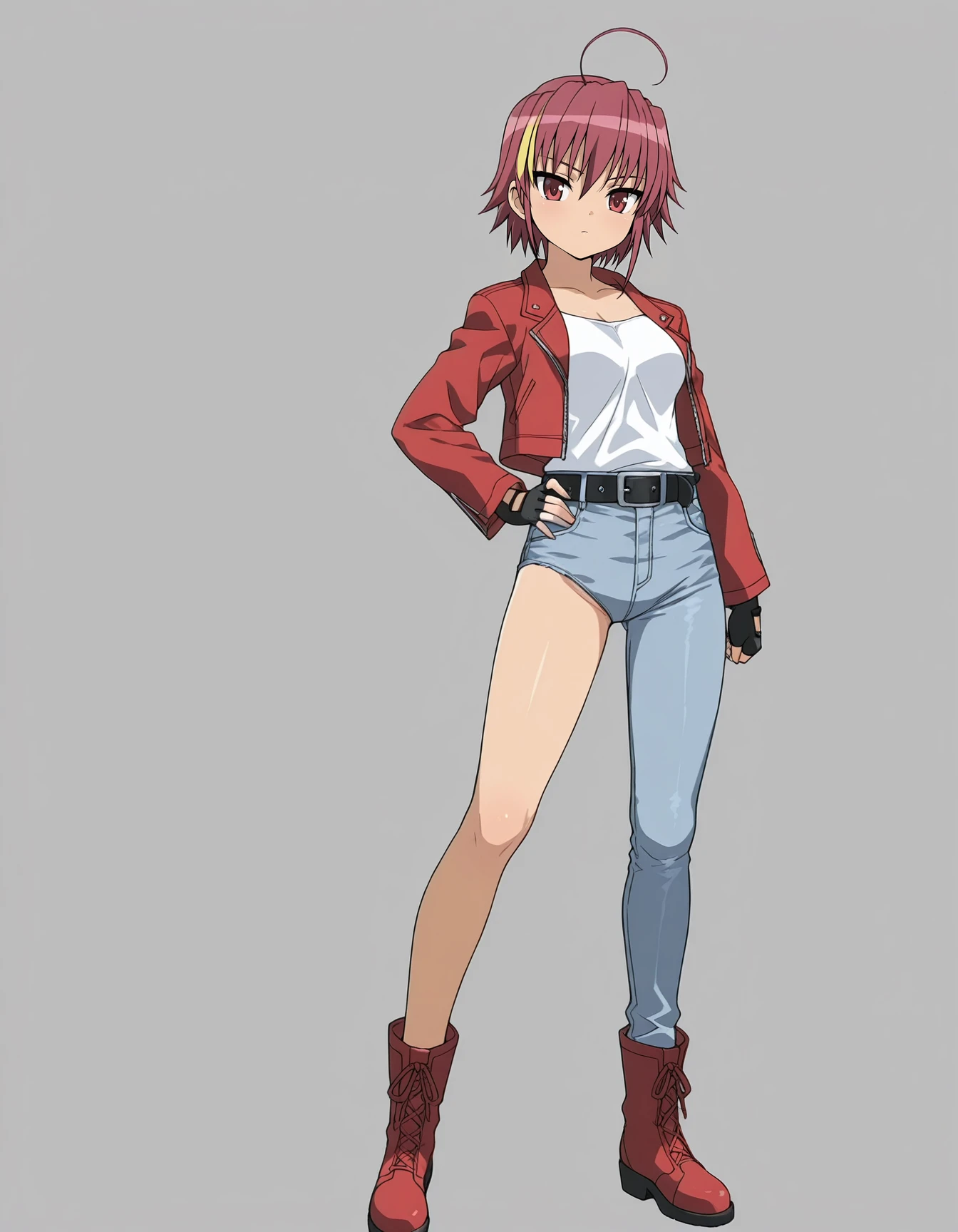 mai_nwef,mai_akanenw,short_hair,ahoge,red_hair,streaked_hair,red_eyes,red_jacket,fingerless_gloves,belt,red_boots,jeans,single_pantsleg