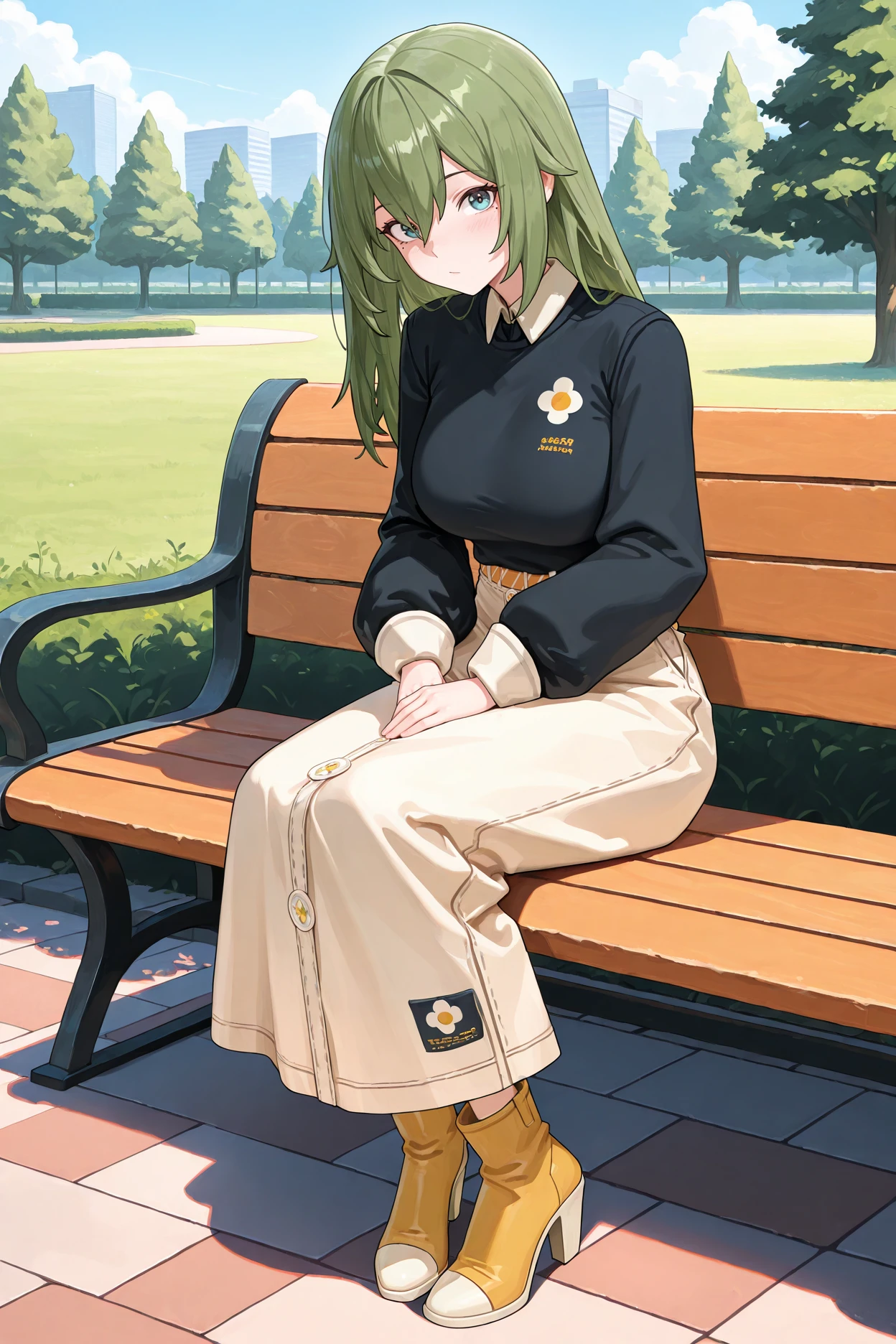 collared shirt,blue black shirt,black sweater,belt,skirt,white beige skirt,yellow boots,short heels,