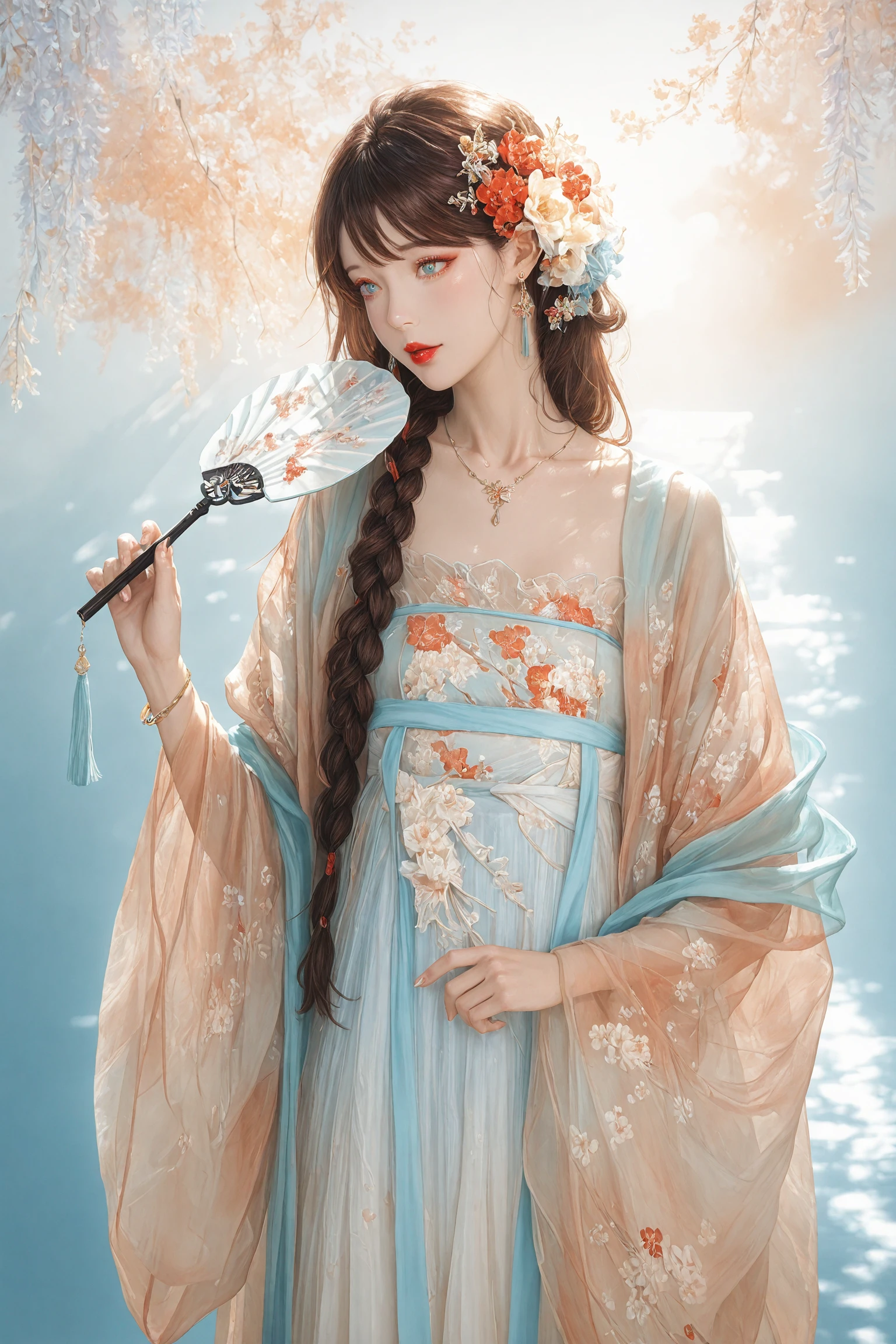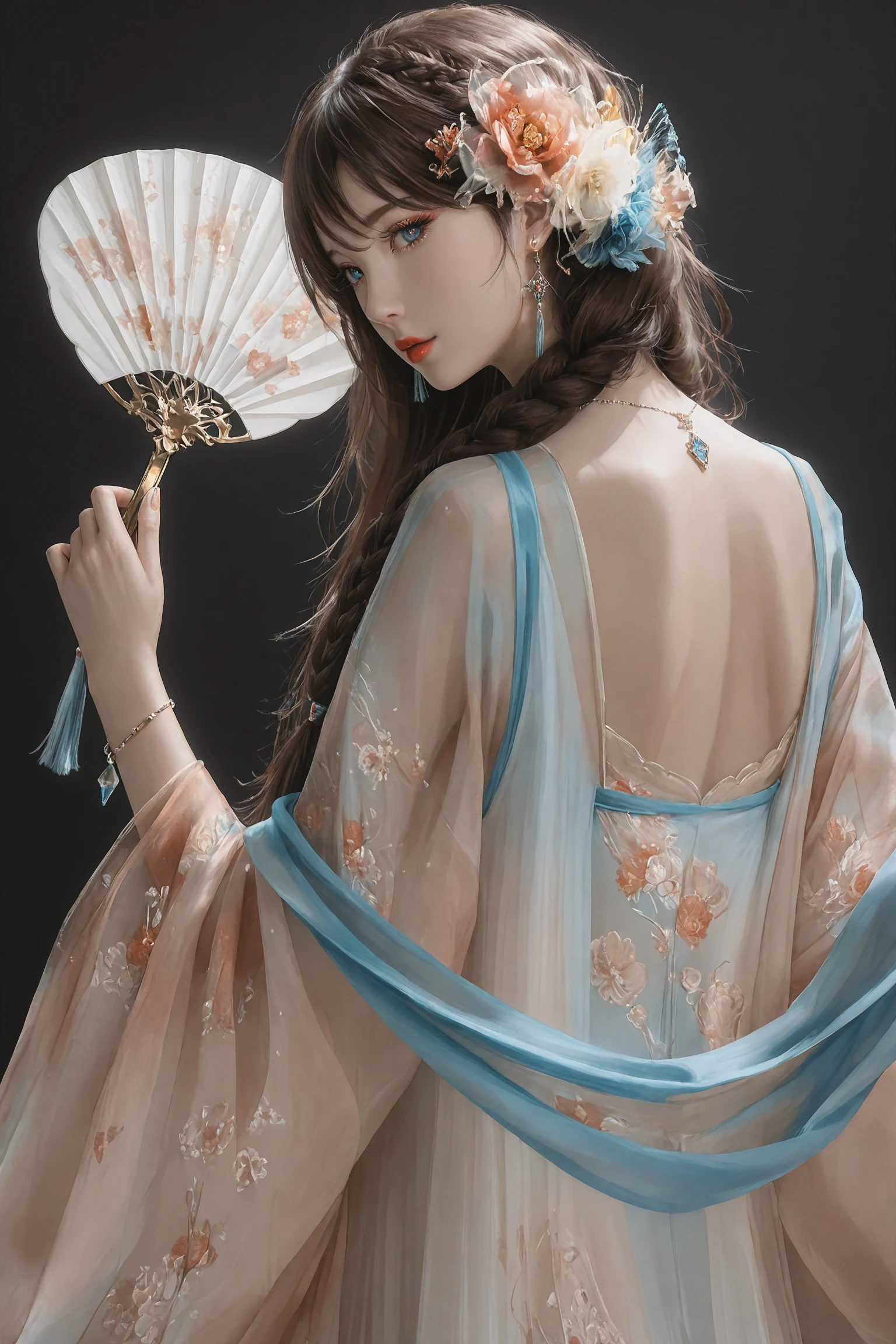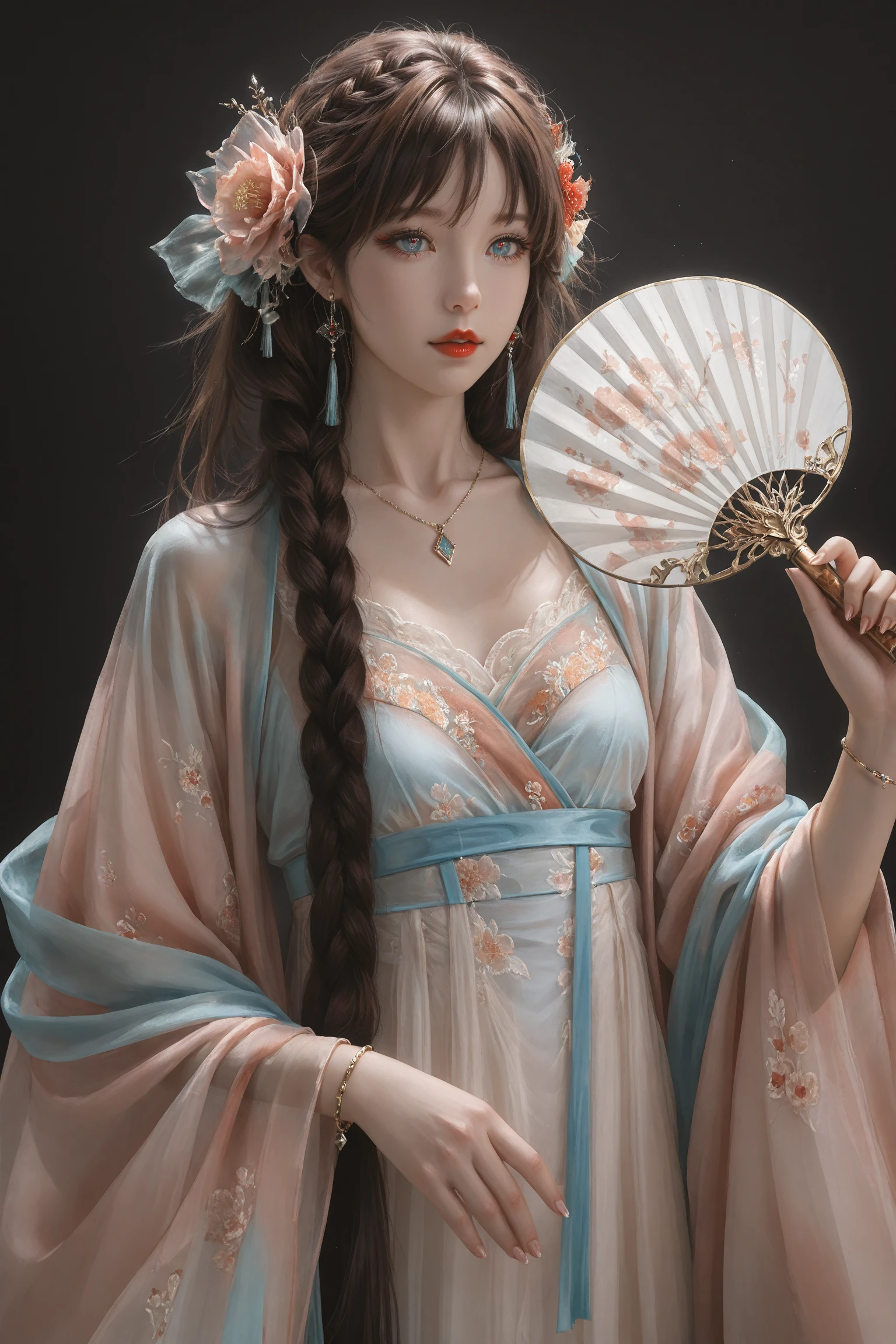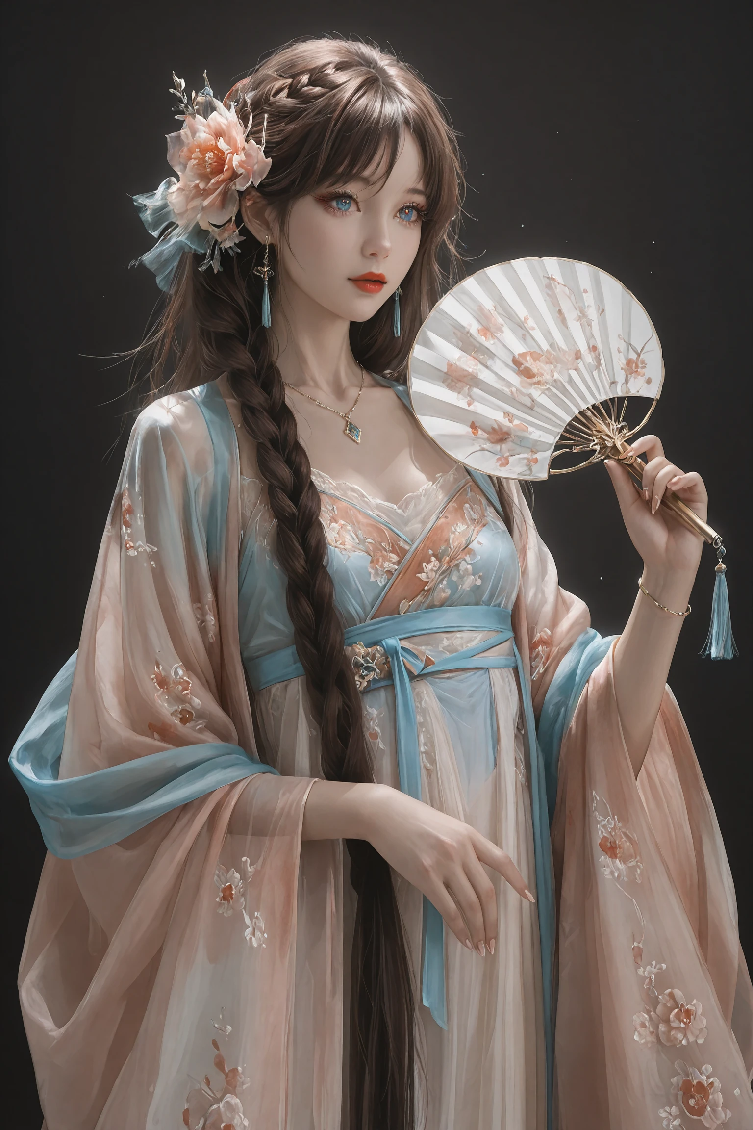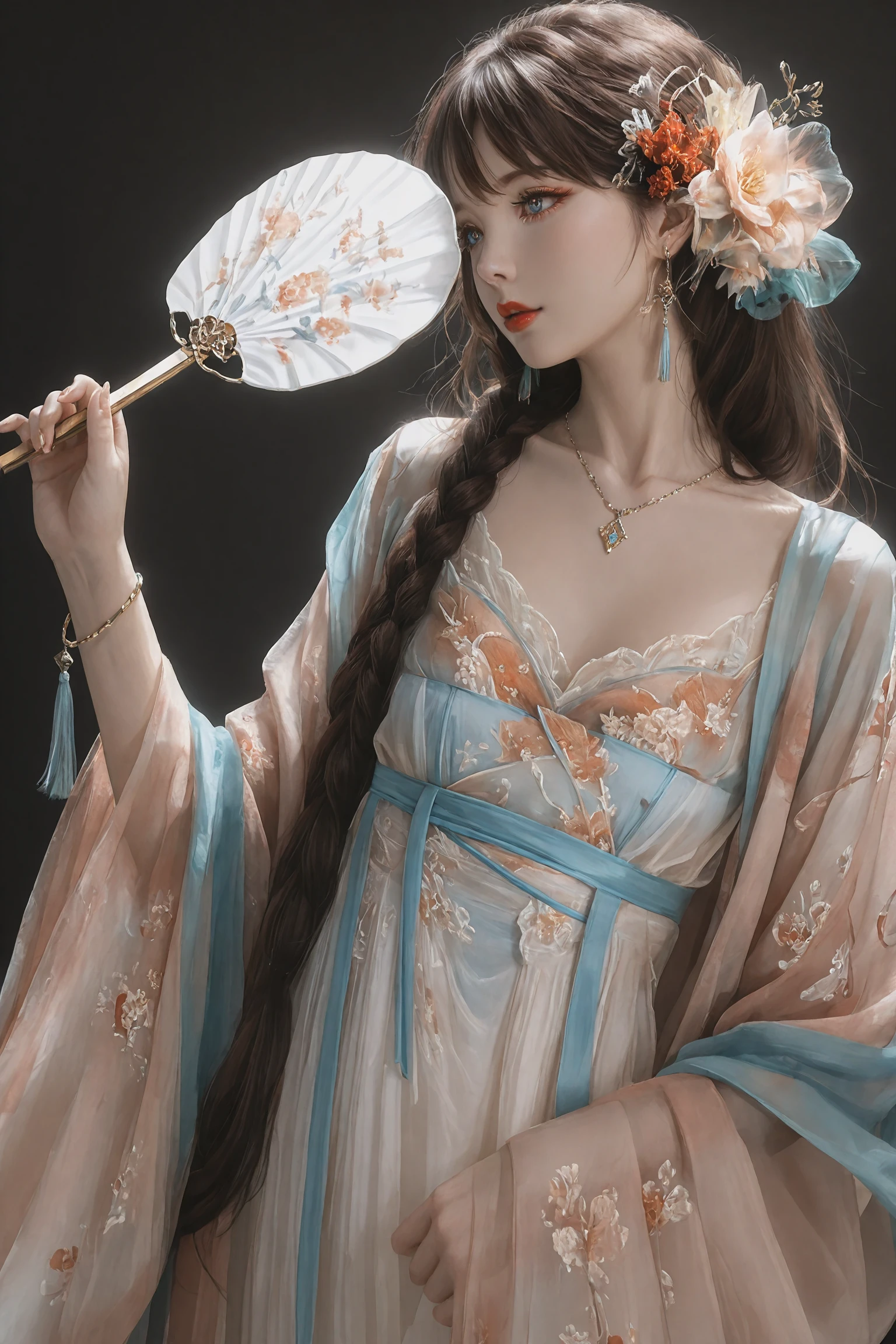 Aurelia Laniyi of the Golden Carp,jewelry,long hair,hanfu,dress,hair ornament,chinese clothes,earrings,necklace,shawl,bracelet,hair flower,realistic,red lips,long sleeves,holding fan,wide sleeves,hand fan,see-through,haori,lipstick,makeup,floral print,hagoromo