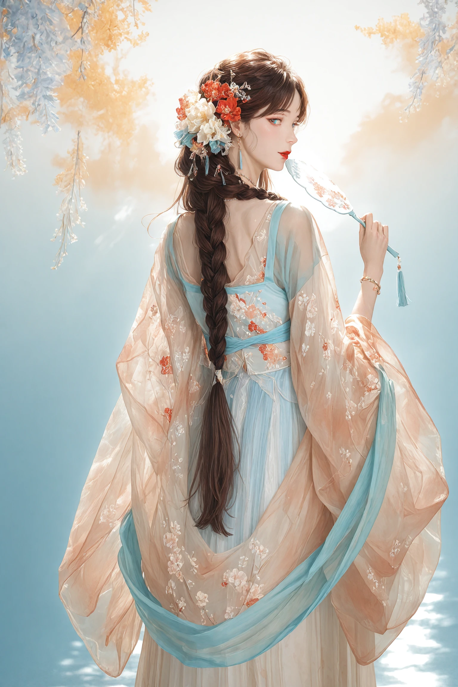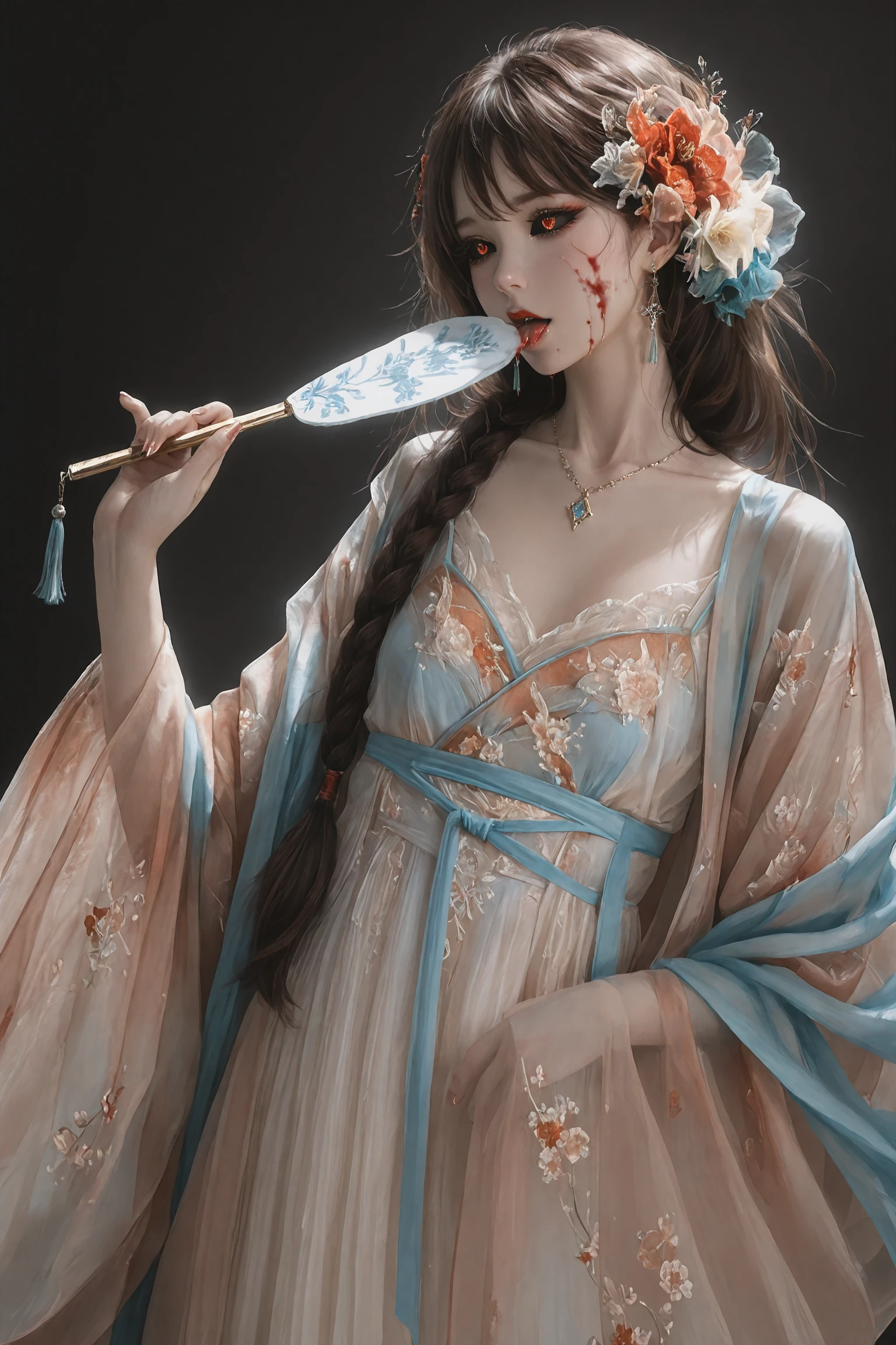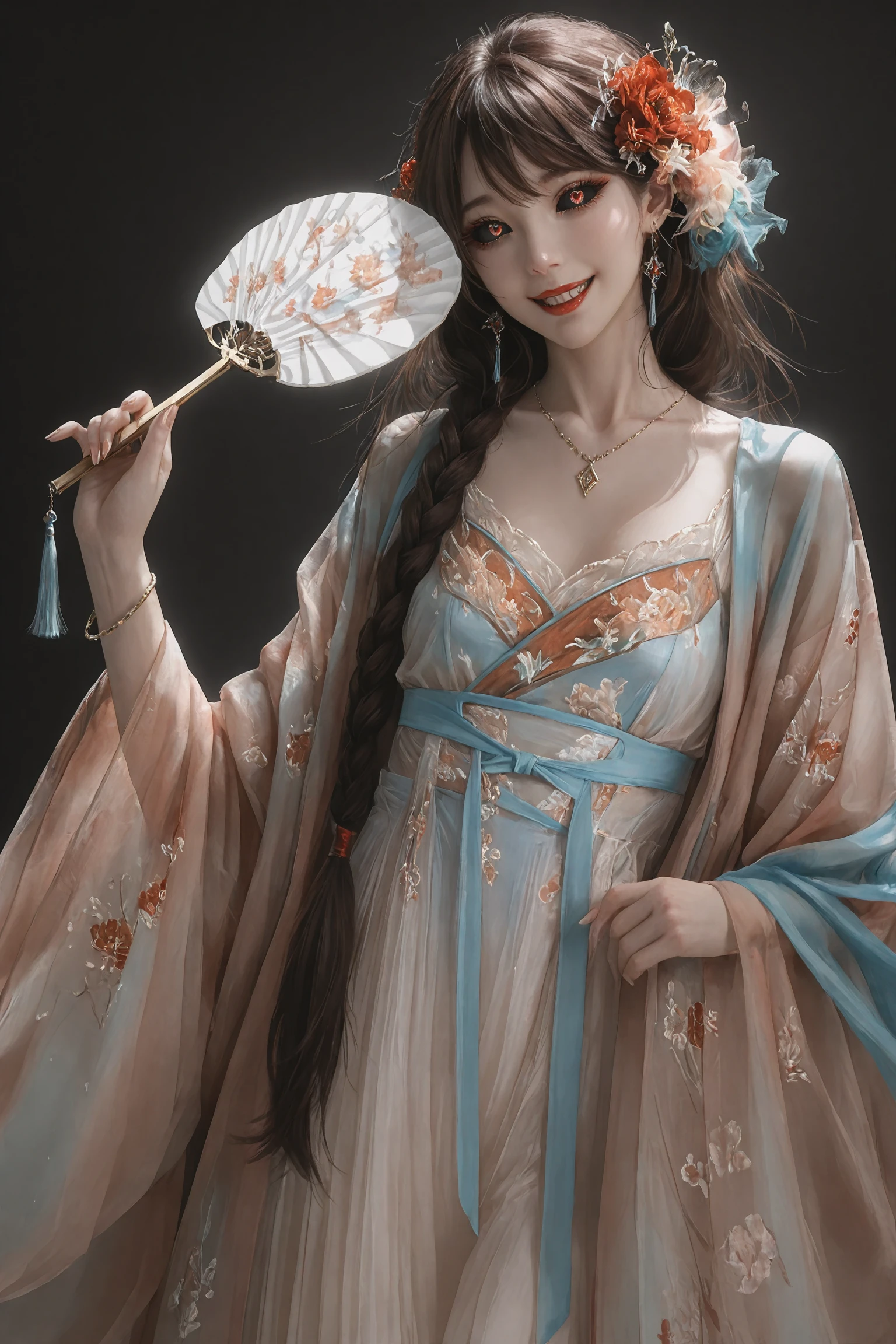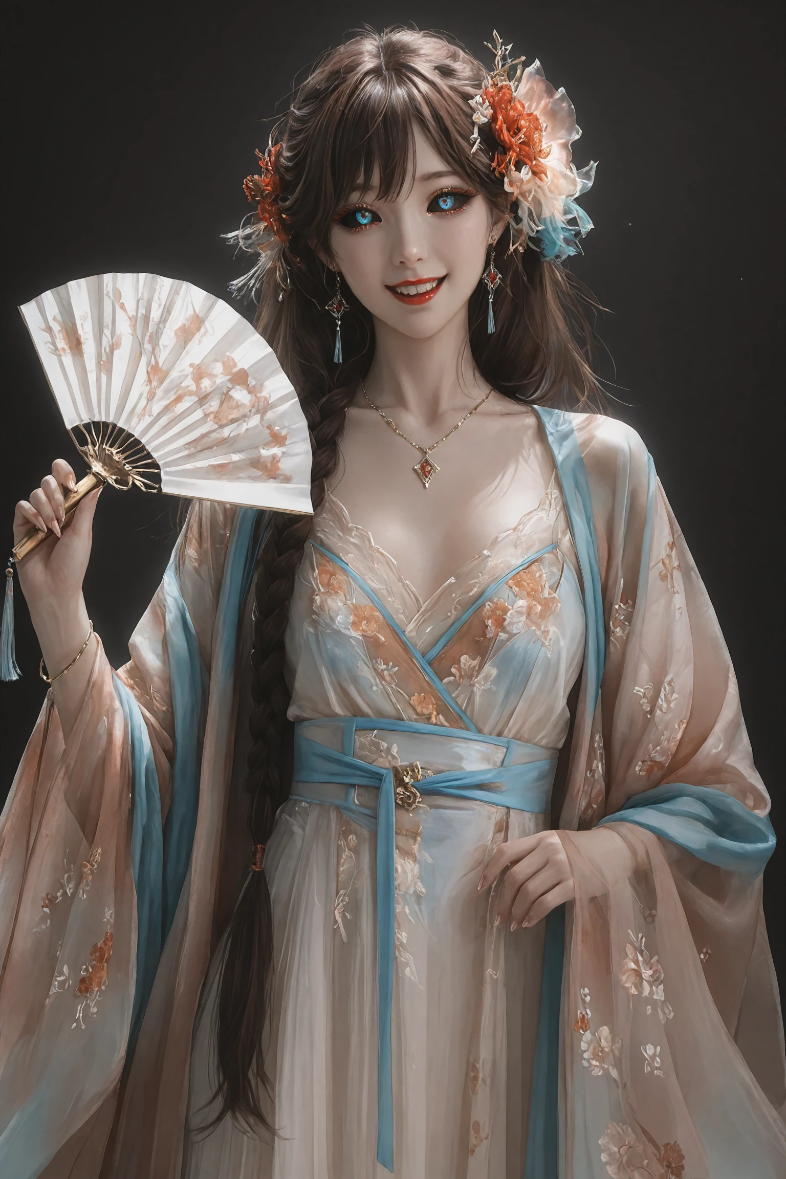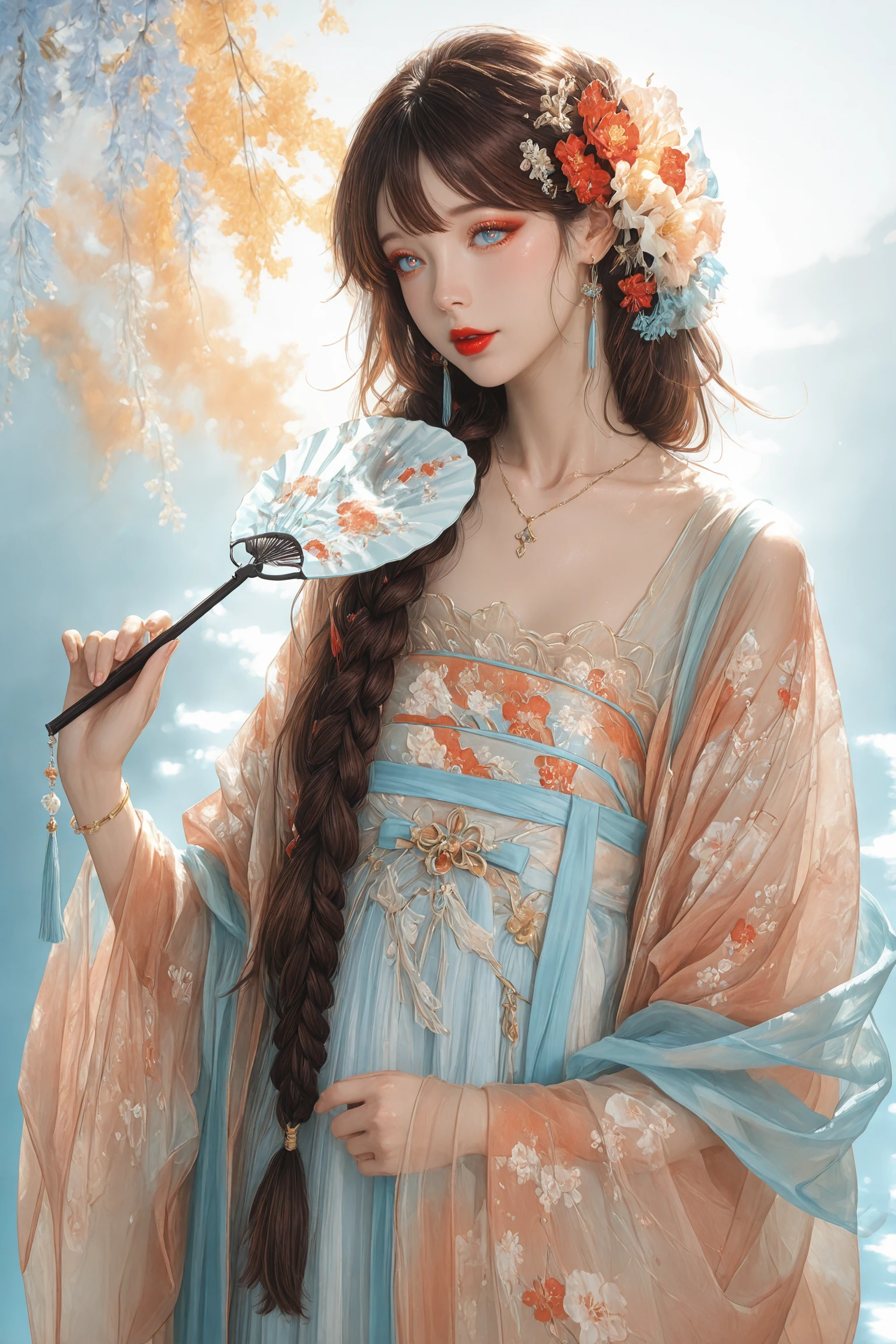 Aurelia Laniyi of the Golden Carp,jewelry,long hair,hanfu,dress,hair ornament,chinese clothes,earrings,necklace,shawl,bracelet,hair flower,realistic,red lips,long sleeves,holding fan,wide sleeves,hand fan,see-through,haori,lipstick,makeup,floral print,hagoromo