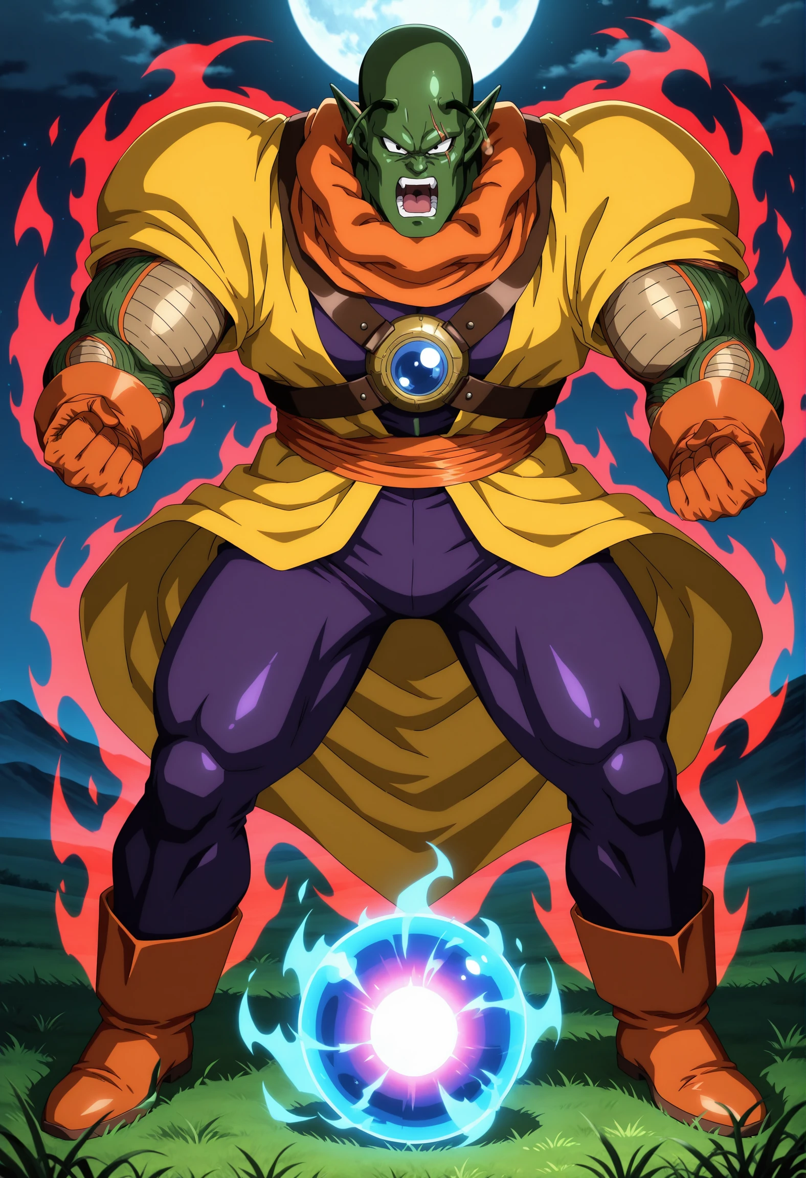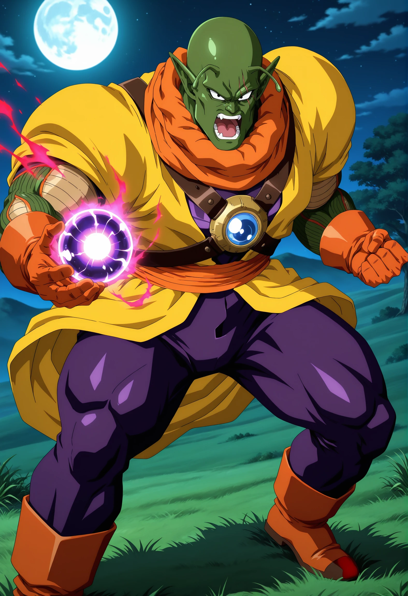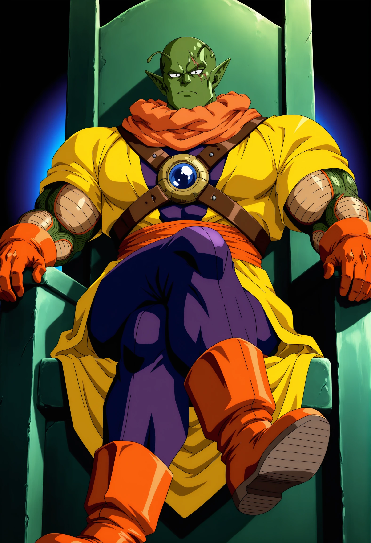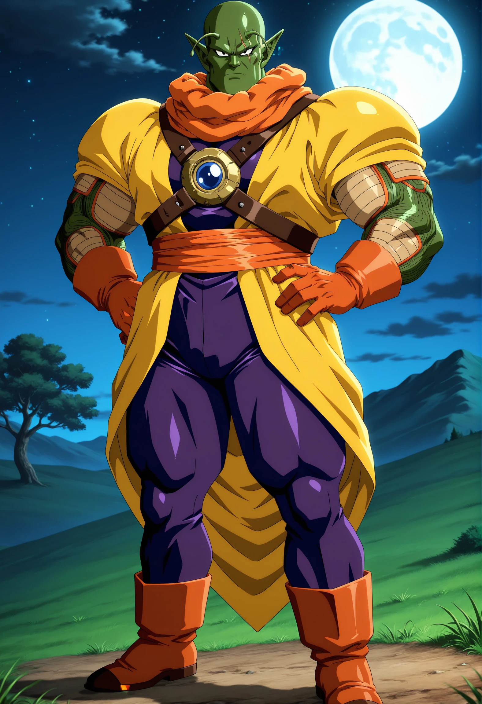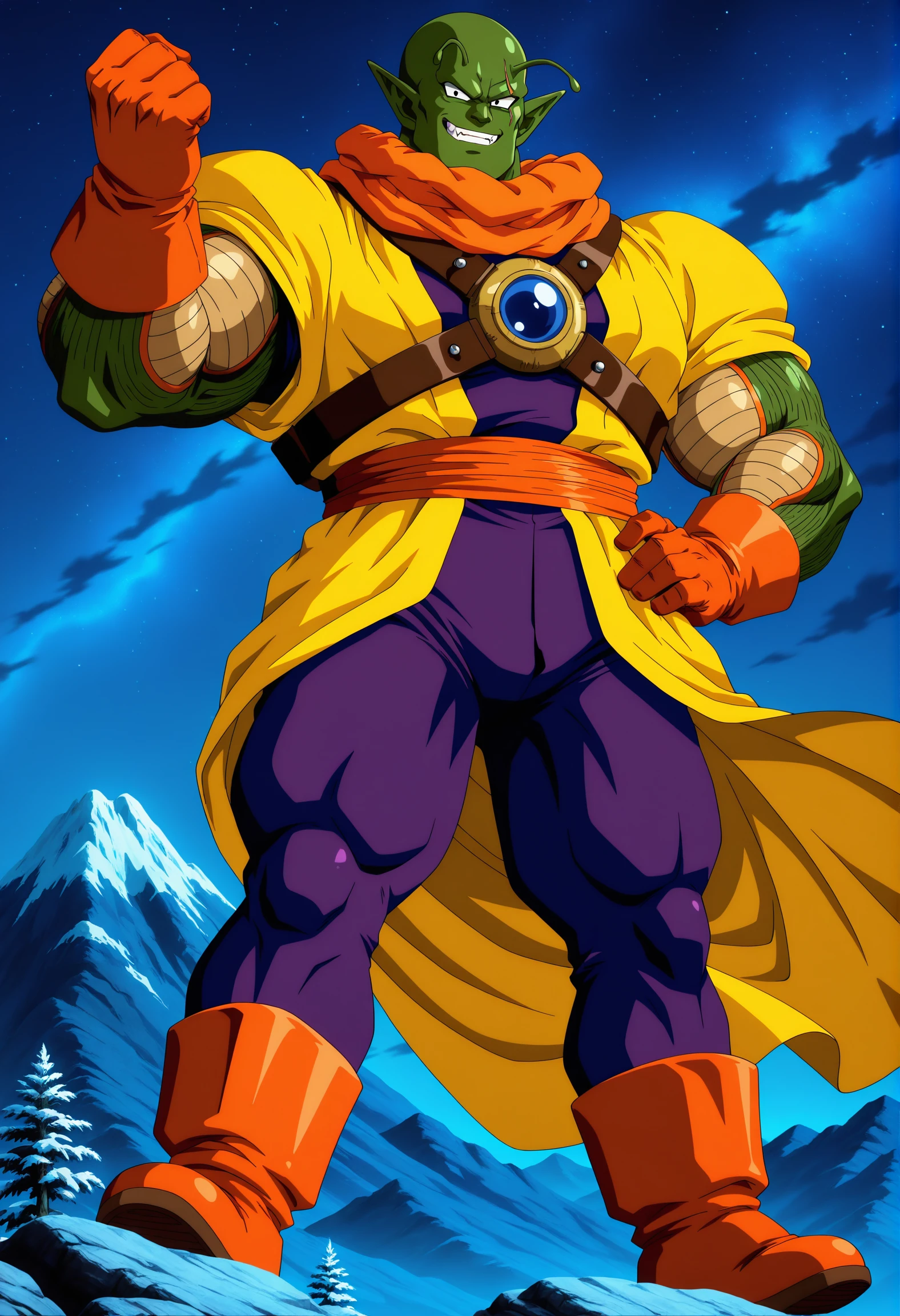orange scarf,yellow outerwear,purple tight-fitting clothes,long sleeves,orange gloves,purple trousers,chest belt,blue protective gear,orange sash,orange boots with grey soles,