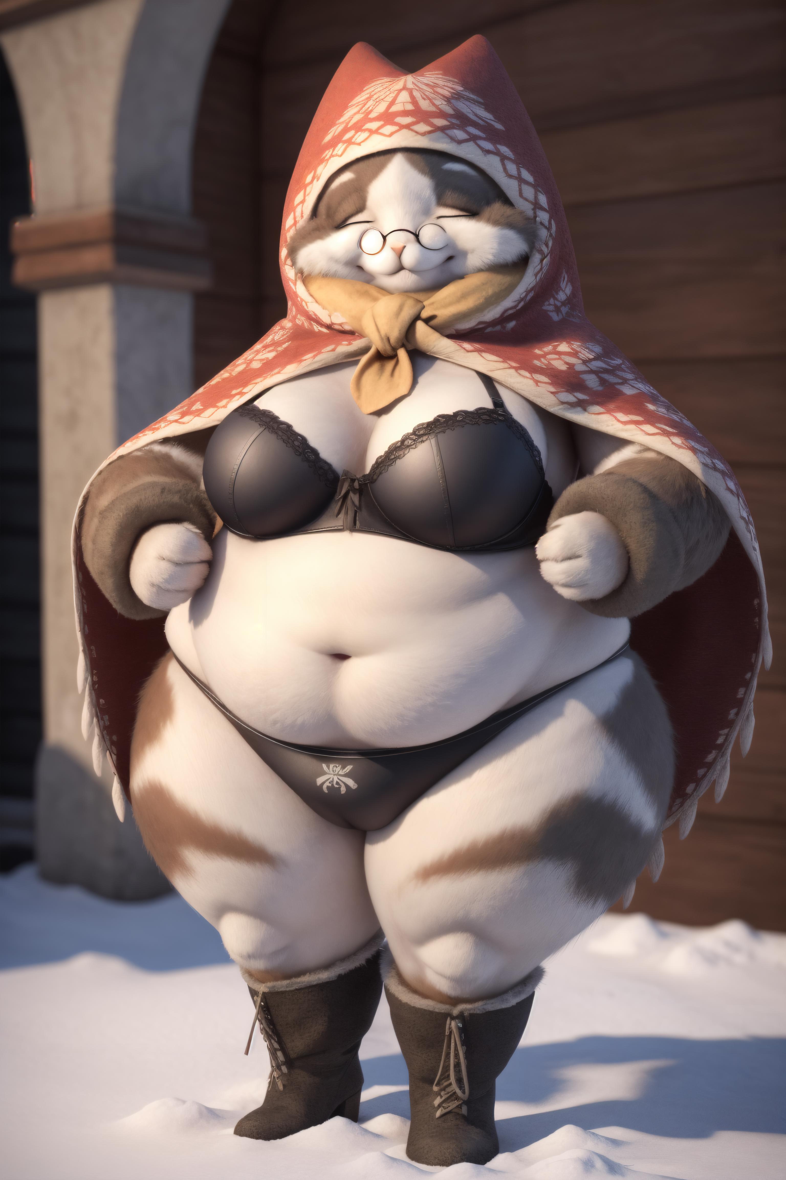 elderly, female, cat, thick coat, apron, headscarf, neck scarf, glasses