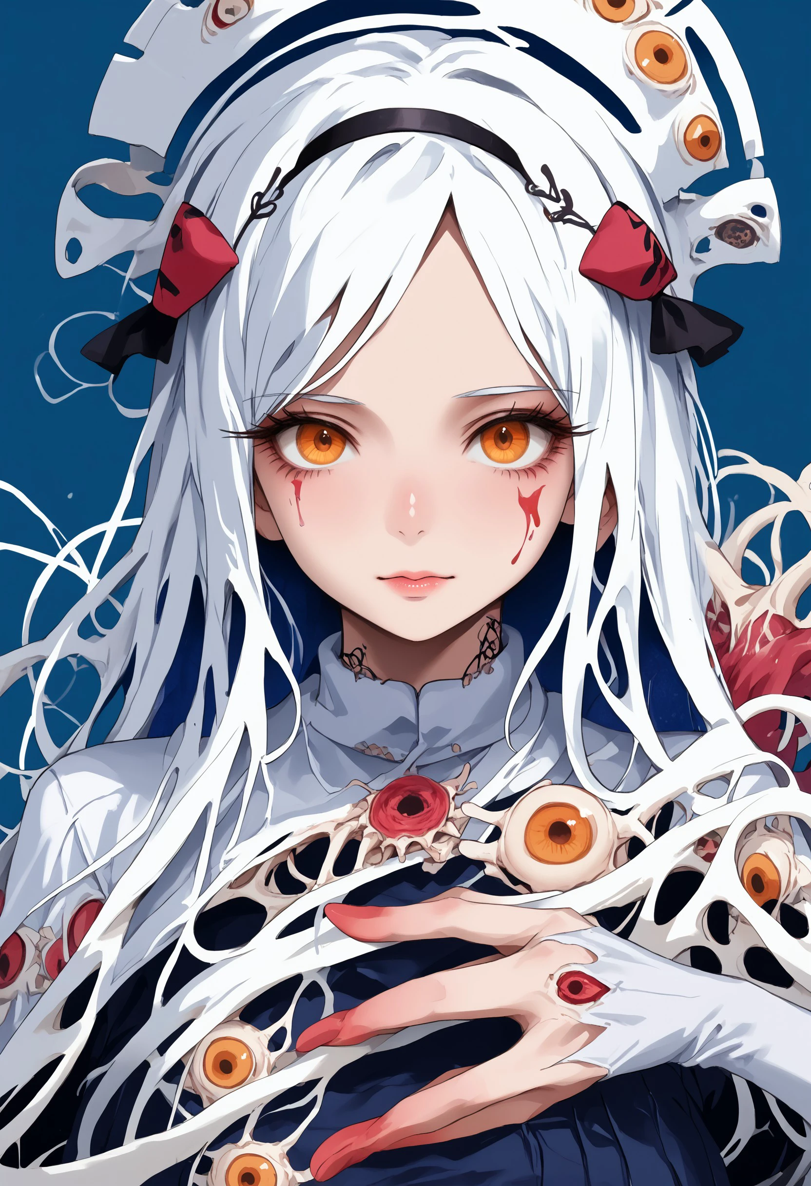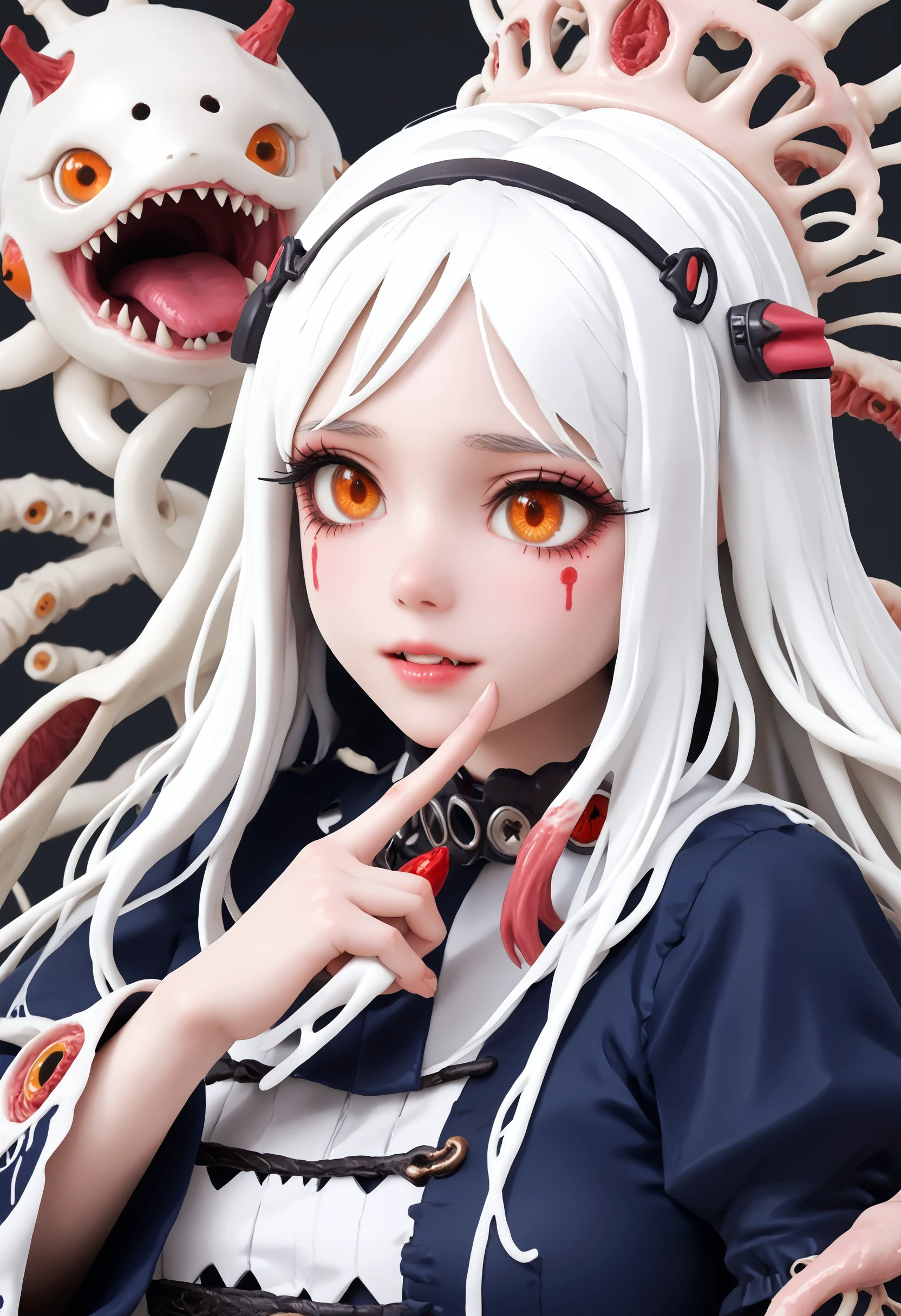 Unofficial made as a joke: c0smic/h0rr0r, white skin, white hair, albino, 1monster girl, white hair, thighhighs, feet out of frame, long sleeves, multiple eyes coming out of hair, mouth with teeth coming out of hair, a mouth opens in the hair,