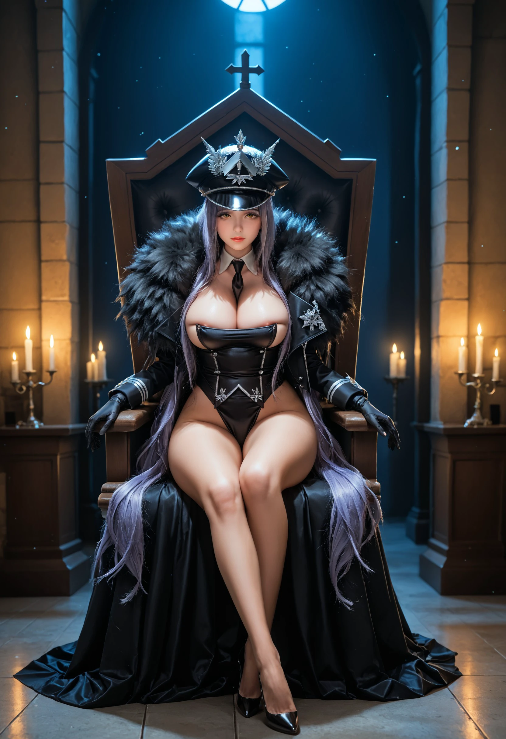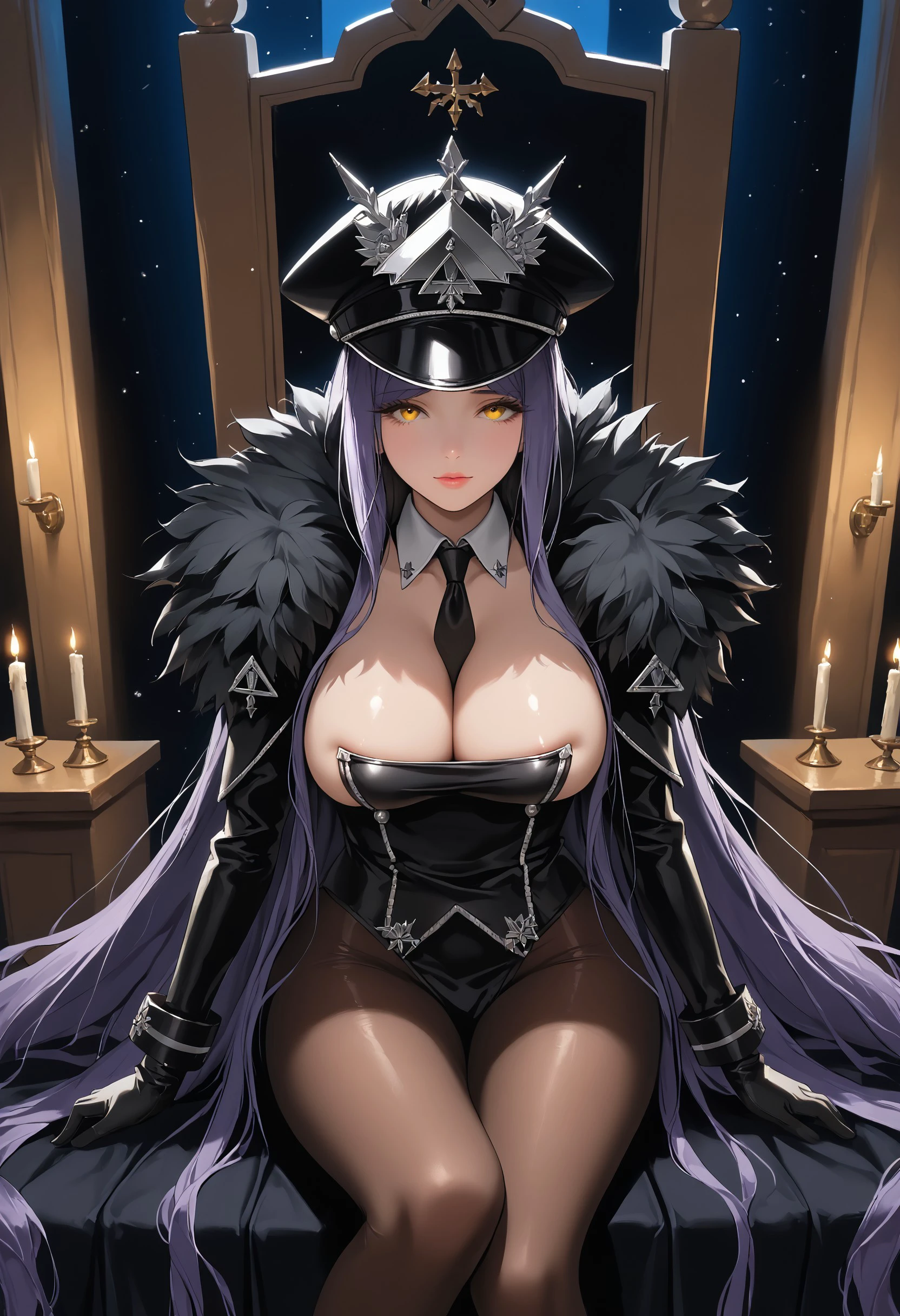 Overdosed on Master: mob1ackl1l1th, necktie between breasts, holding whip, gloves, fur trim, military hat, necktie, peaked cap, Bodystocking, (you usually don't need to add yellow eyes for this one)