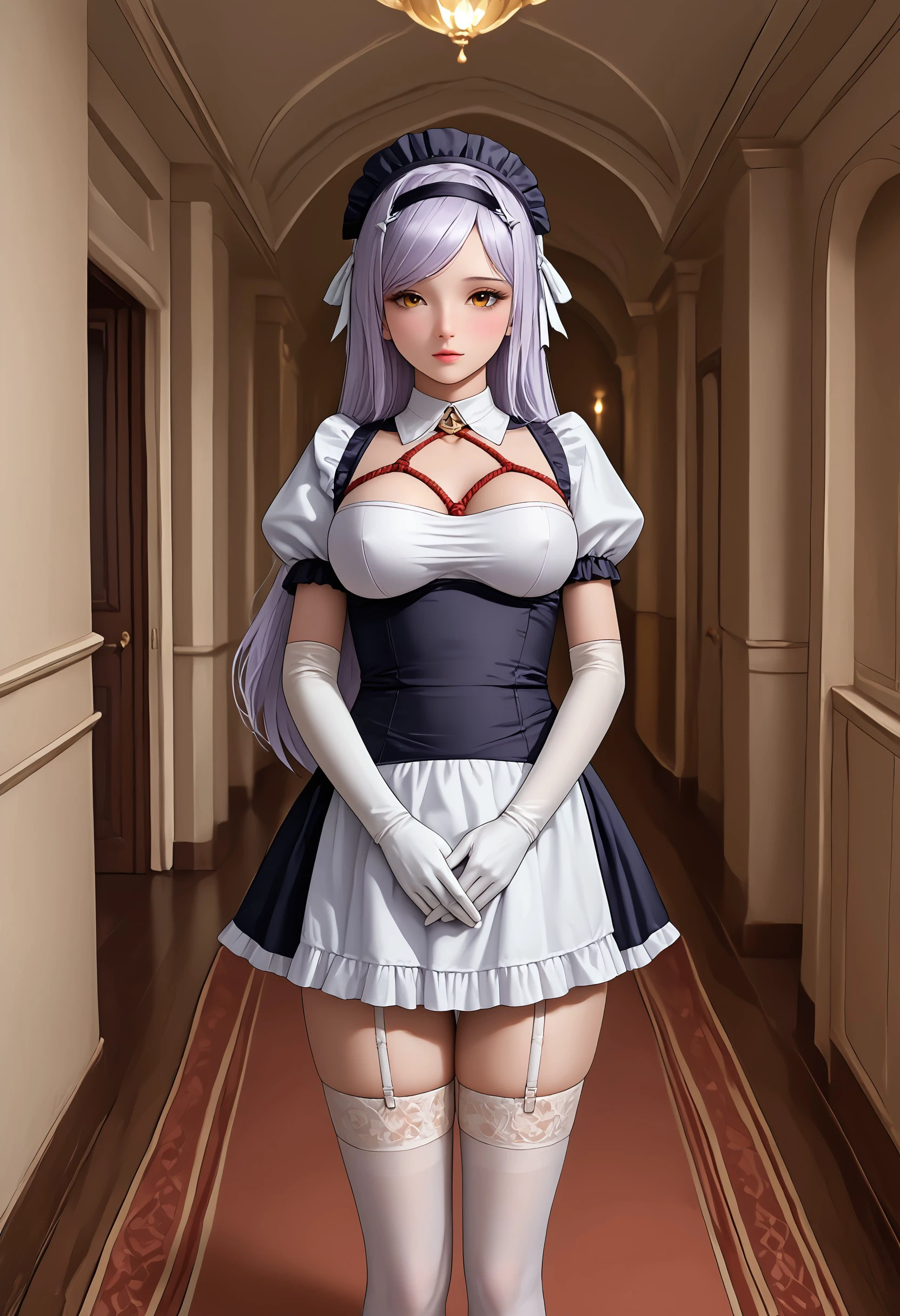Seducing Maid: b1ackl1l1th_mad, yellow eyes, thighhighs, gloves, high heels, elbow gloves, maid headdress, shibari, maid dress