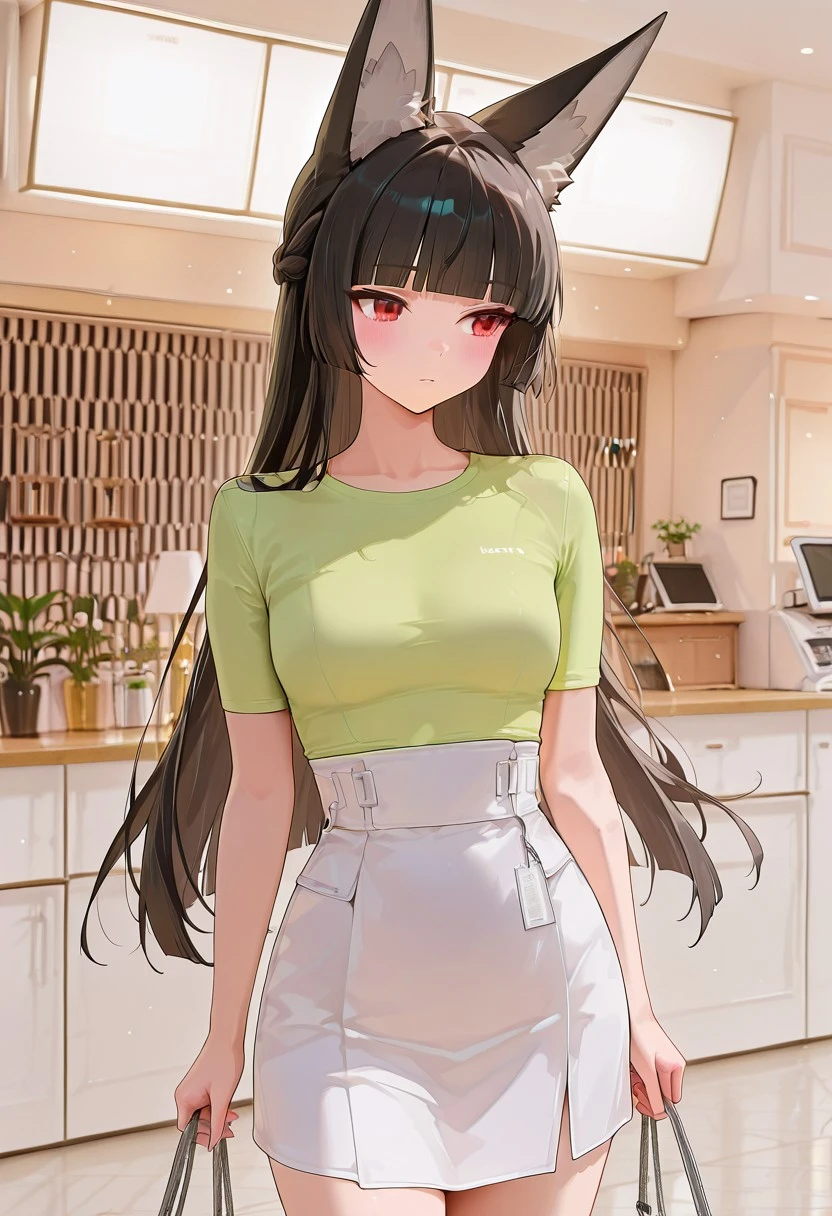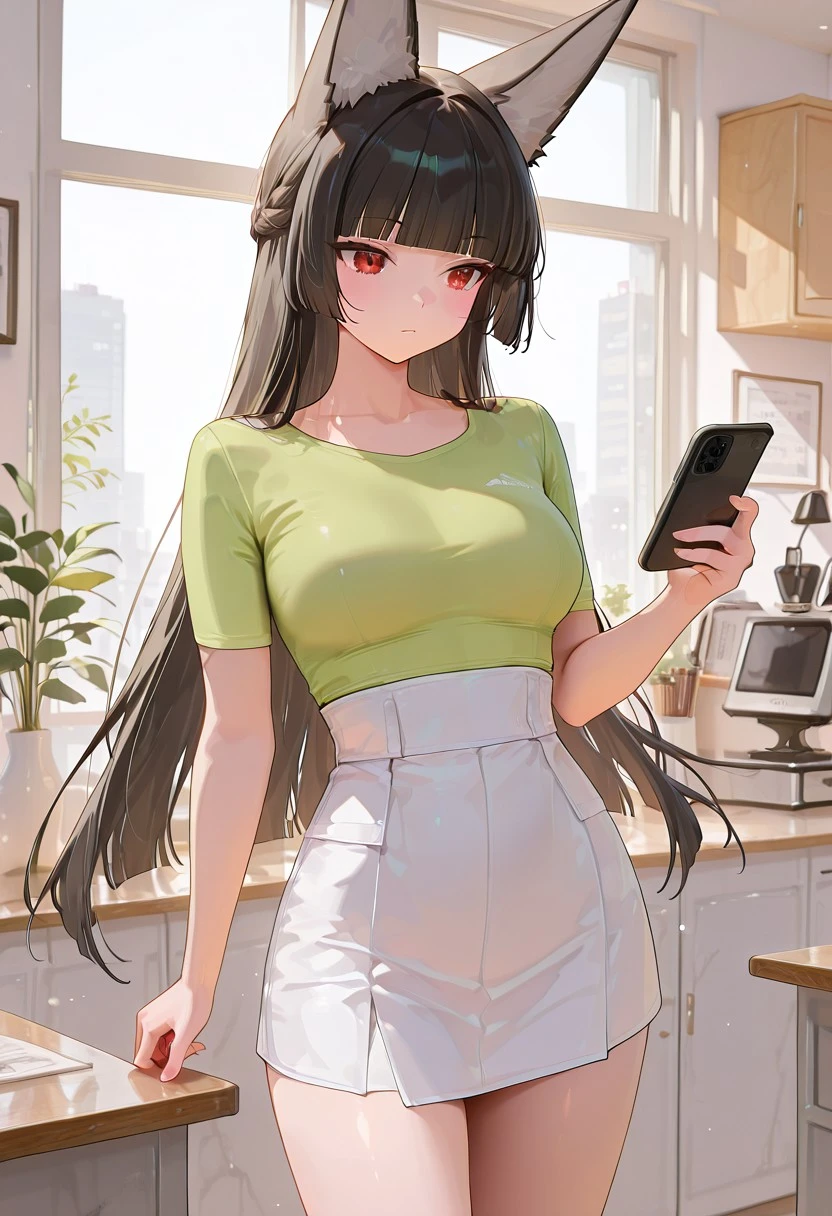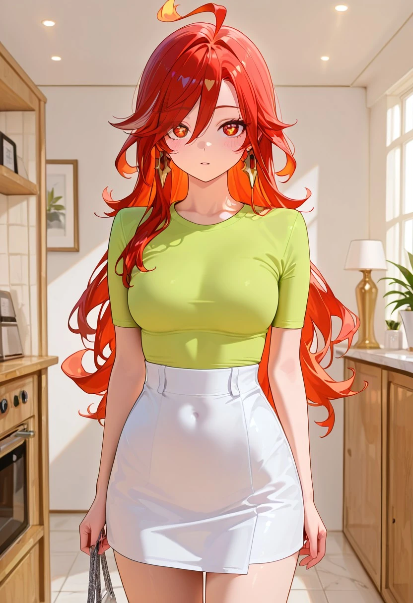 green top, tight top, short sleeves, round neckline, white high waisted skirt, mini skirt, asymmetrical skirt, wrap skirt,